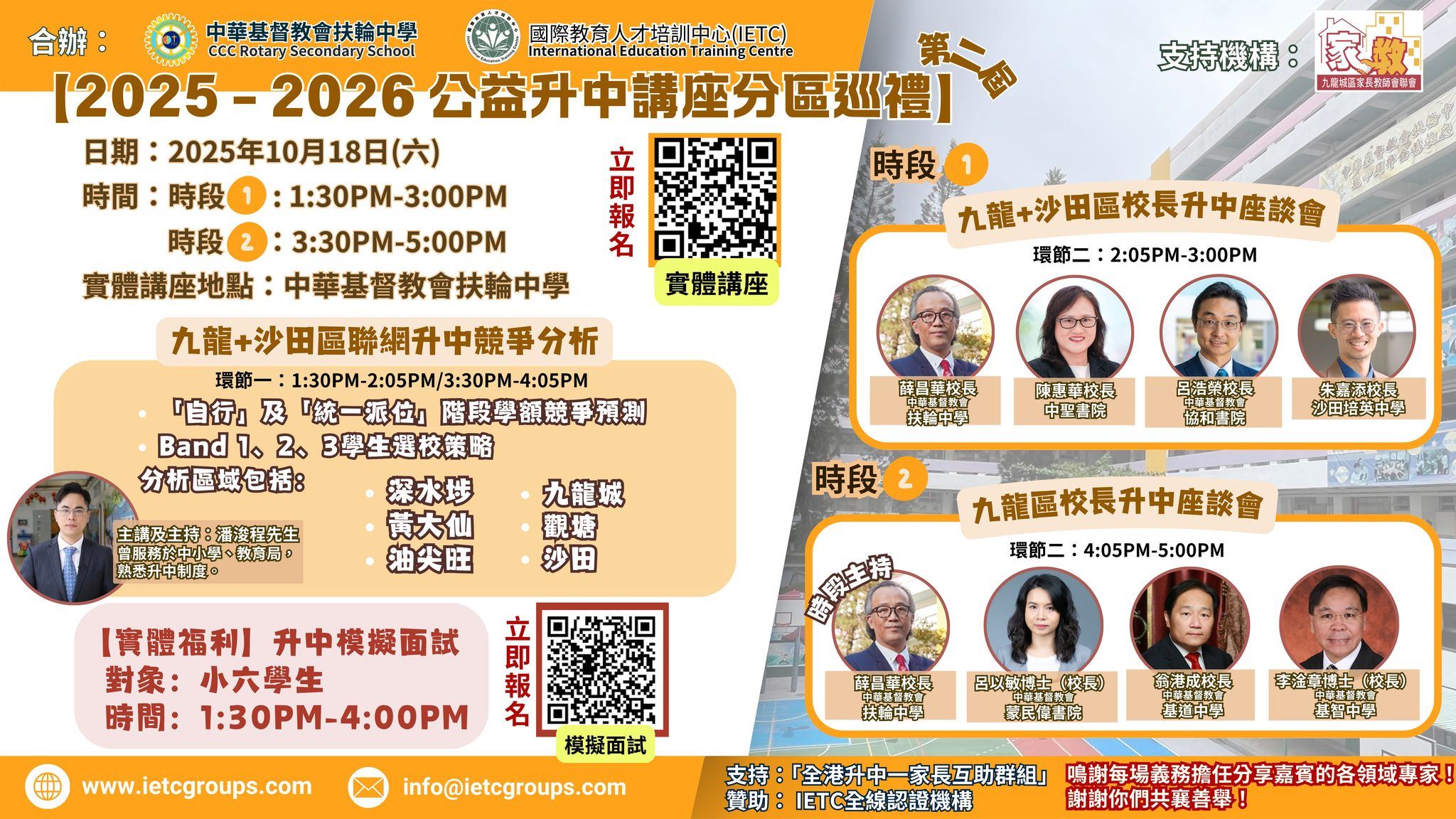 日期:2025年4月12日(星期六) 時間:8:45PM-10:45PM 主講:潘浚程先生(曾服務於中小學、教育局,熟悉升中制度。) 嘉賓:中華基督教會基智中學校長 李淦章博士 公開環節:Zoom + YouTube 閉門環節:只在Zoom進行