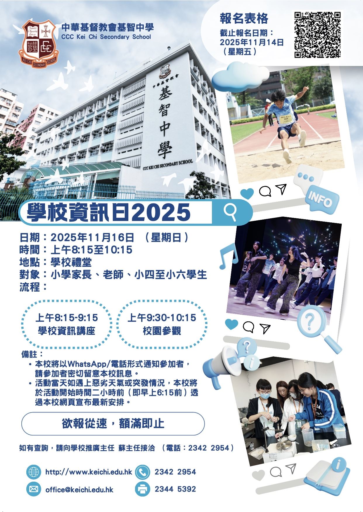 為讓同區小學於中一自行分配學位申請階段前能了解本校,本校將舉行「學校資訊日2025」。屆時,將有學校資訊講座及校園參觀環節,讓學生及家長進一步認識本校校園生活及學習環境。 活動詳情 日期:2025年11月16日 (日) 時間:上午8:15-10:15 地點:學校禮堂 活動對象:小學家長、老師、小四至小六學生 報名連結:https://forms.gle/PK4HbD8KJEyWQA696 備註 - 本校將以WhatsApp / 電話形式通知參加者,請參加者密切留意本校訊息。 - 活動當天如遇上惡劣天氣或突發情況 ,本校將於活動開始時間二小時前(即早上6:15前)透過本校網頁宣布最新決定。 欲報從速,額滿即止!