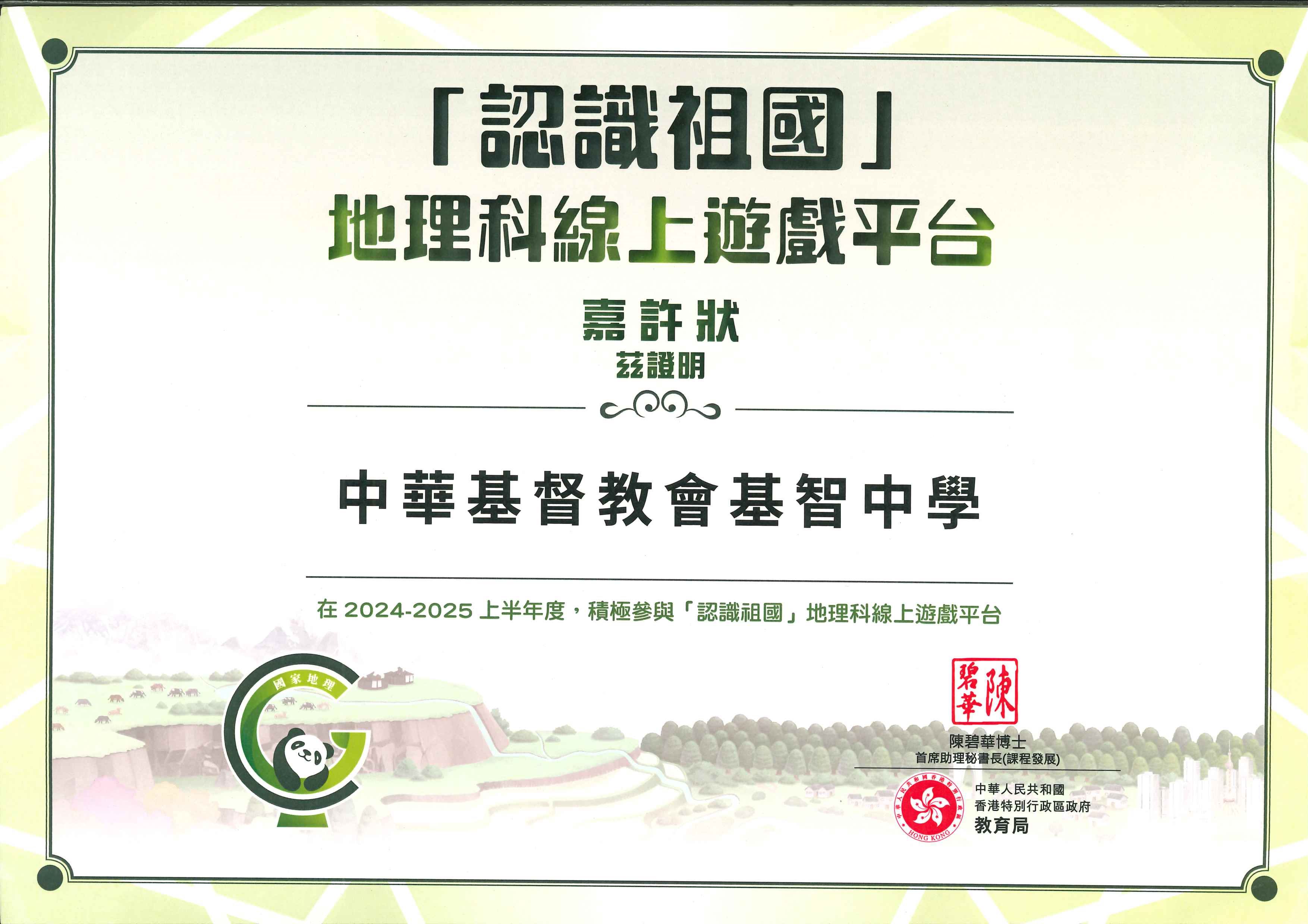 本校同學積極參與「『認識祖國』地理科線上遊戲平台」,以提升對國家地理的認識,加強國民身分認同及民族自豪感。教育局特此頒發嘉許狀,予以表揚。此外,教育局為了嘉許成績優異的學生,分數最高的學生除了可獲得嘉許狀外,更可獲得海洋公園門票兩張,以作獎勵。 本校共37位同學獲得嘉許狀,其中14位同時獲得嘉許狀及海洋公園門票。恭喜所有得獎的同學!