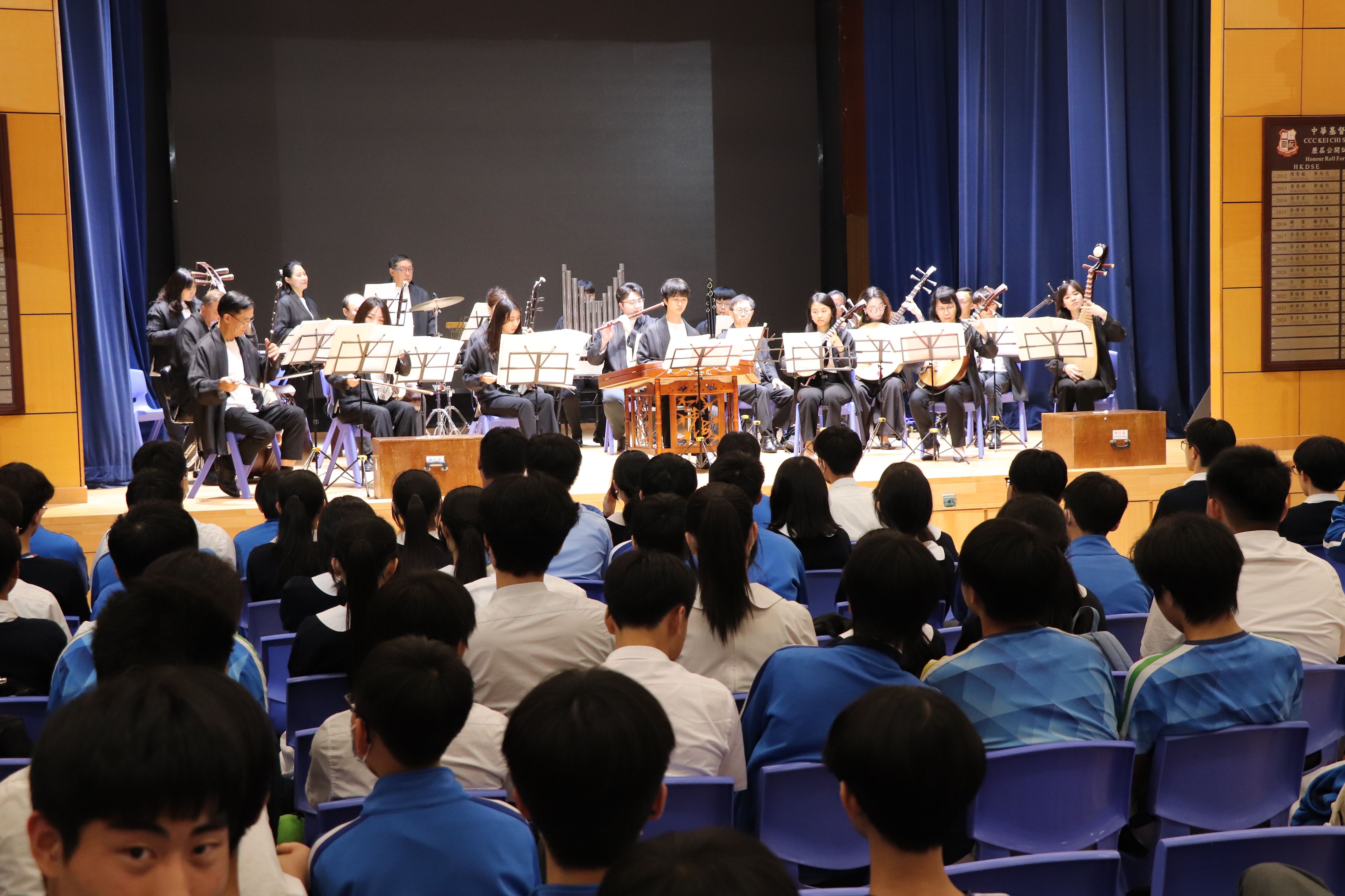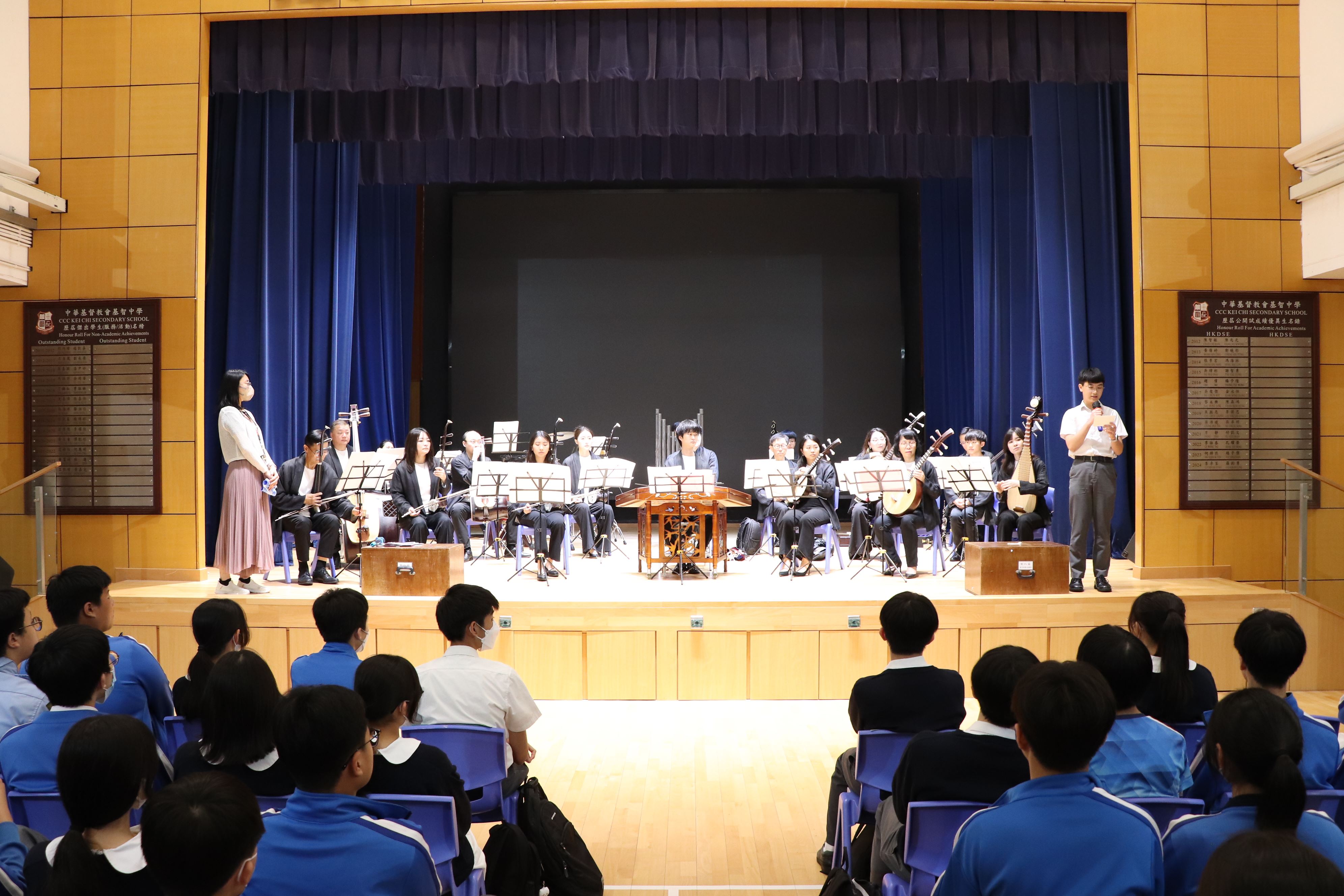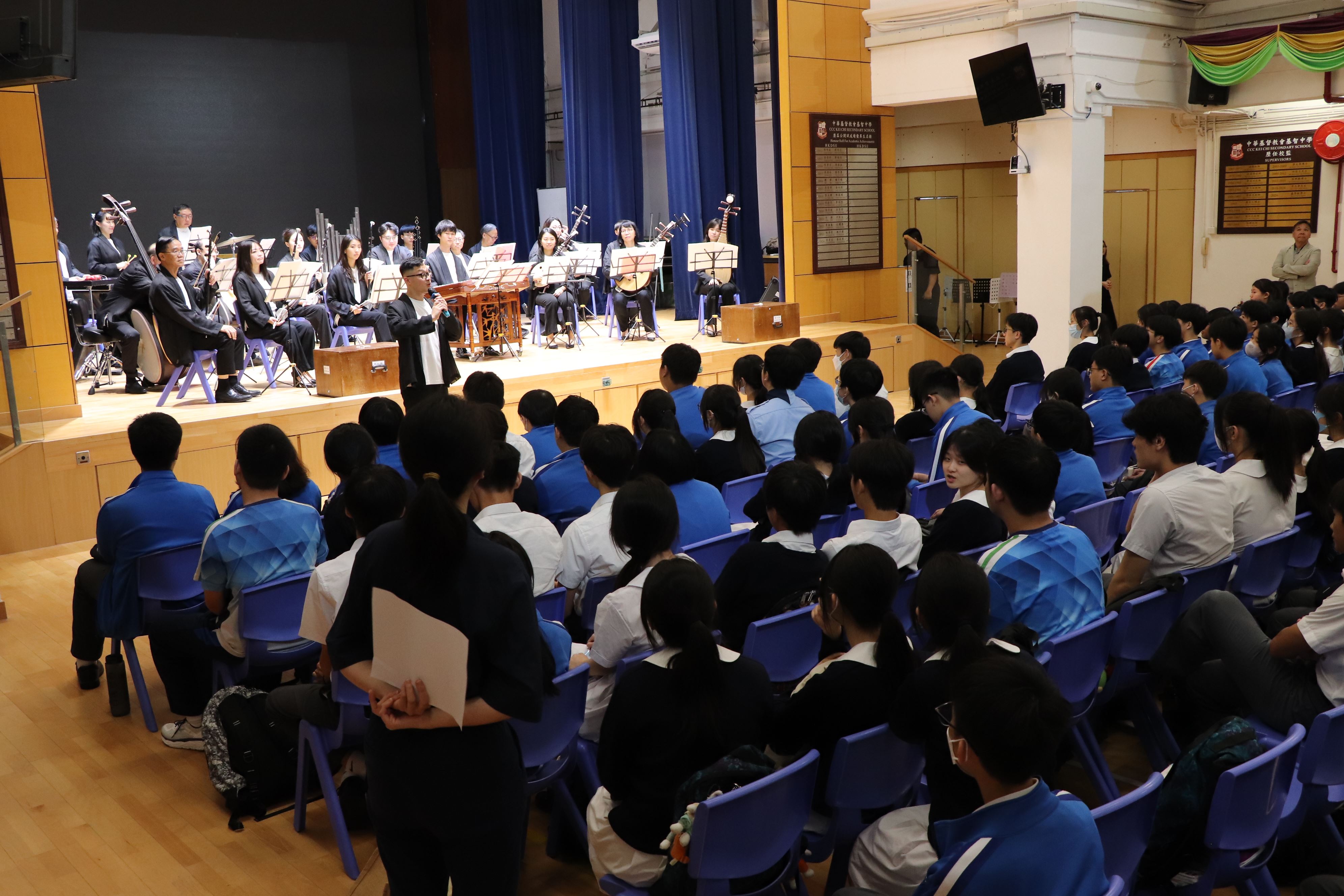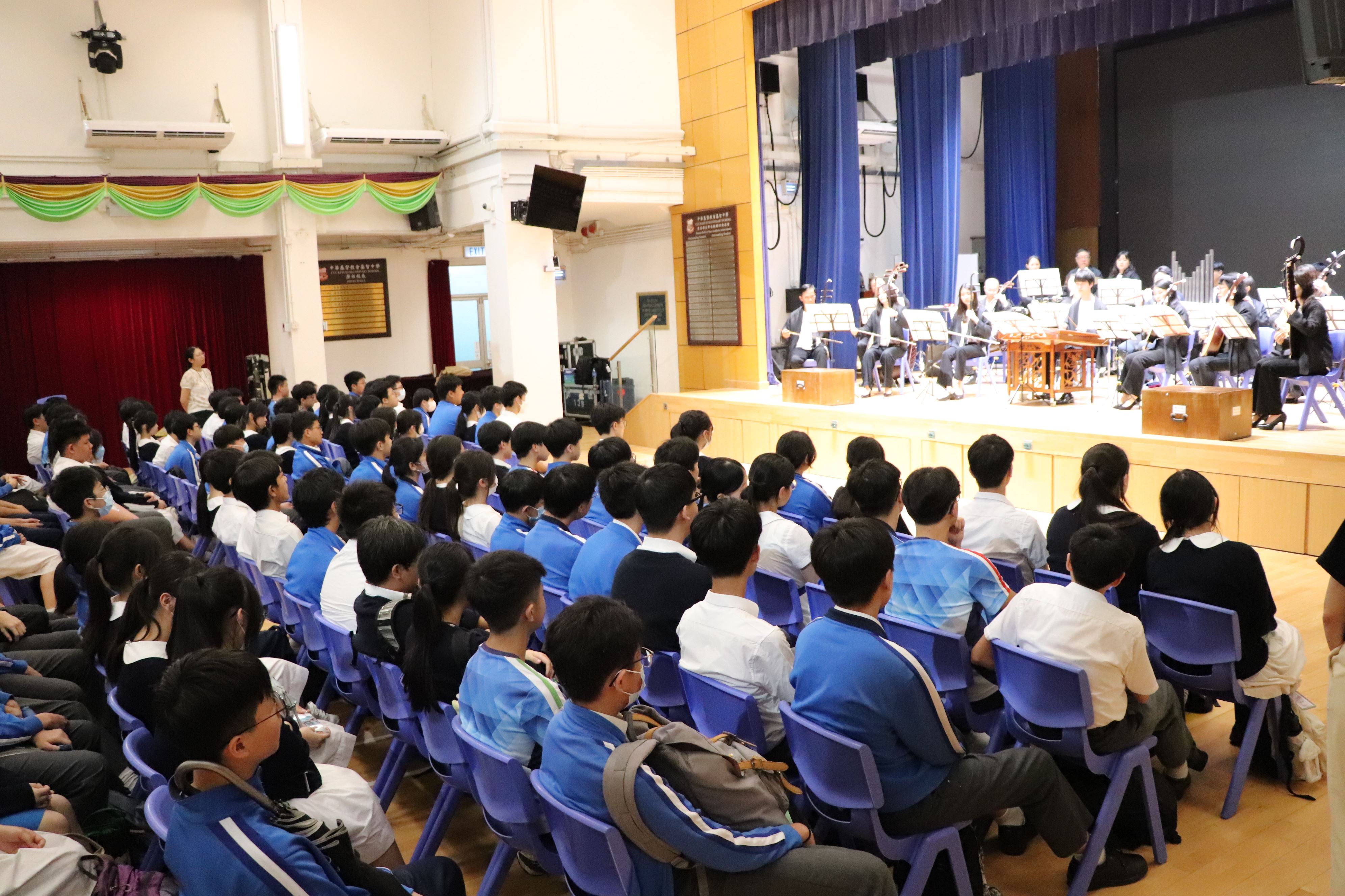 為了讓學生認識中華文化及學習中國音樂,本校音樂科安排了中二及中三同學參加香港中樂團的到校音樂會。在音樂會中,香港中樂團除了會為同學們演奏輕快和具代表性的中樂作品外,還為同學介紹中樂吹、彈、拉、打家族的樂器和各樂器特色。