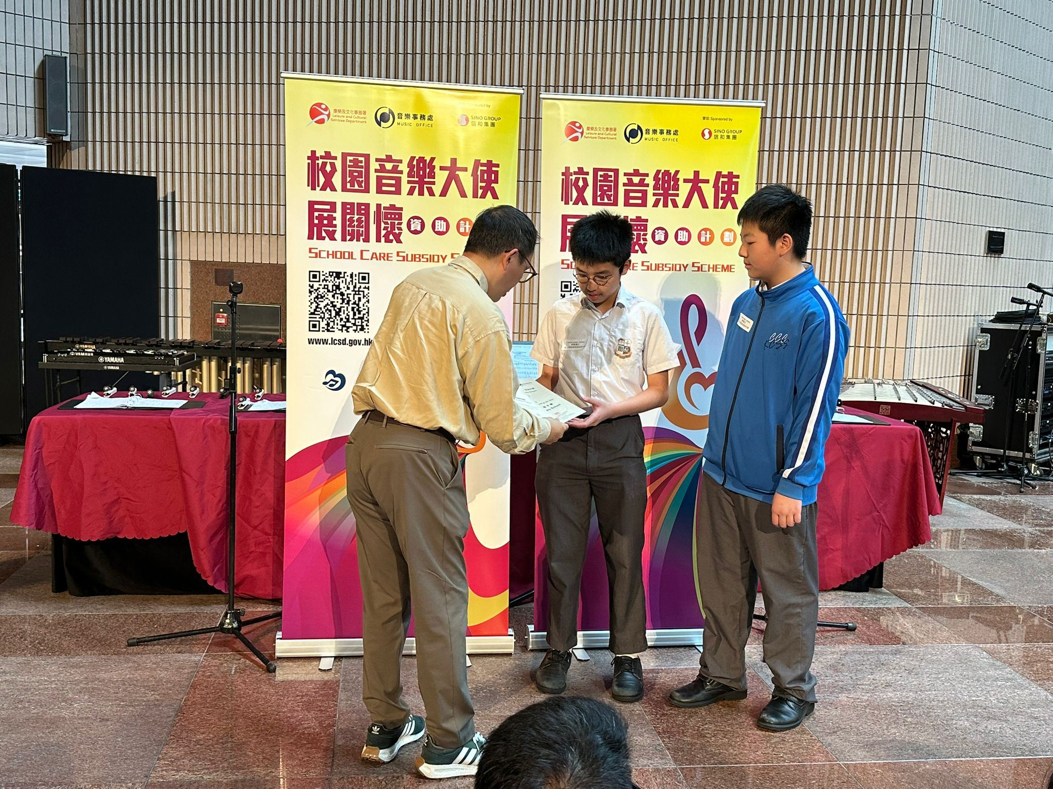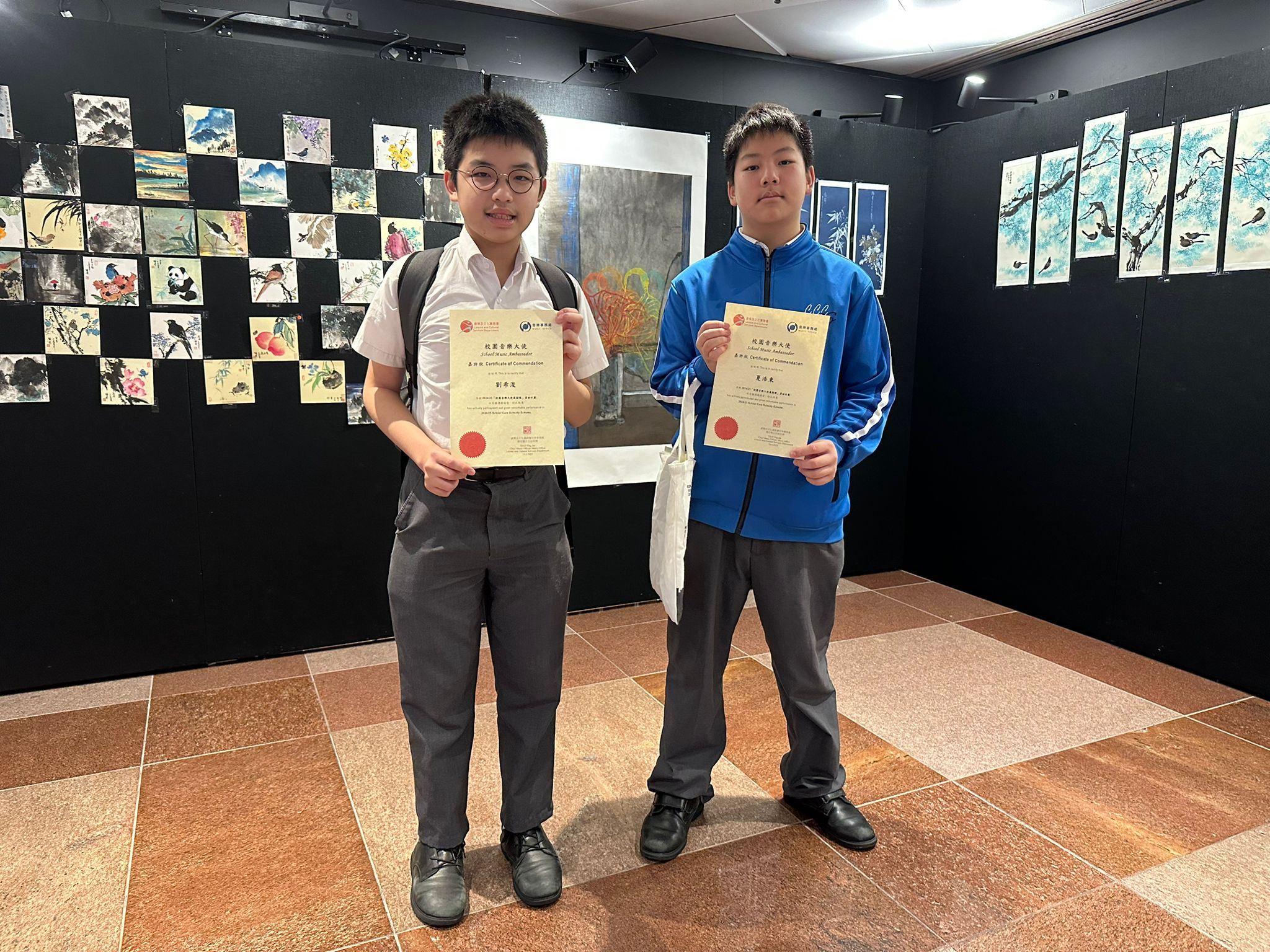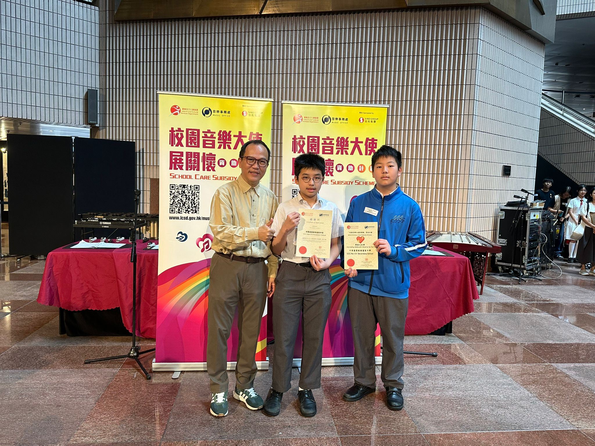 本校早前參加由康樂及文化事務署音樂事務處主辦的「校園音樂大使展關懷」計劃 ,於長者中心舉辦「關懷音樂會」,透過不同宣傳渠道分享活動經驗,獲得「傳愛大使獎」及感謝狀。該獎項於2025年5月10日在香港文化中心舉行的「校園音樂大使展關懷」匯報音樂會暨頒獎典禮上頒發 ,由1A夏浩東及4D劉希浚同學代表領獎。