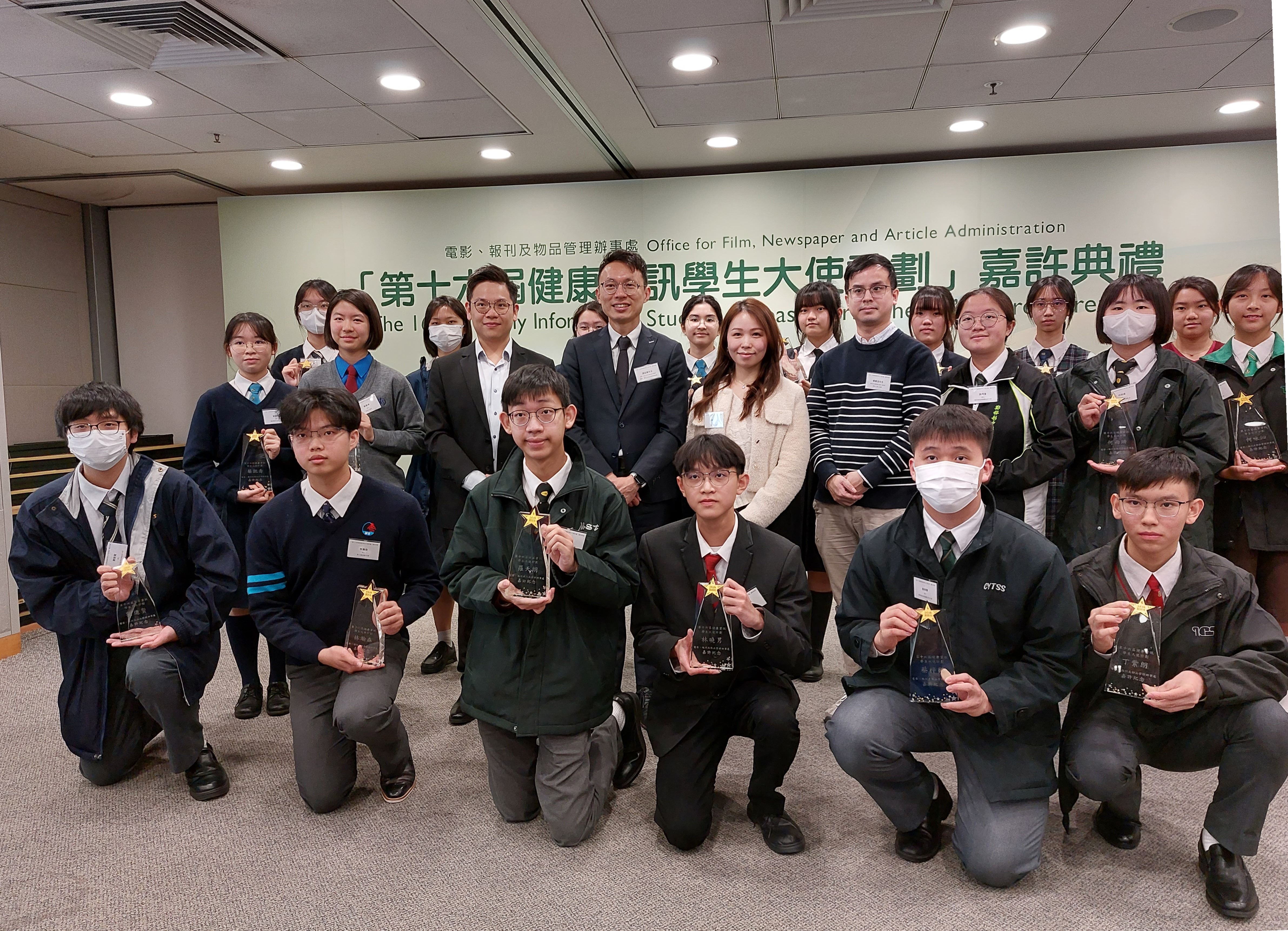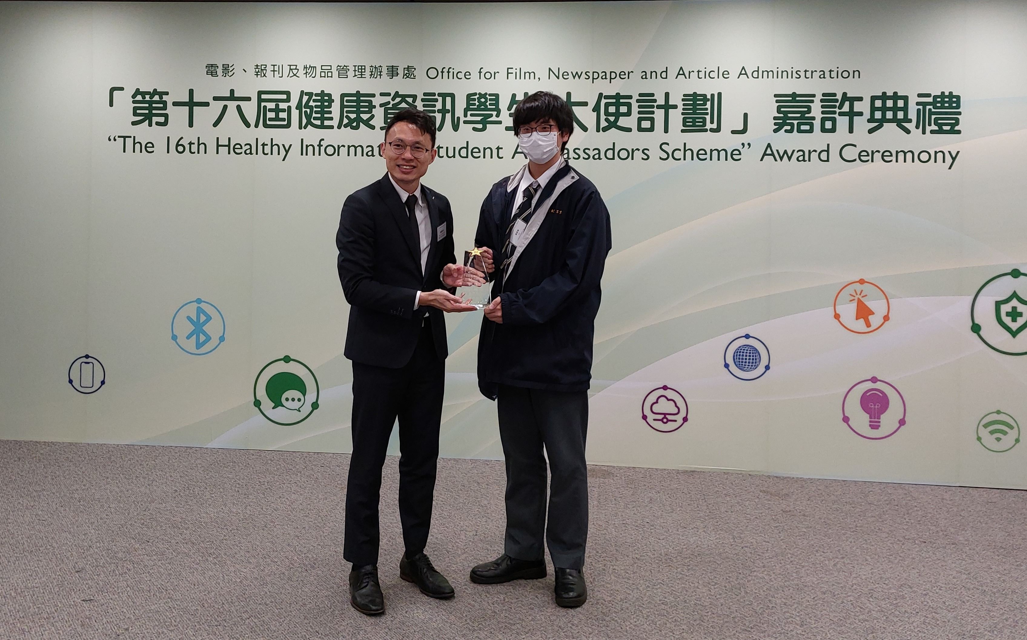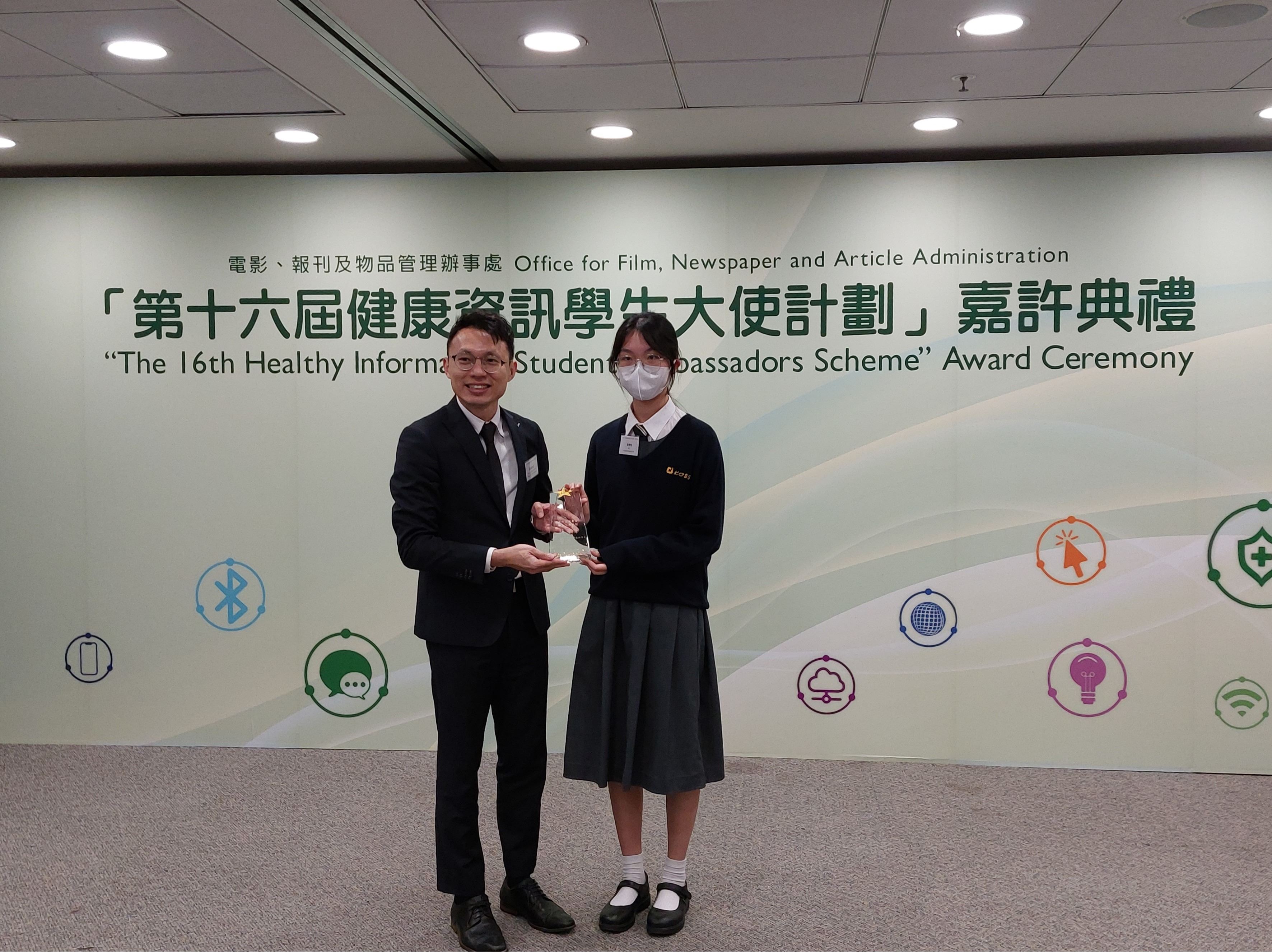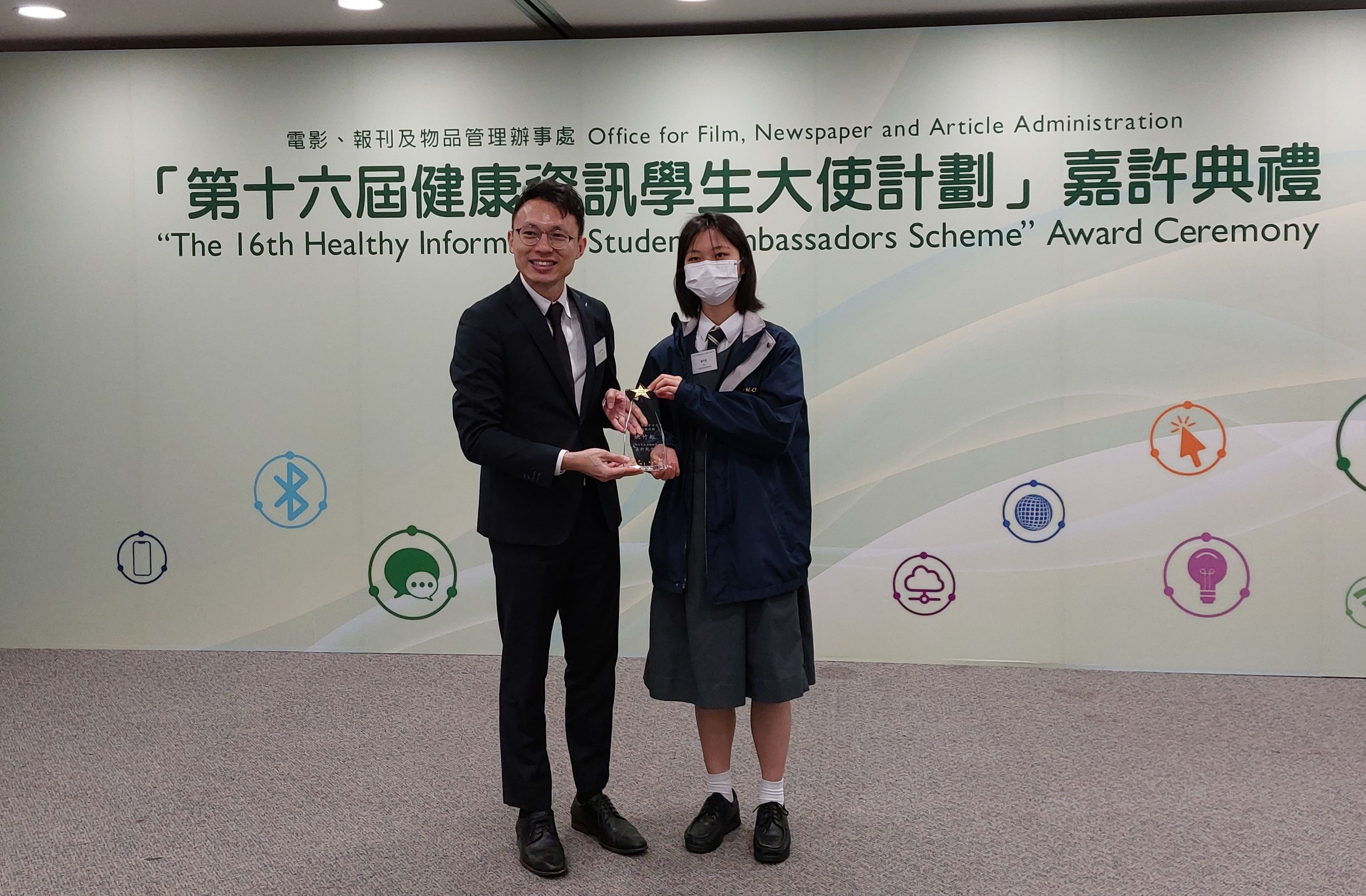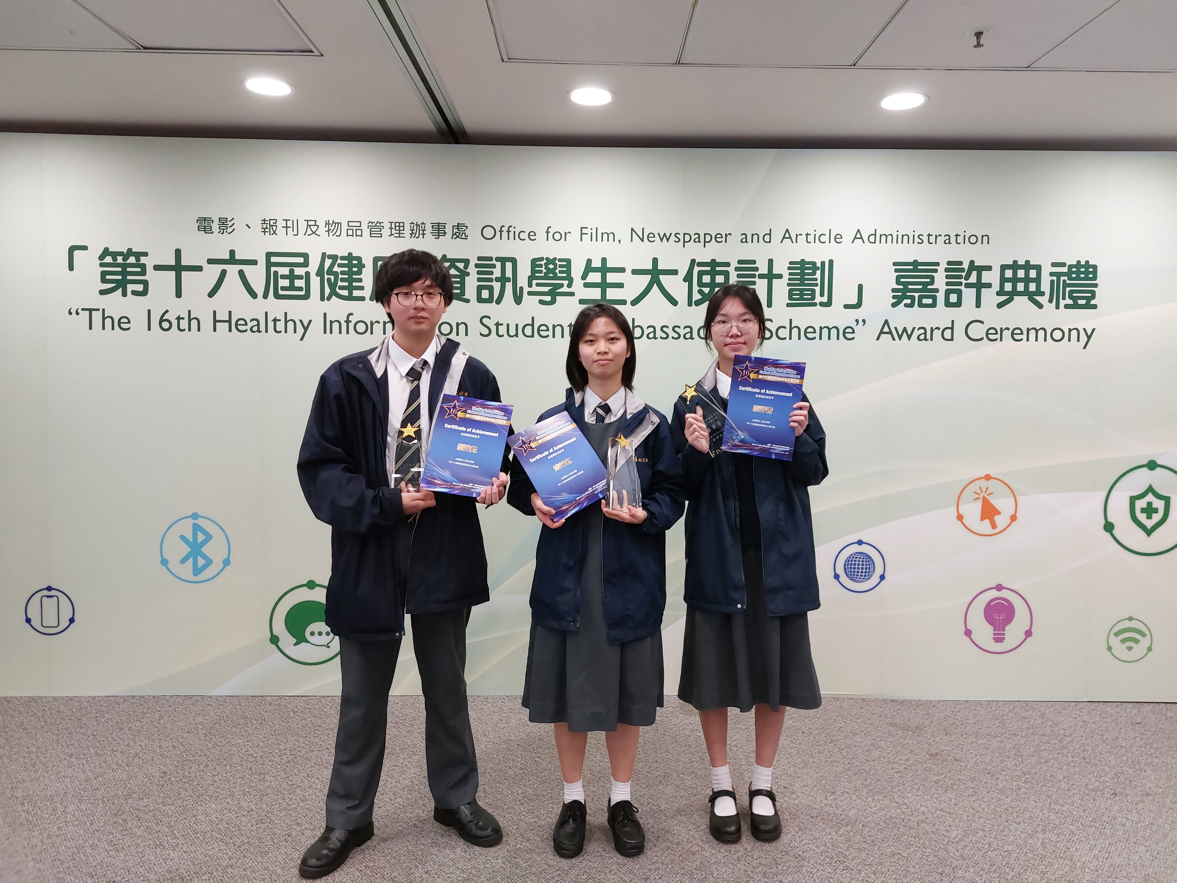 本校學生早前參加了由政府電影、報刊及物品管理辦事處舉辦的第十六屆健康資訊學生大使計劃,恭喜5C 蔡菁菁5D劉進賢、姚竹虹同學獲頒卓越表現證書及獎座。