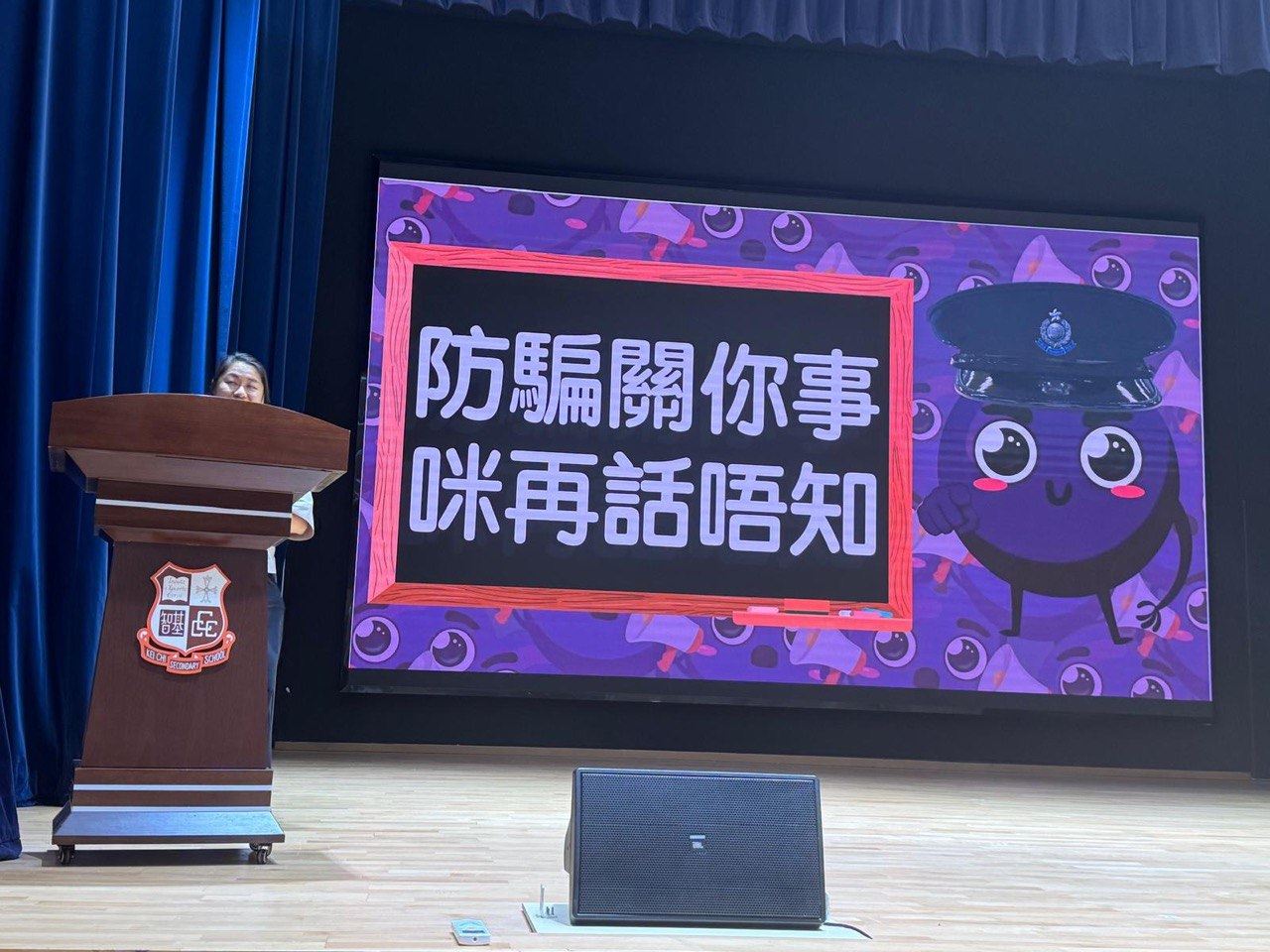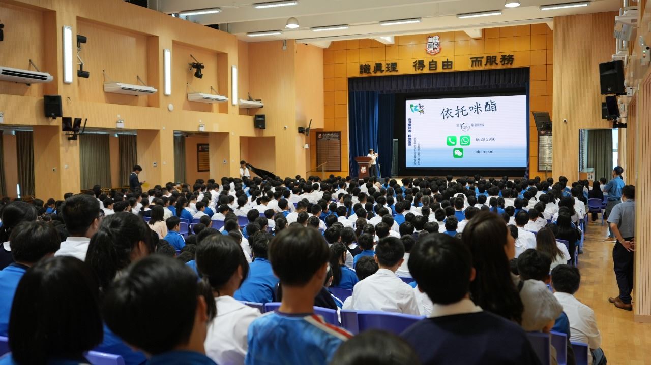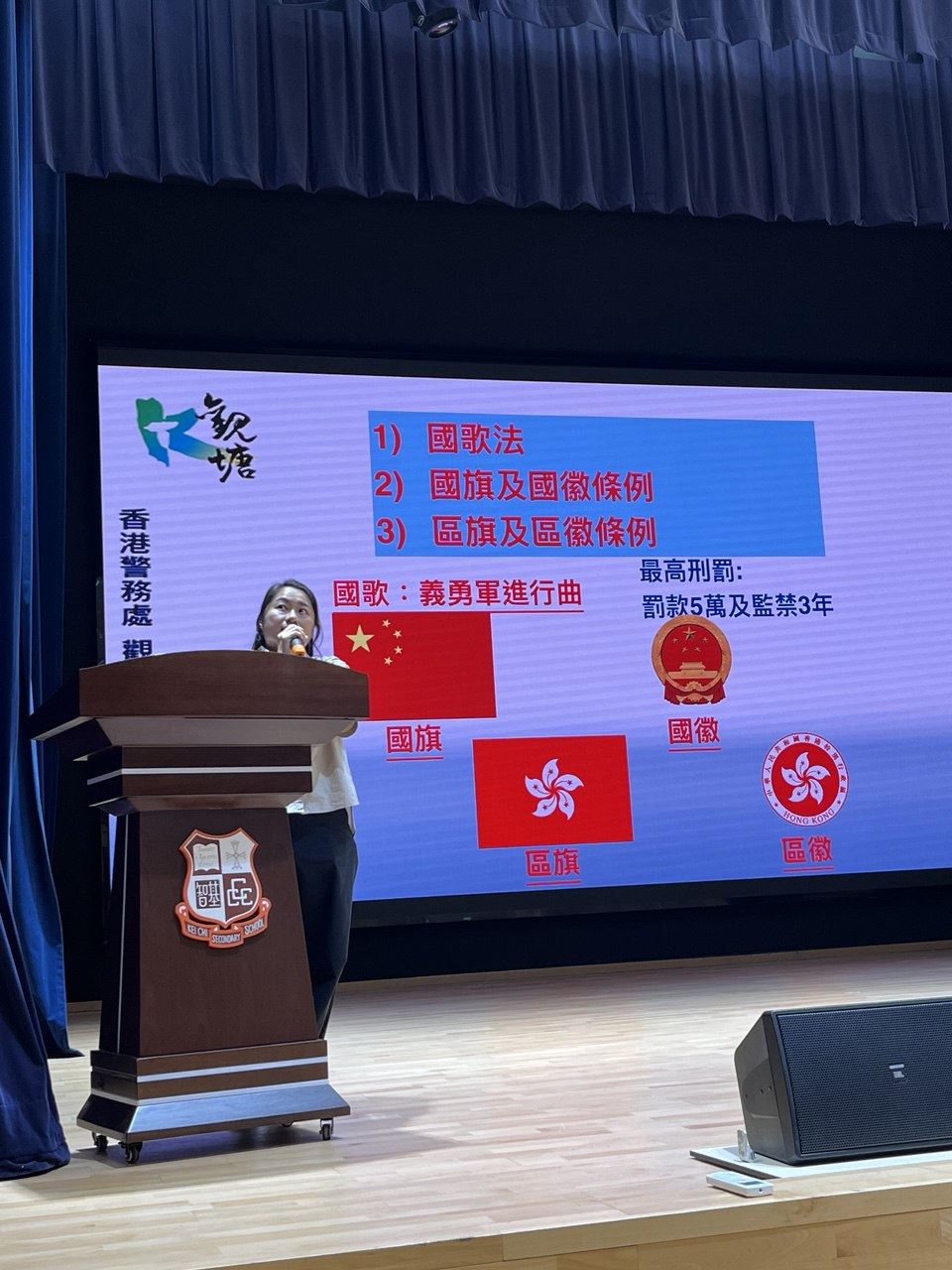 15/09/25 知情守法周會,訓育委員會邀請觀塘警區警民關係主任譚亦珊警長到校進行教育講座,分享有關依托咪酯、網絡騙案及國家安全的相關法例及刑罰,提高學生的守法意識。