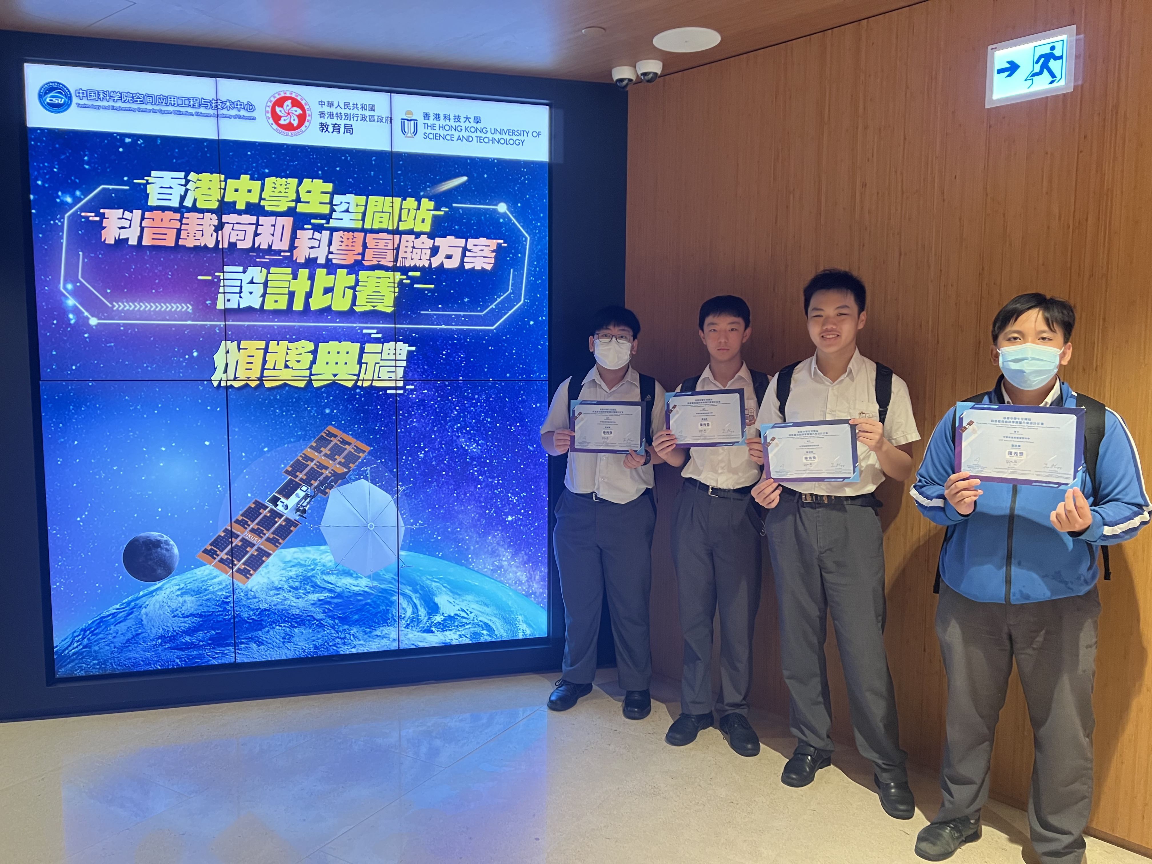 3A班鍾淯朗、賈政燁、劉浩暉、李卓譽代表科學科参加由香港科技大學舉辦的「香港中學生空間站科普載荷和科學實驗方案設計比賽」,獲得「優秀獎」,並於9月21日於香港科技大學出席頒獎典禮。祝賀以上同學,能展現出創意及科學探究精神,為校爭光。
