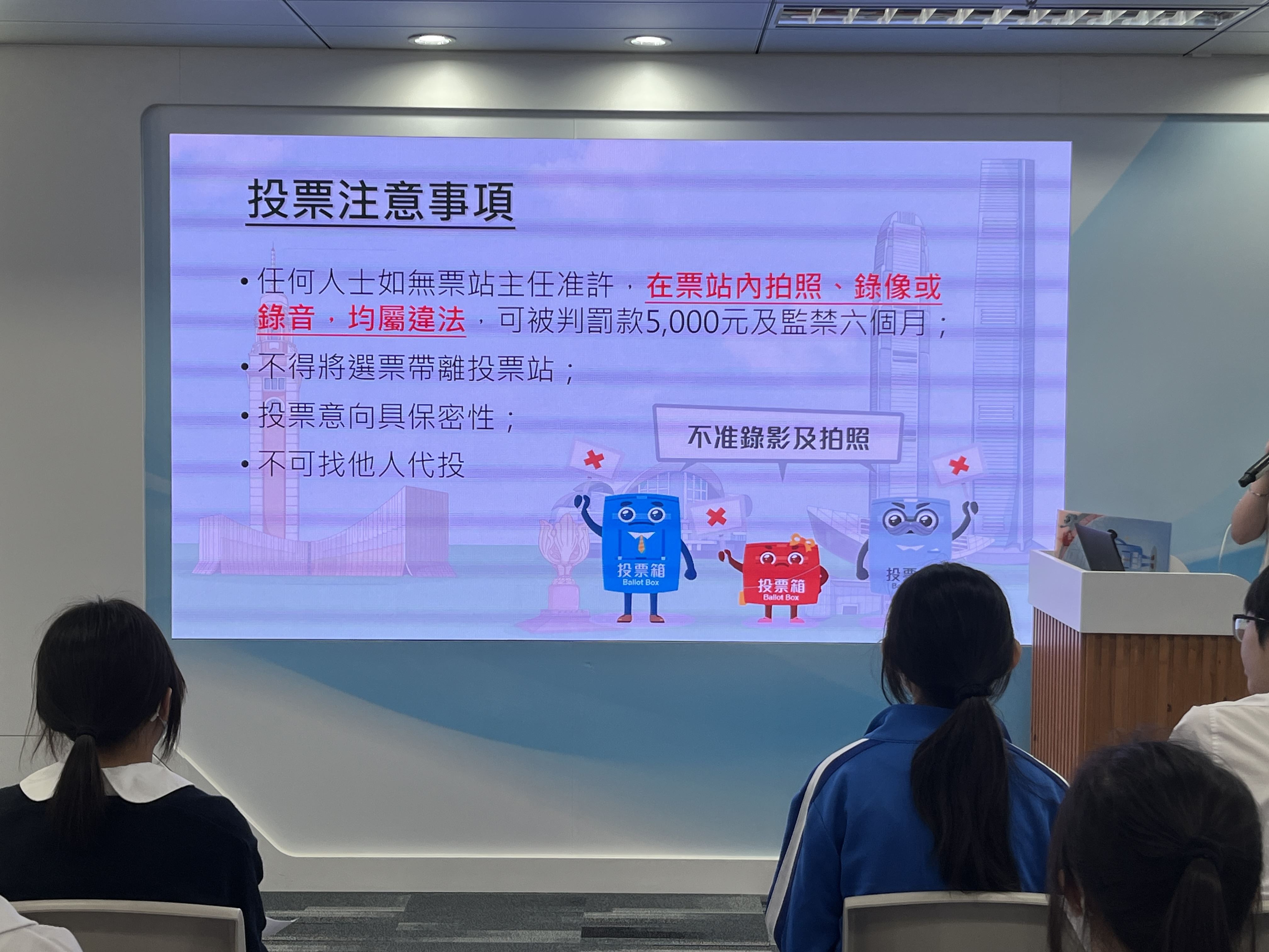 「選舉資訊中心」參觀活動 為加深同學對香港選舉制度的認識,本校公民、經濟與社會科與視覺藝術科合作,帶領中二學生前往參觀位於長沙灣的「選舉資訊中心」。活動內容豐富,同學首先參與了由選舉資訊中心職員主持的專題講座,深入淺出地認識香港的選舉制度及相關安排。講座過程中,設有互動環節及小組遊戲,激發同學思考,並鞏固所學知識。為讓同學親身體驗選舉流程,活動特設模擬投票環節。同學們在模擬發票櫃台使用電子選民登記冊領取選票,並於「模擬投票間」內進行投票。其後,同學們更參與了點票過程,全面了解投票與點票的具體操作,進一步體會公民參與的意義。 今年12月即將迎來立法會換屆選舉,期望是次活動讓同學深刻體會到,投票是公民社會的基石。一次公開、誠實和公平的選舉,對香港的政治穩定與社會發展至為重要。