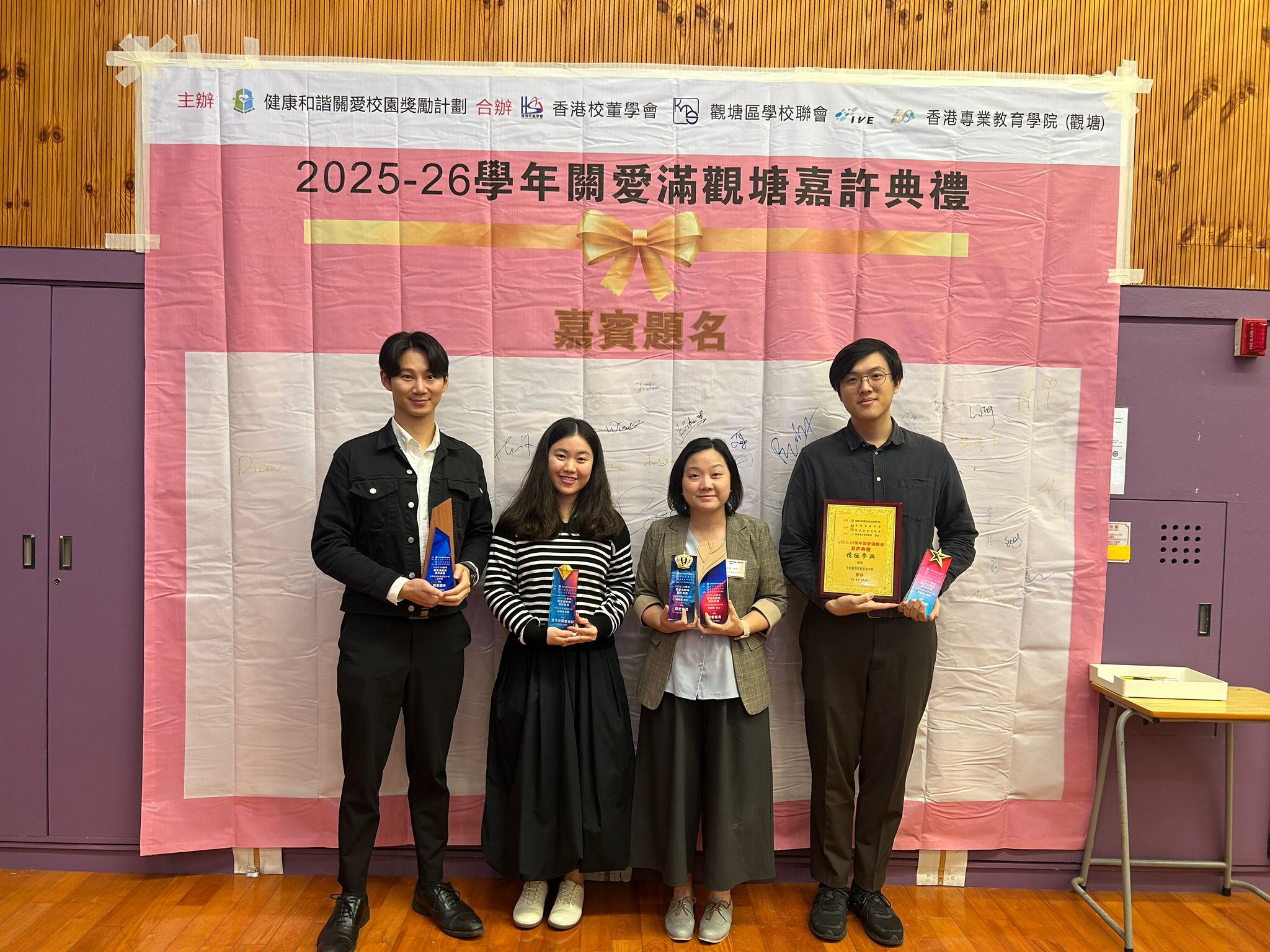 本校早前參加「關愛滿觀塘嘉許典禮」,獲頒發以下獎項:陳敏嘉老師獲「關愛校董」、廖頌雯女士獲「關愛家長」、洪晉民老師獲「關愛老師」、張鈺苑老師獲「全方位關愛老師」及合唱團獲「關愛團隊」(張炎傲老師代表);於2025年12月13日(星期六)出席關愛滿觀塘嘉許典禮,恭喜以上獲獎者。