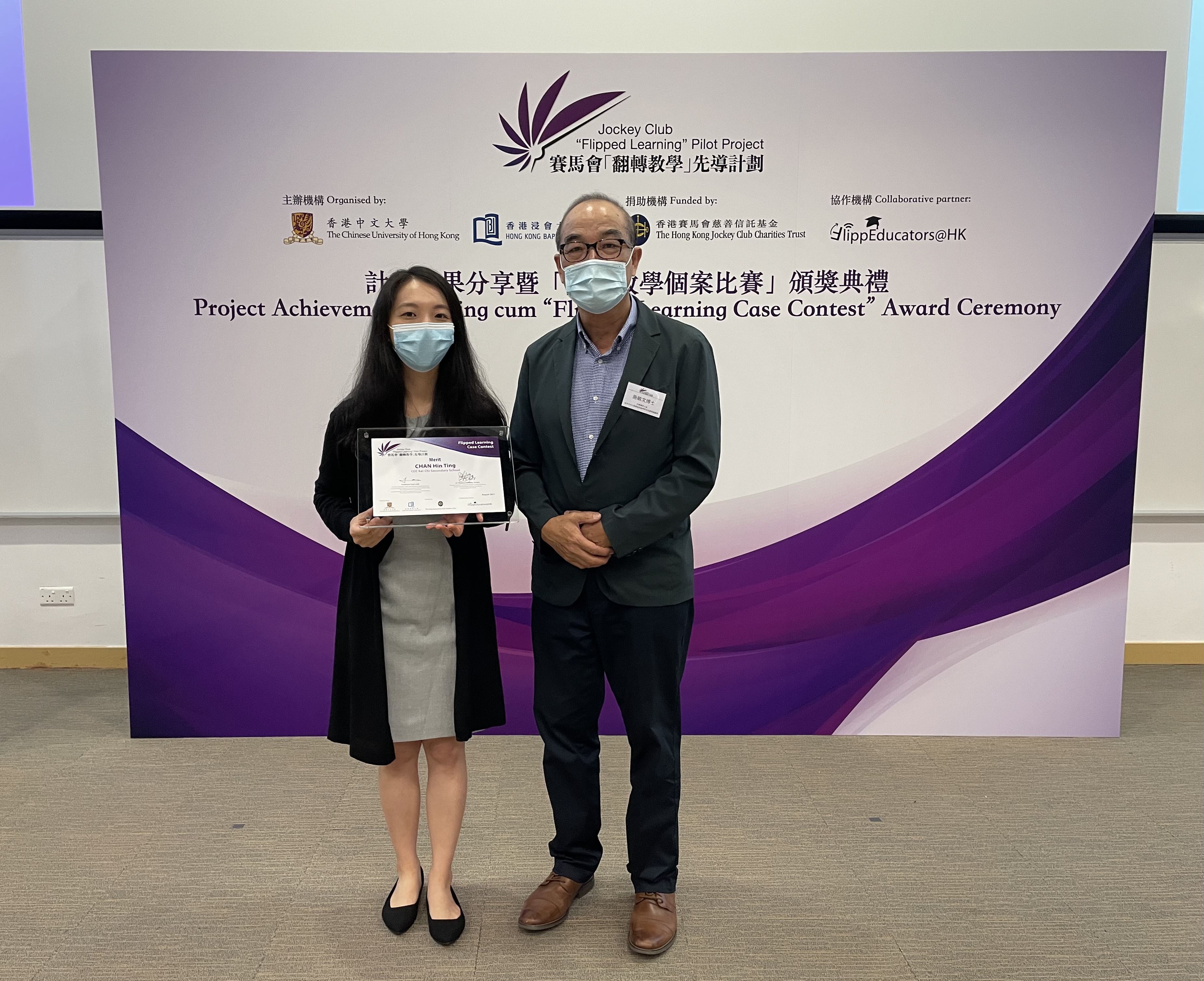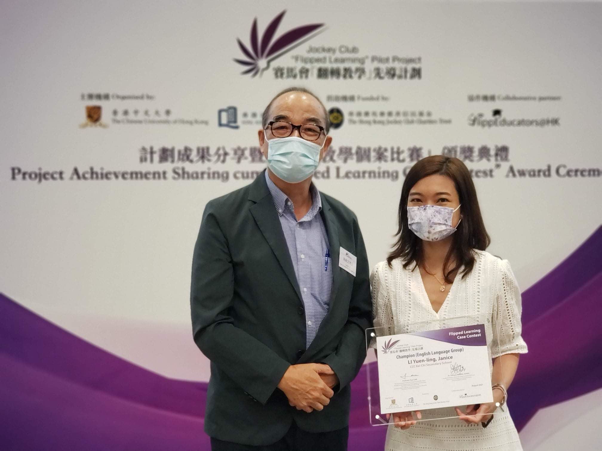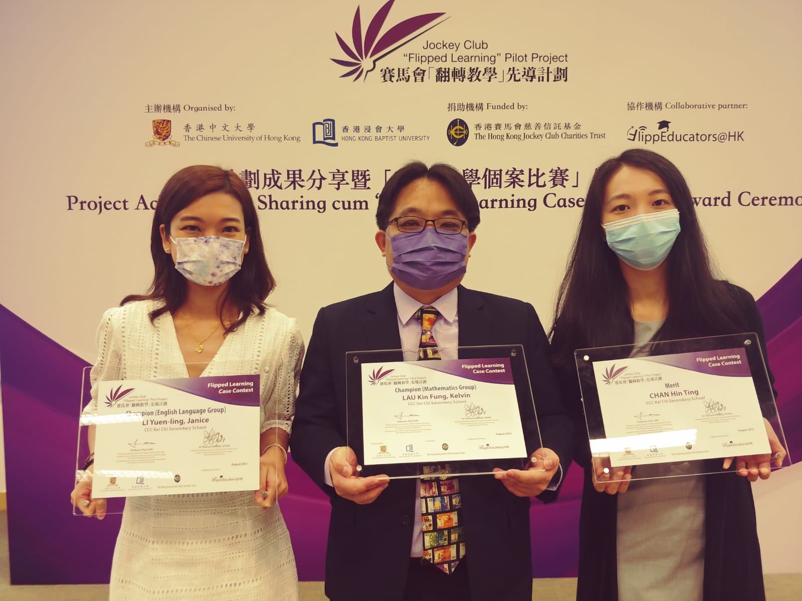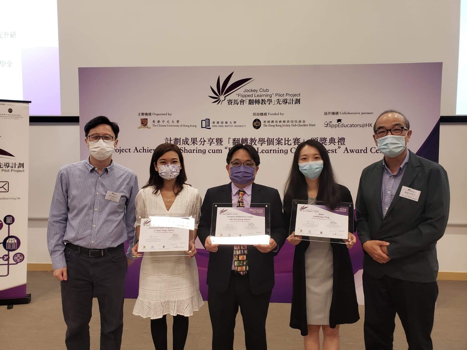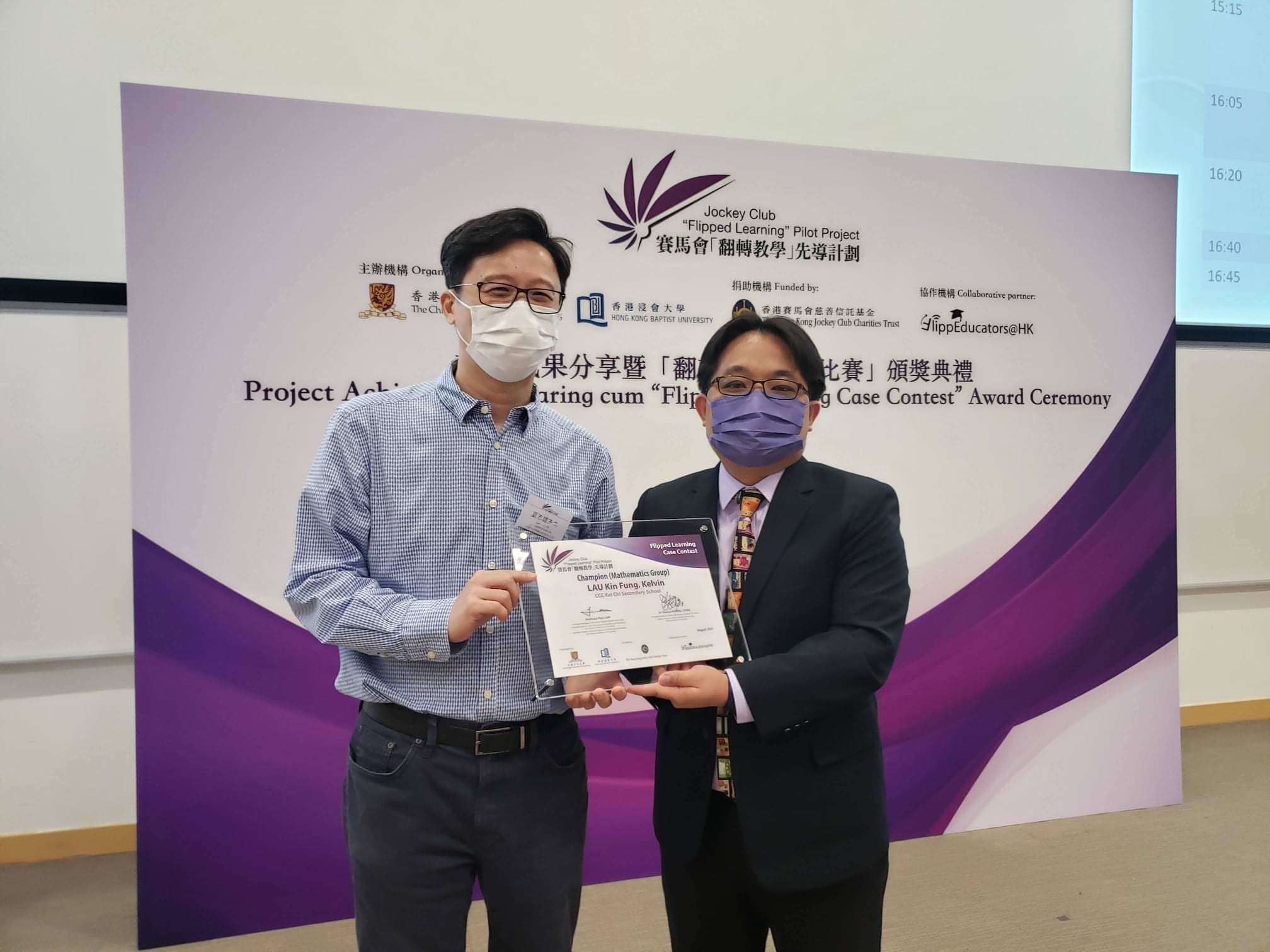 本校數學科老師劉健豐及英文科外藉老師Ms. Janice Li和陳軒婷老師參加了由香港中文大學及浸會大學合辦的翻轉課堂教案設計比賽。劉健豐老師和Ms. Janice Li分別獲得數學組和英文組的教案設計冠軍,陳軒婷老師則獲得優異獎。恭喜三位老師對教學研究的付出,發展專業,並獲得業界肯定。