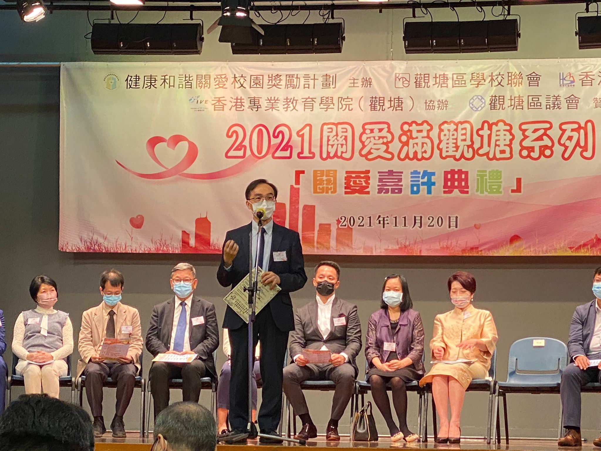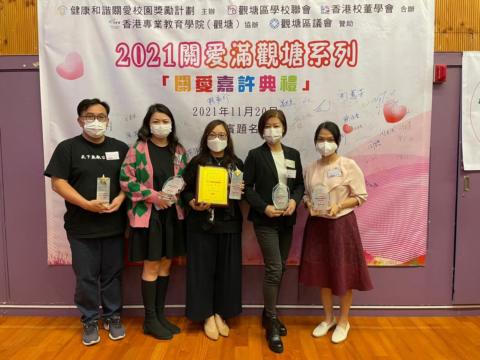 本校早前參加「健康和諧關愛校園獎勵計劃」,獲頒發以下獎項:廖麗嫻女士獲「關愛校董」、蕭秀壇女士獲「關愛家長」、阮麗華老師獲「關愛老師」、蔡莉晶老師獲「關愛團隊」及胡禮光老師獲「全方位關愛老師」,並於2021年11月20日(星期六)出席2021關愛嘉許禮,恭喜以上獲獎者。