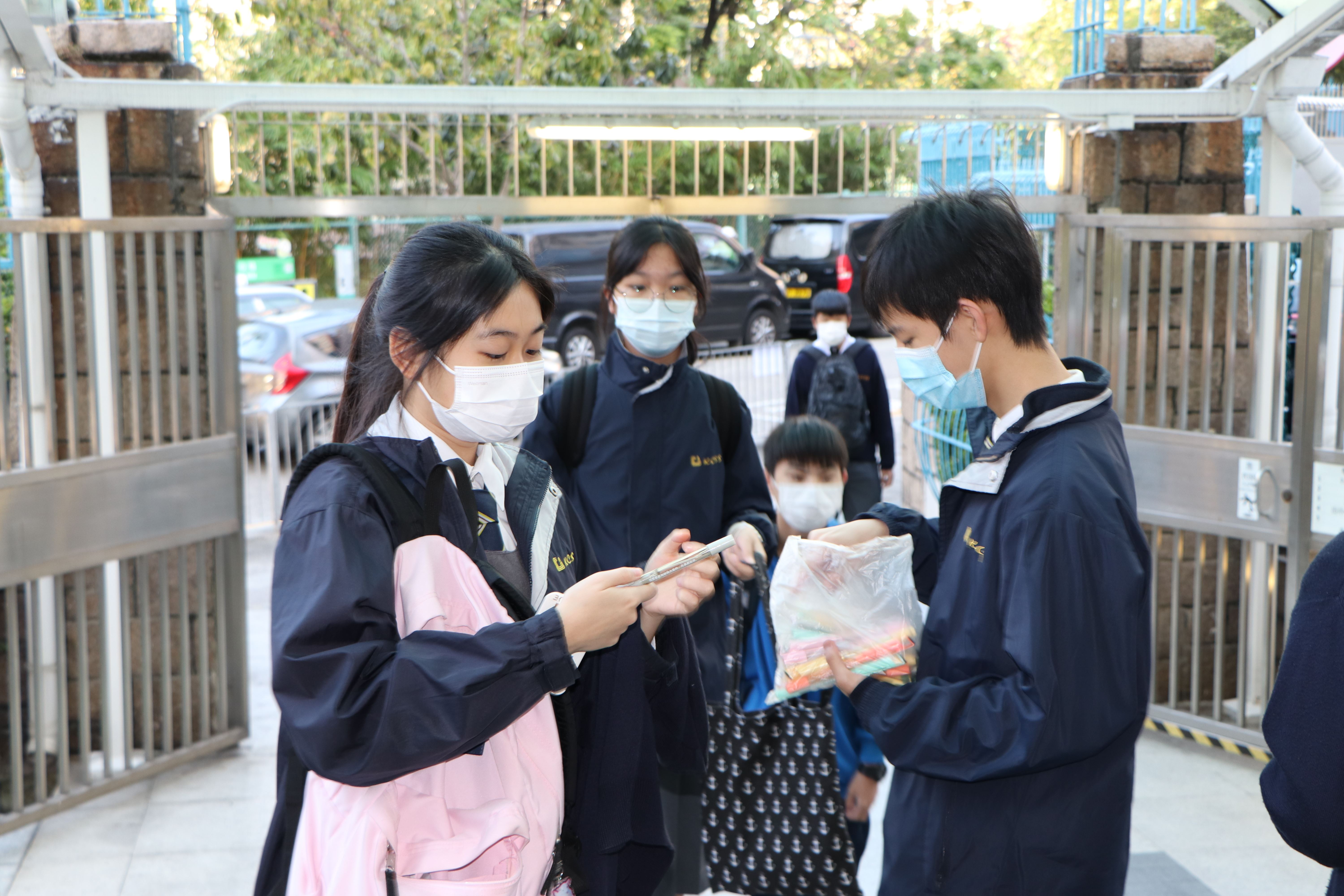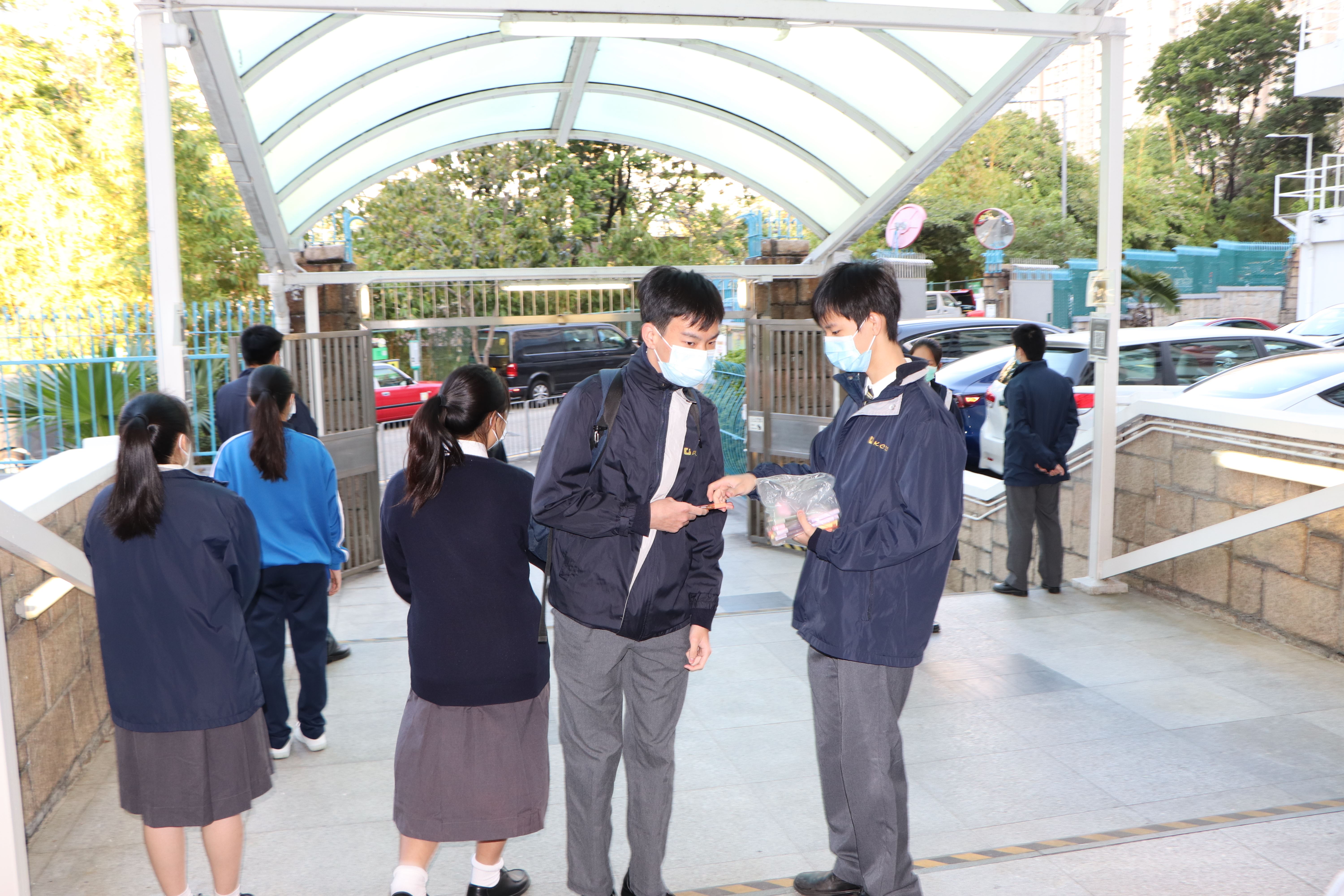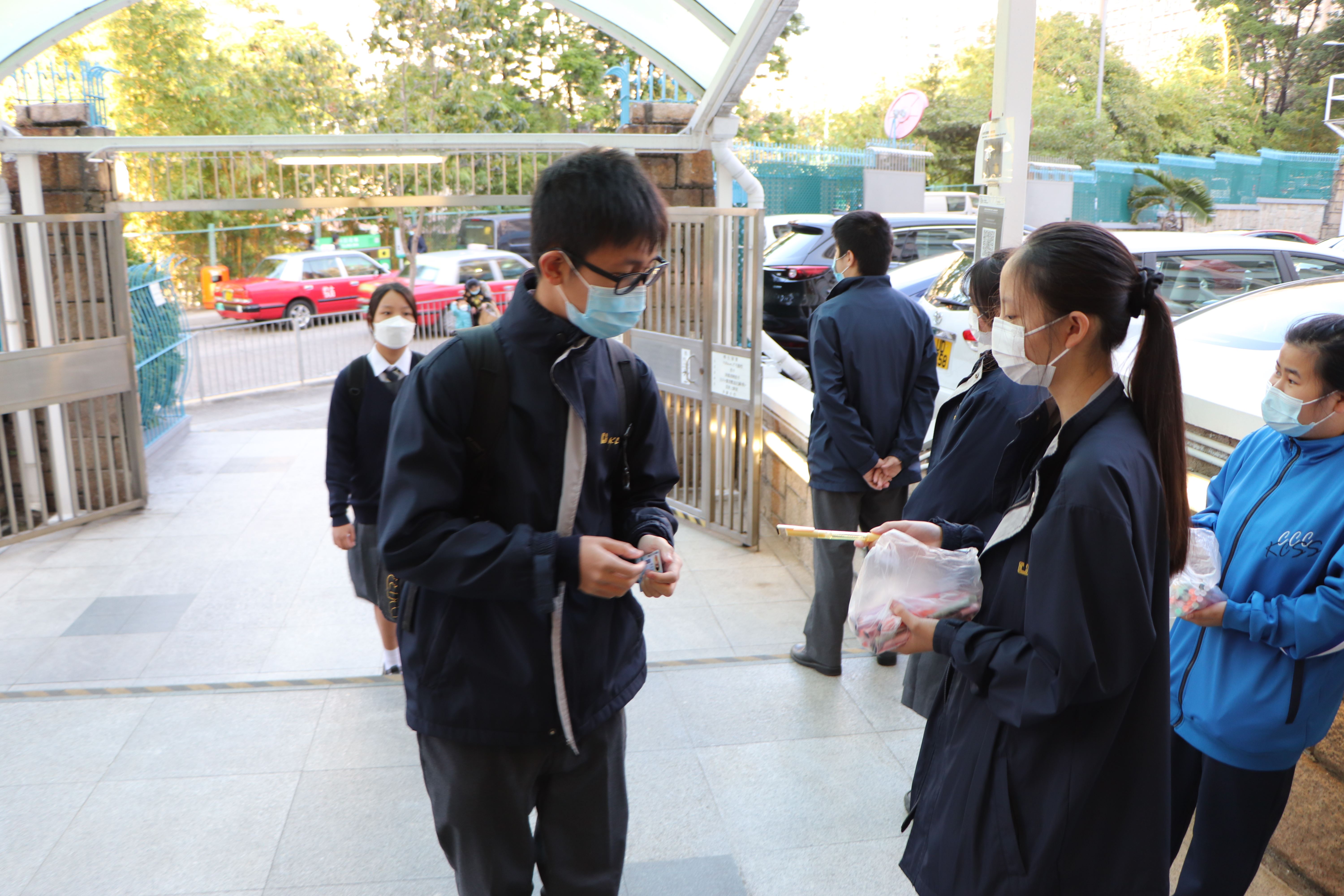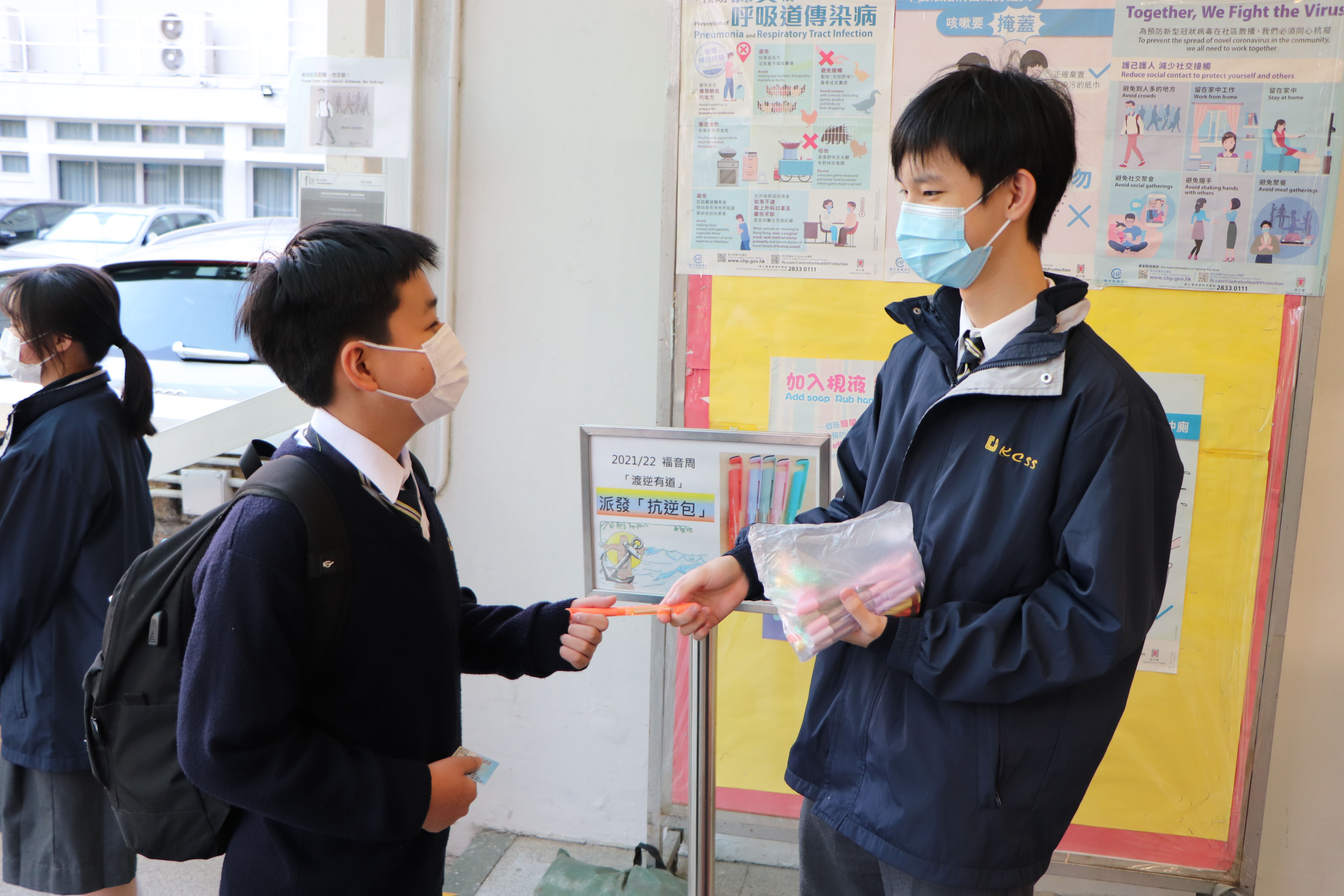 基督精兵於學校門口派發福音筆,上面寫著:我靠著那加給我力量的,凡事都能做(腓立比書3:13) - - 「渡逆有道」;為同學帶上祝福。