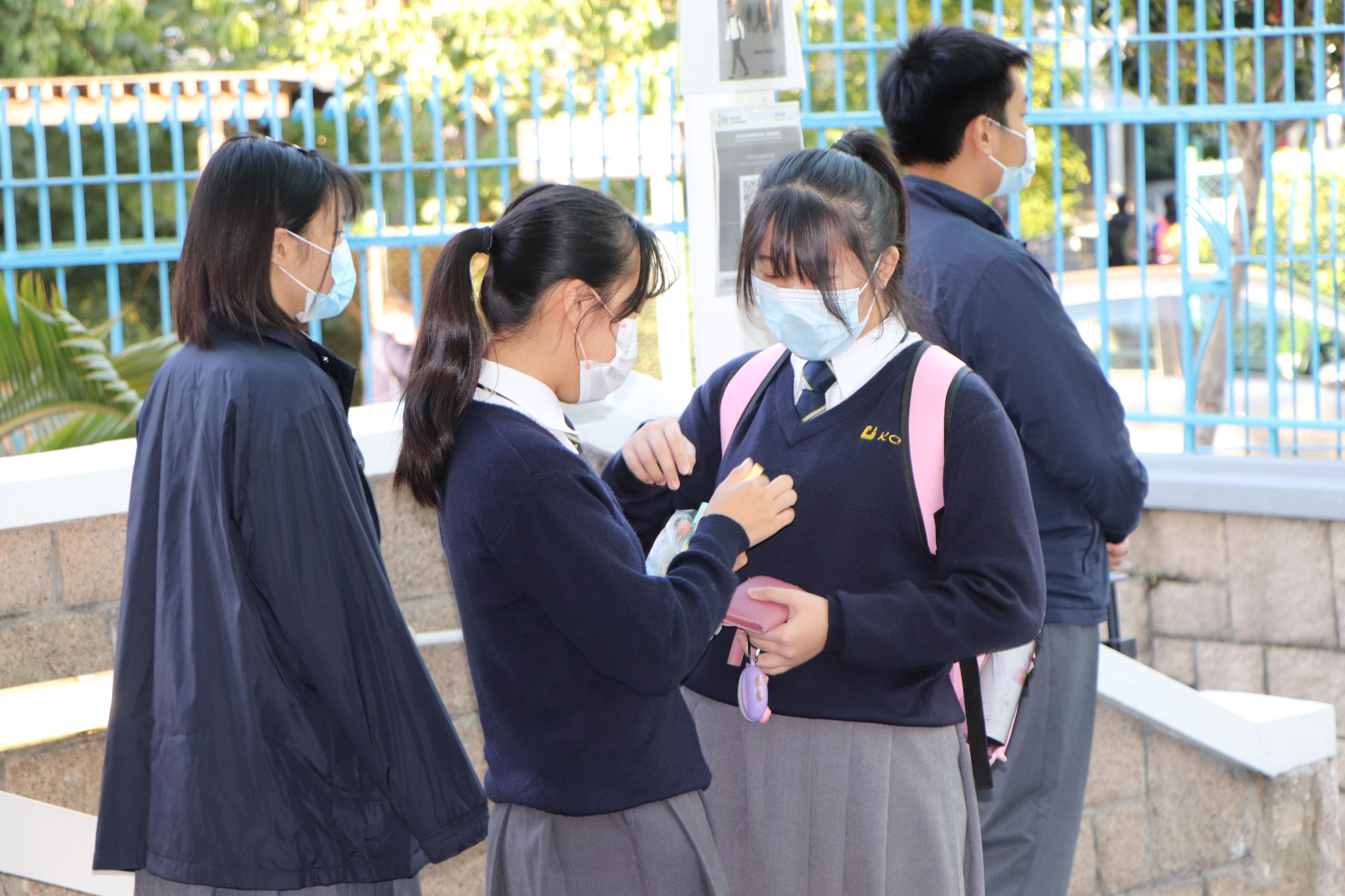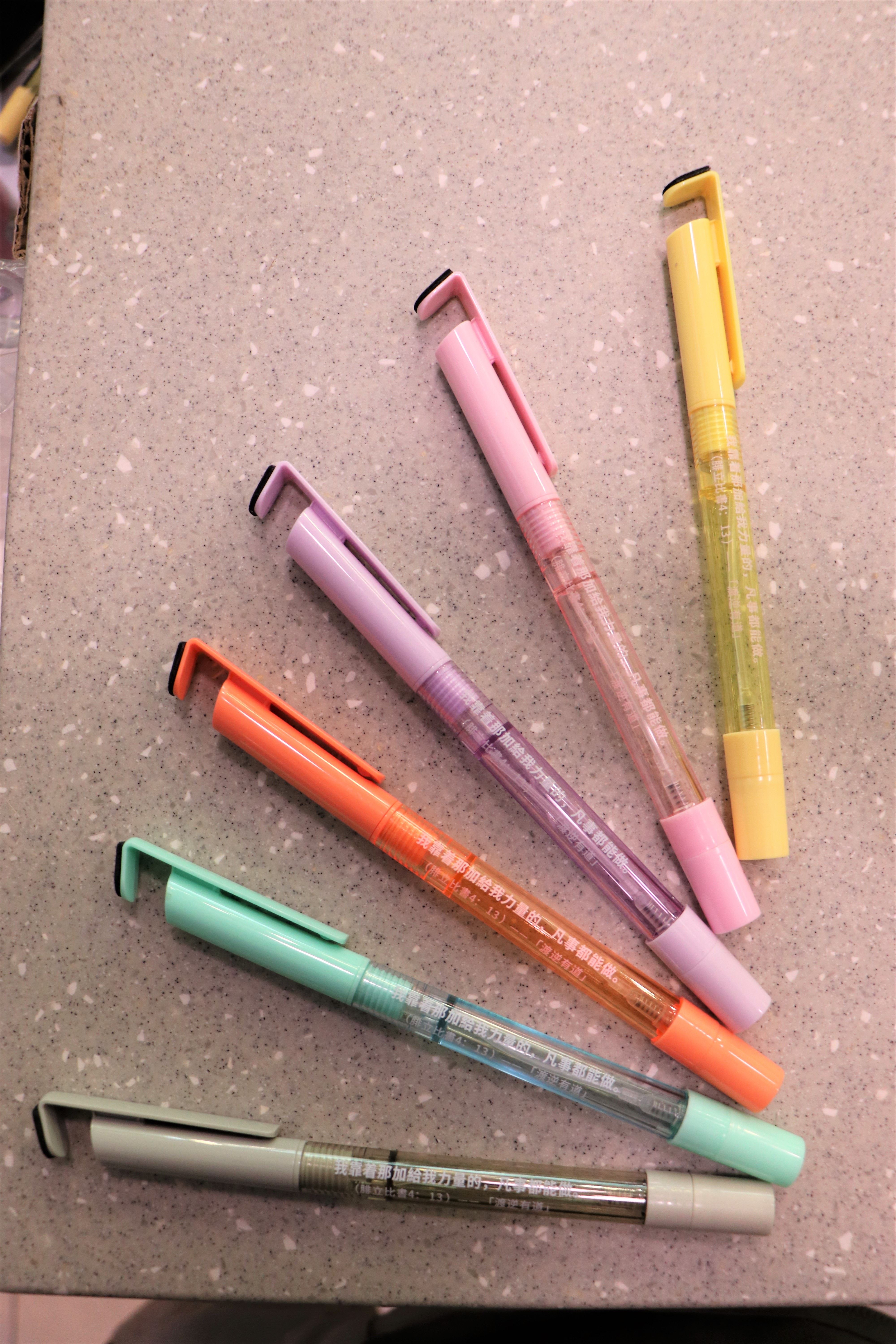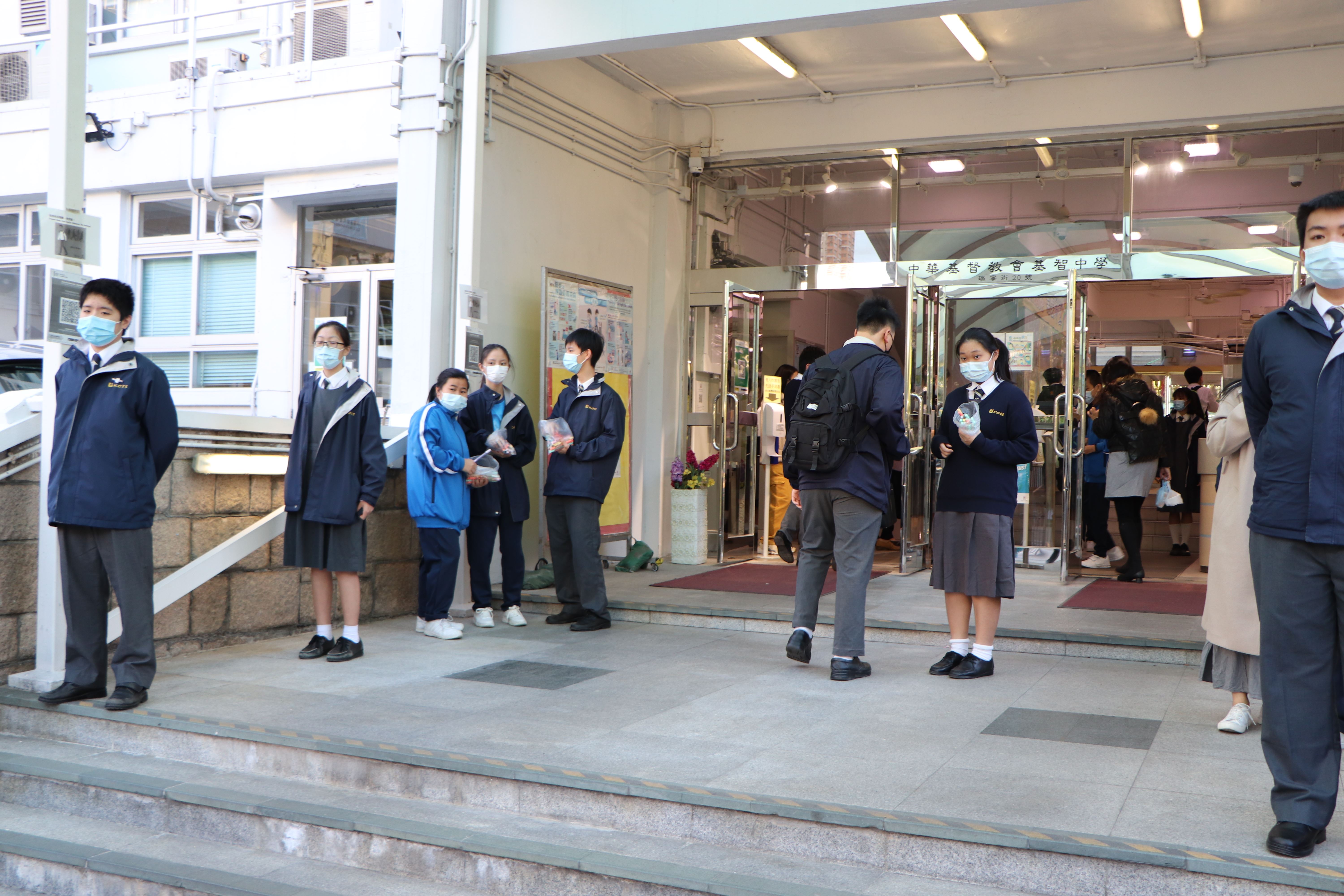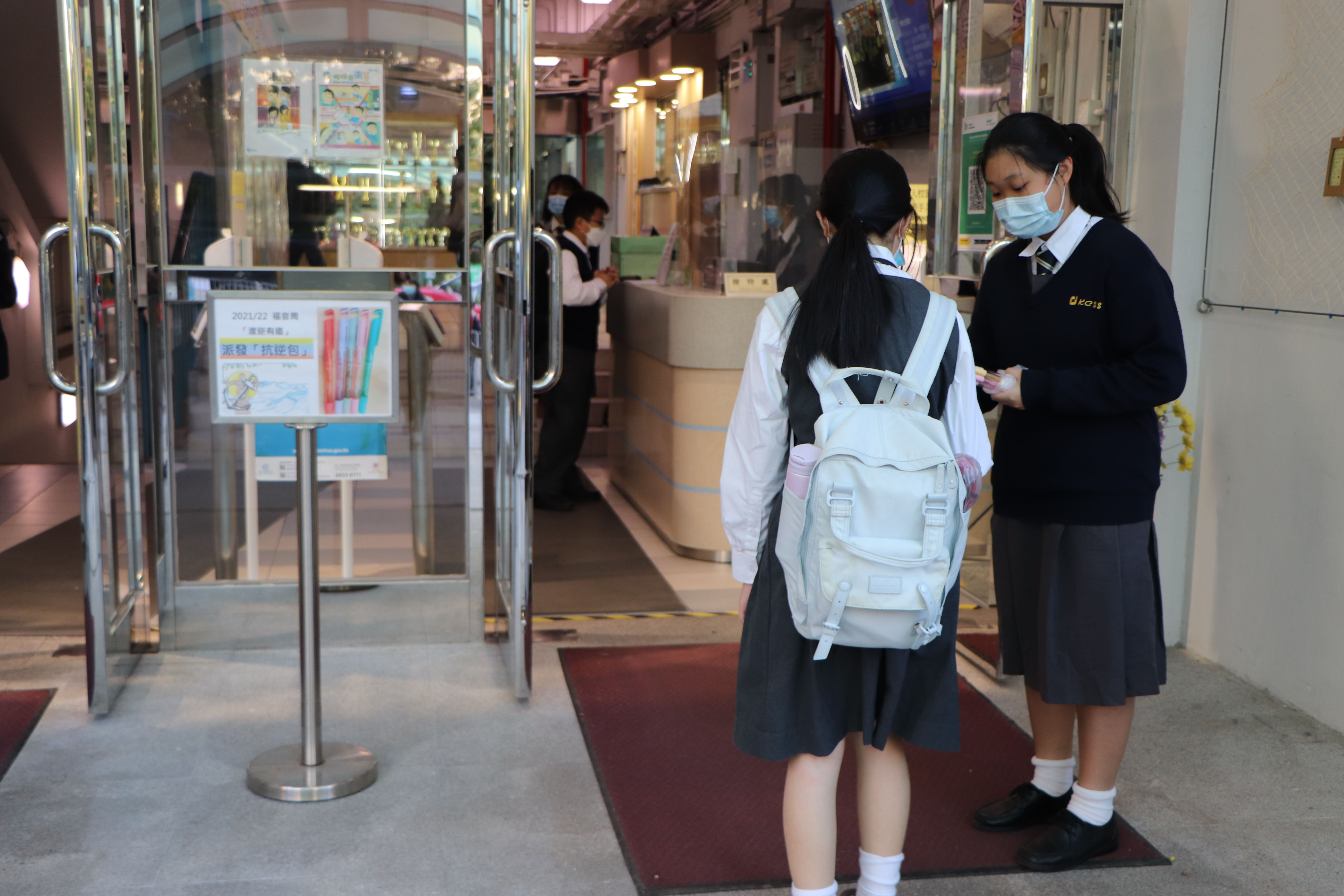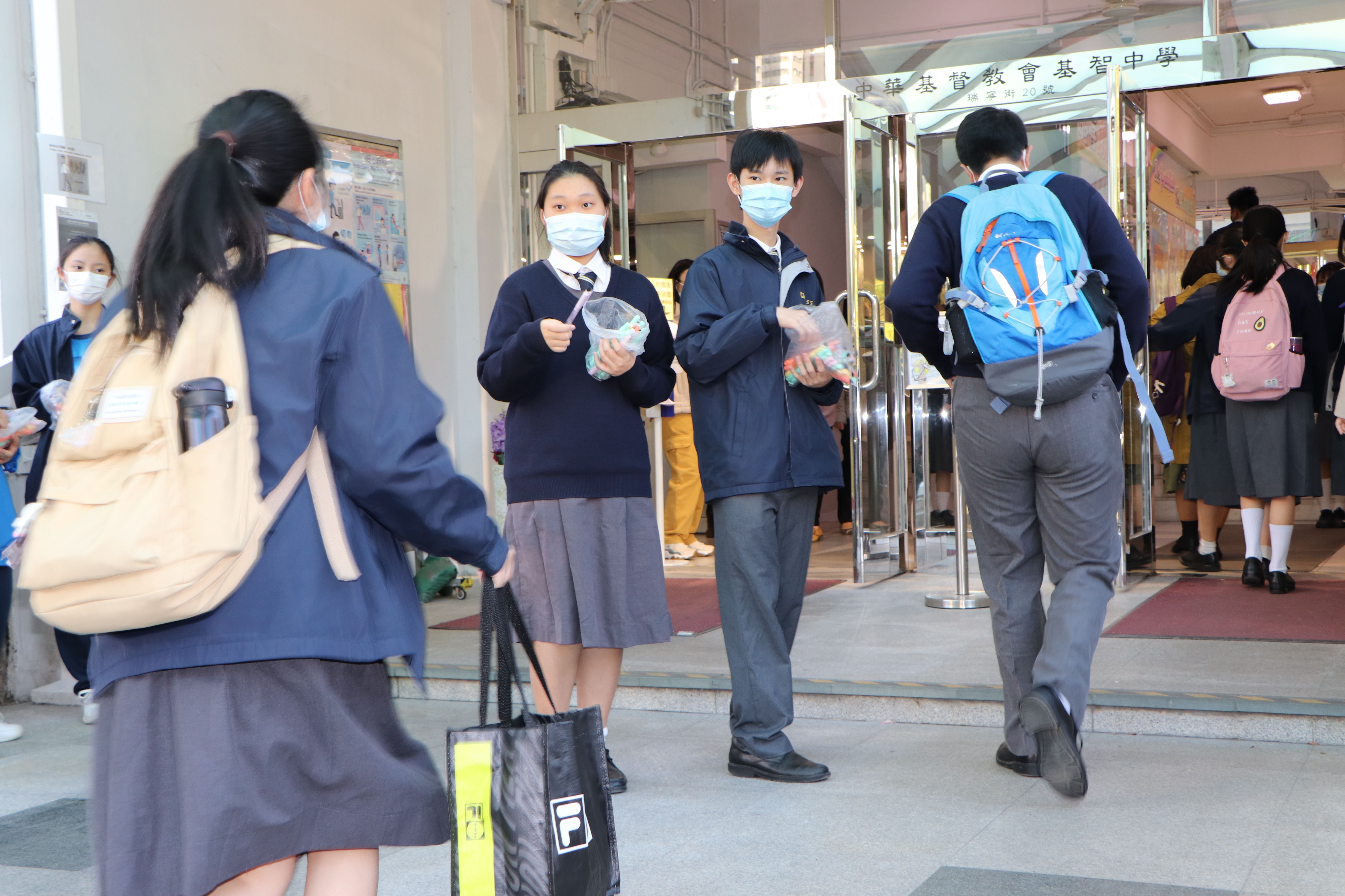 基督精兵於學校門口派發福音筆,上面寫著:我靠著那加給我力量的,凡事都能做(腓立比書3:13) - - 「渡逆有道」;為同學帶上祝福。