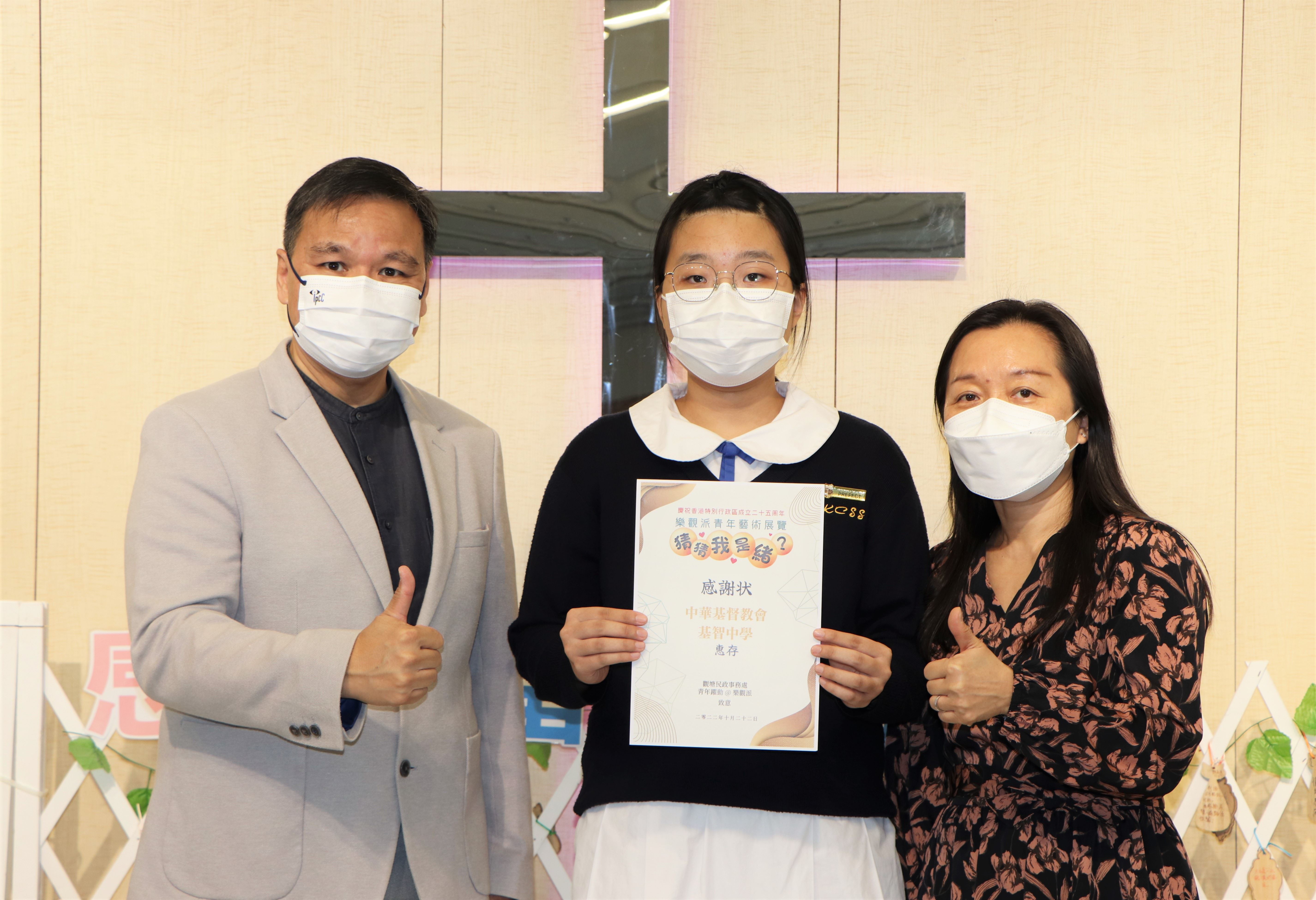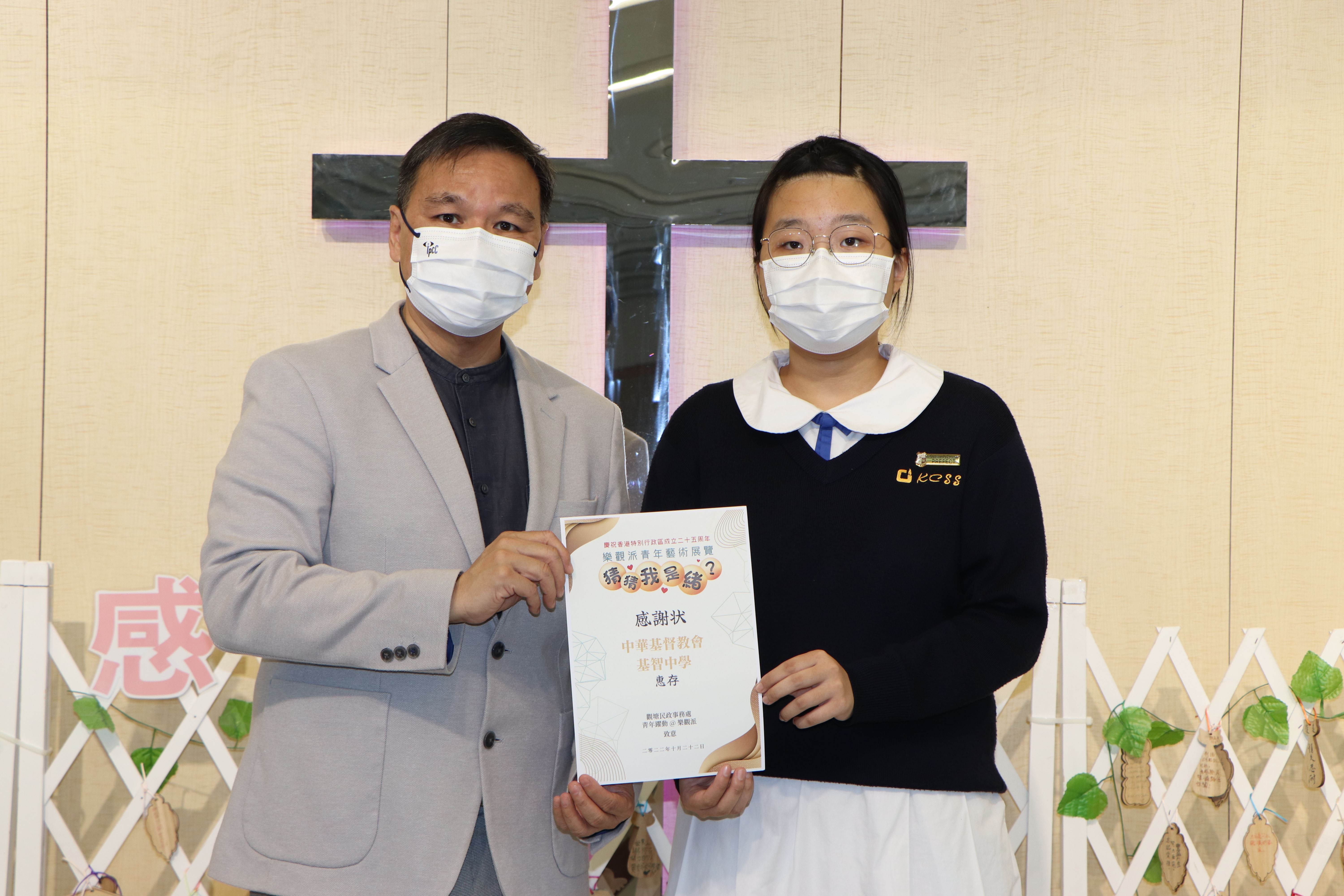 本校30位學生獲觀塘民政事務處邀請參與情緒面具製作,作品於10月22日的慶祝香港特別行政區成立25周年「青年藝術展覽 - 猜猜我是緒」開幕典禮中展出,是次展覽想喚起大眾對精神健康的關注,本校五位學生代表出席支持是次展覽開幕典禮,並獲機構頒發感謝狀。