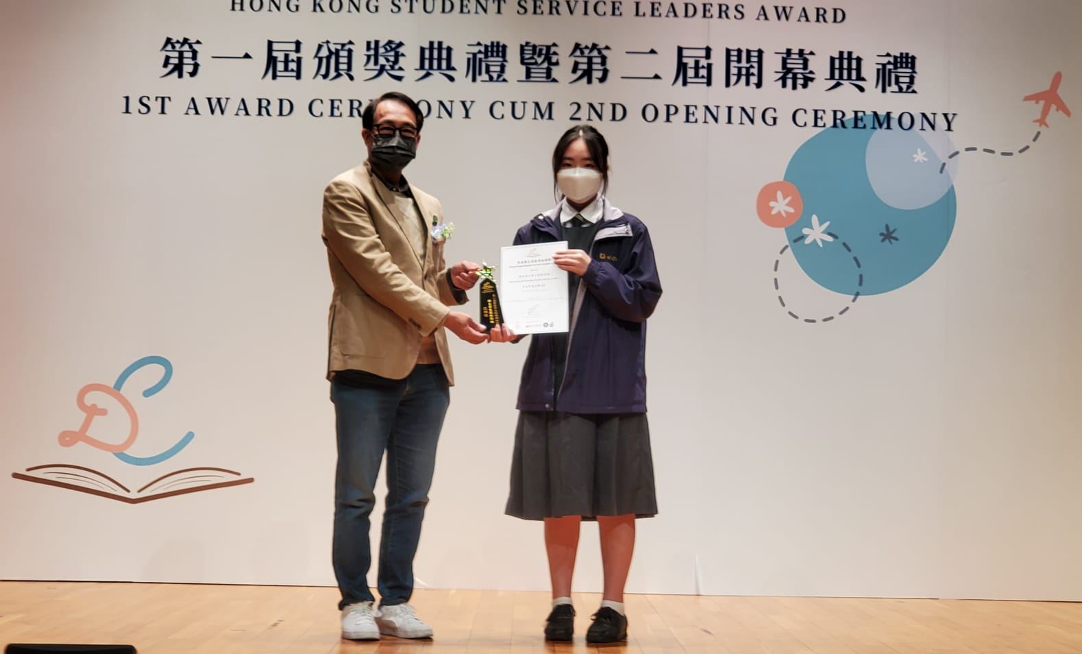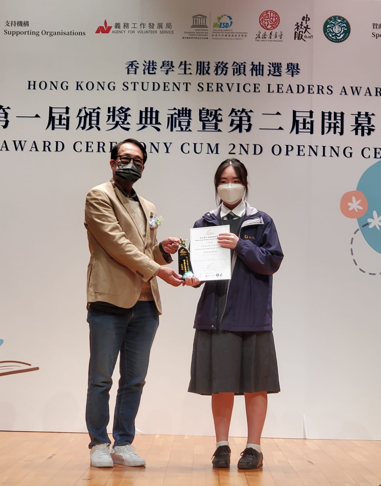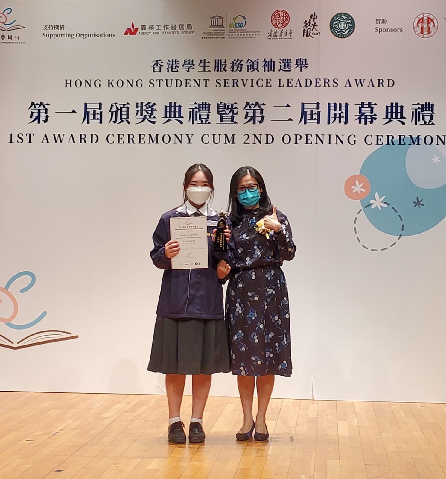 6D班范錦怡競逐童夢同行舉辦的「香港學生服務領袖選舉2021-22」,選舉旨在嘉許本港學生領袖於社會服務上的貢獻,鼓勵他們繼續服務社群。是次選舉選出香港十大傑出學生服務領袖及十名傑出學生服務領袖。決選評判包括香港社會服務聯會主席陳智思大紫荊勳賢, GBS, JP等,他們讚賞本屆選舉二十名決選生的傑出表現,並寄語他們繼續服務社會。恭喜范錦怡同學經過初選、複選面試及決選面試後,成功獲選為「傑出學生服務領袖」。頒獎典禮於12月3日假香港中文大學逸夫書院大講堂舉行,王美清副校長出席典禮與學生共享喜悅。