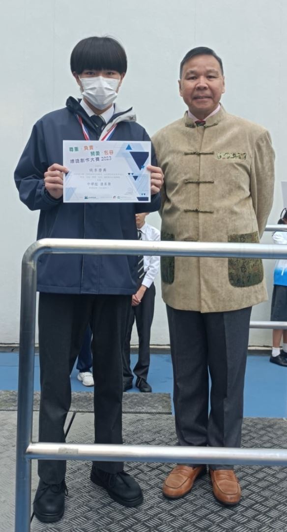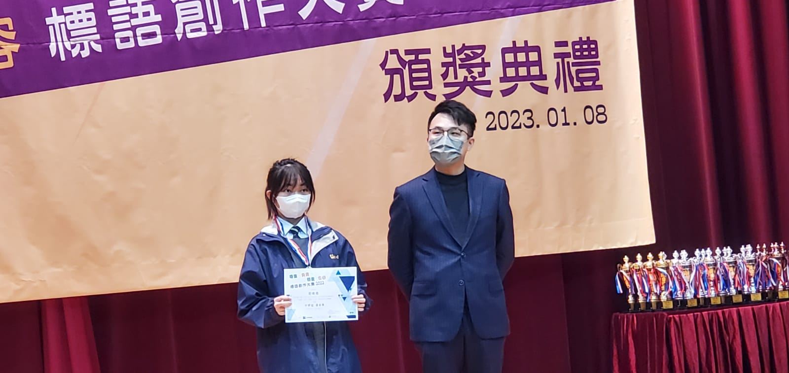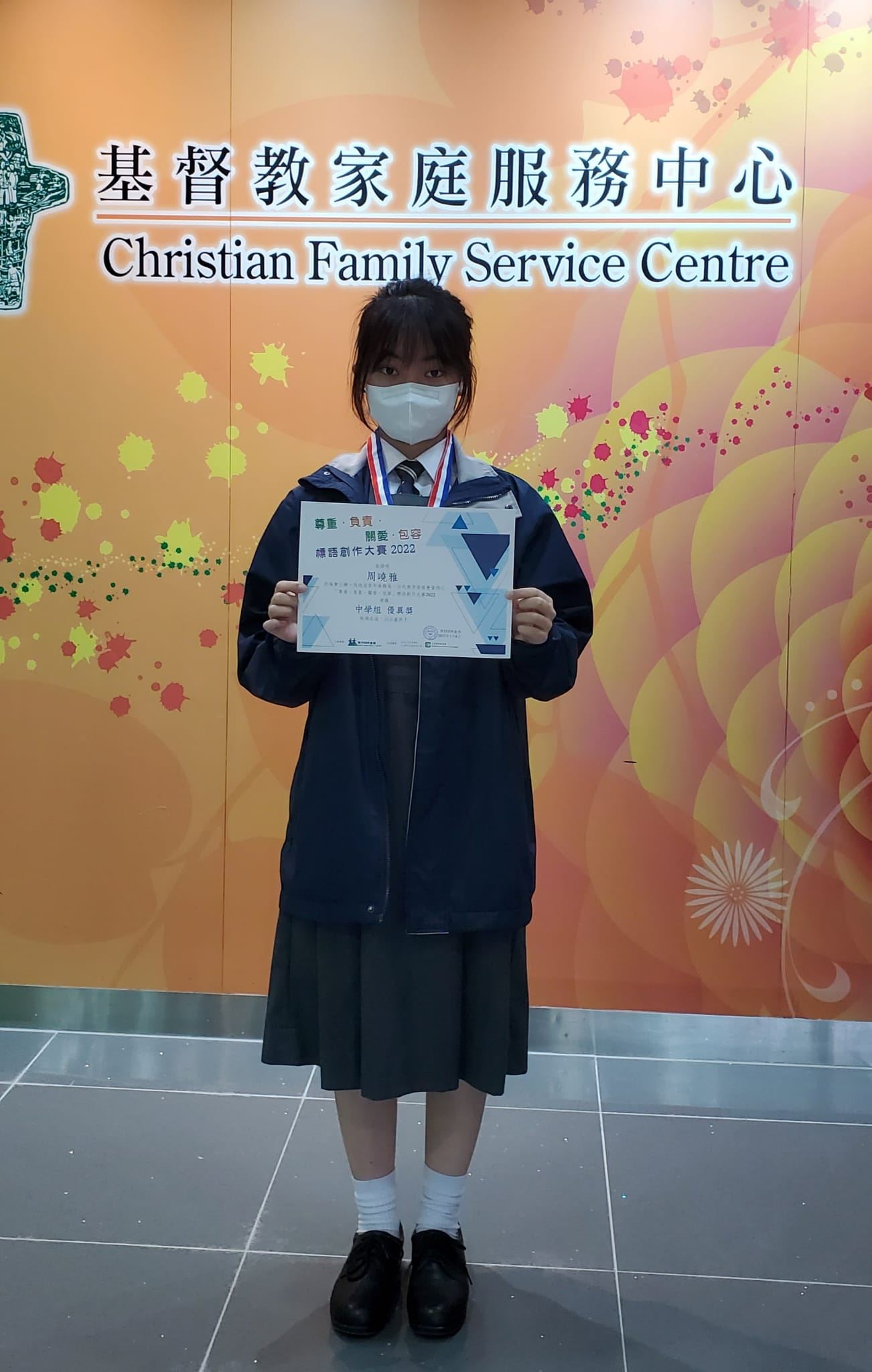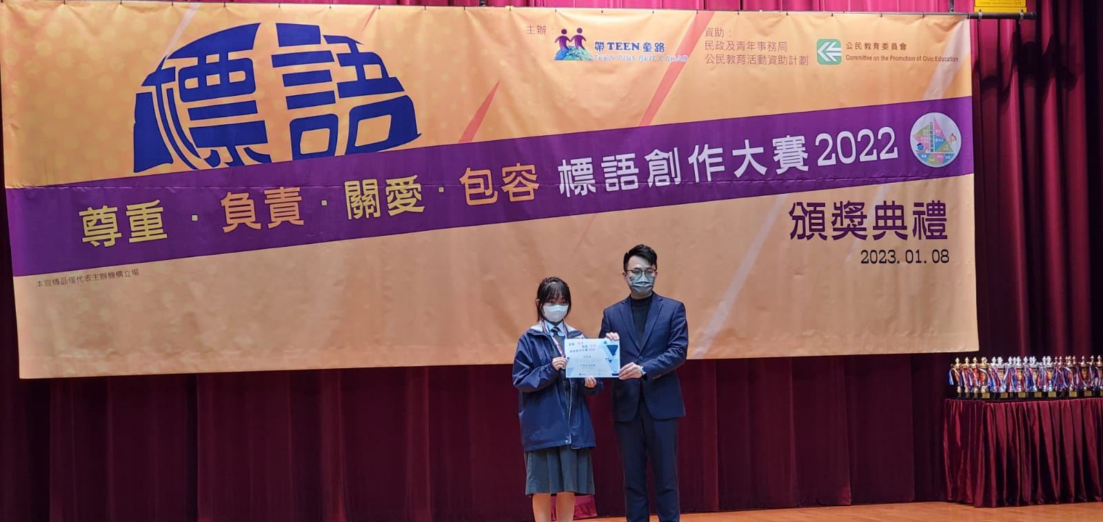 社會服務委員會與生活與社會科合作,協助學生參加「帶Teen童路」主辦的「尊重、負責、關愛、包容」標語創作大賽2022,培養學生正確價值觀,裝備他們具備良好公民素質,將來服務社群。機構從近萬份參賽作品進行評審,3A周晓雅獲頒中學組優異獎,頒獎典禮於8/1/2023假基督教家庭服務中心禮堂舉行。 以下是獲獎標語: 以尊重平待他人,獲美德。椿椿事事負上責,取信任。 以關愛滋潤人心,蒙真摰。紛紛籍籍且包容,得貞仁。