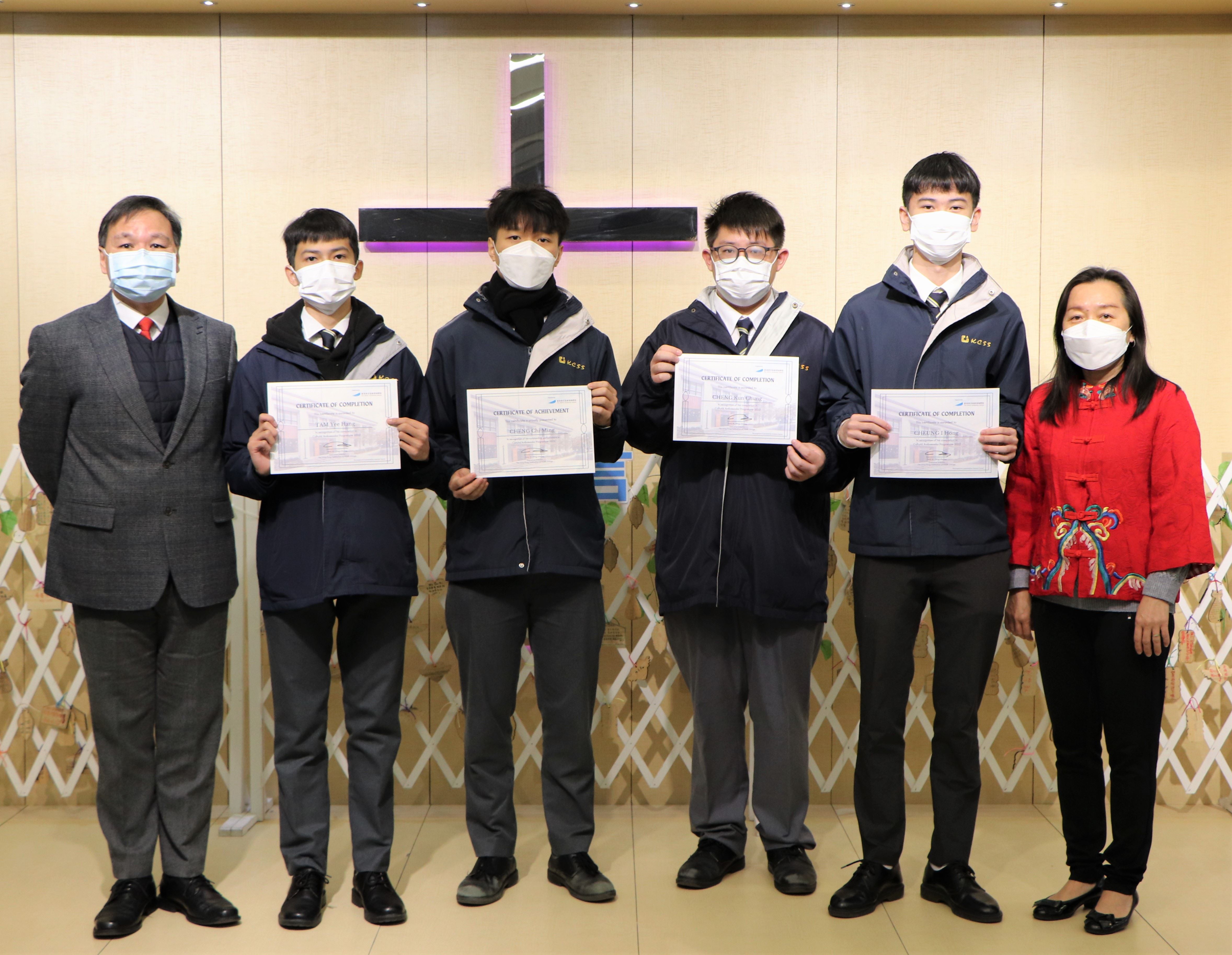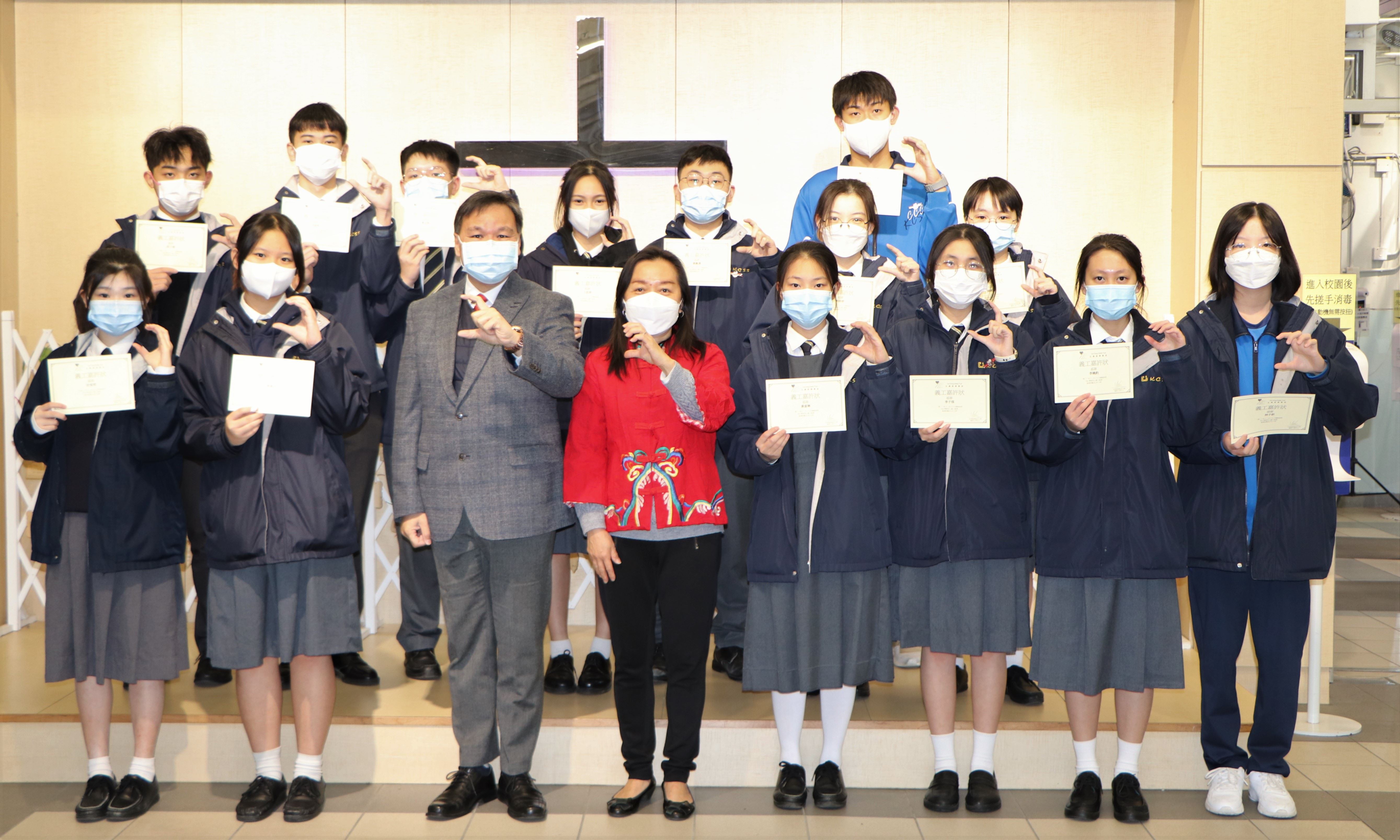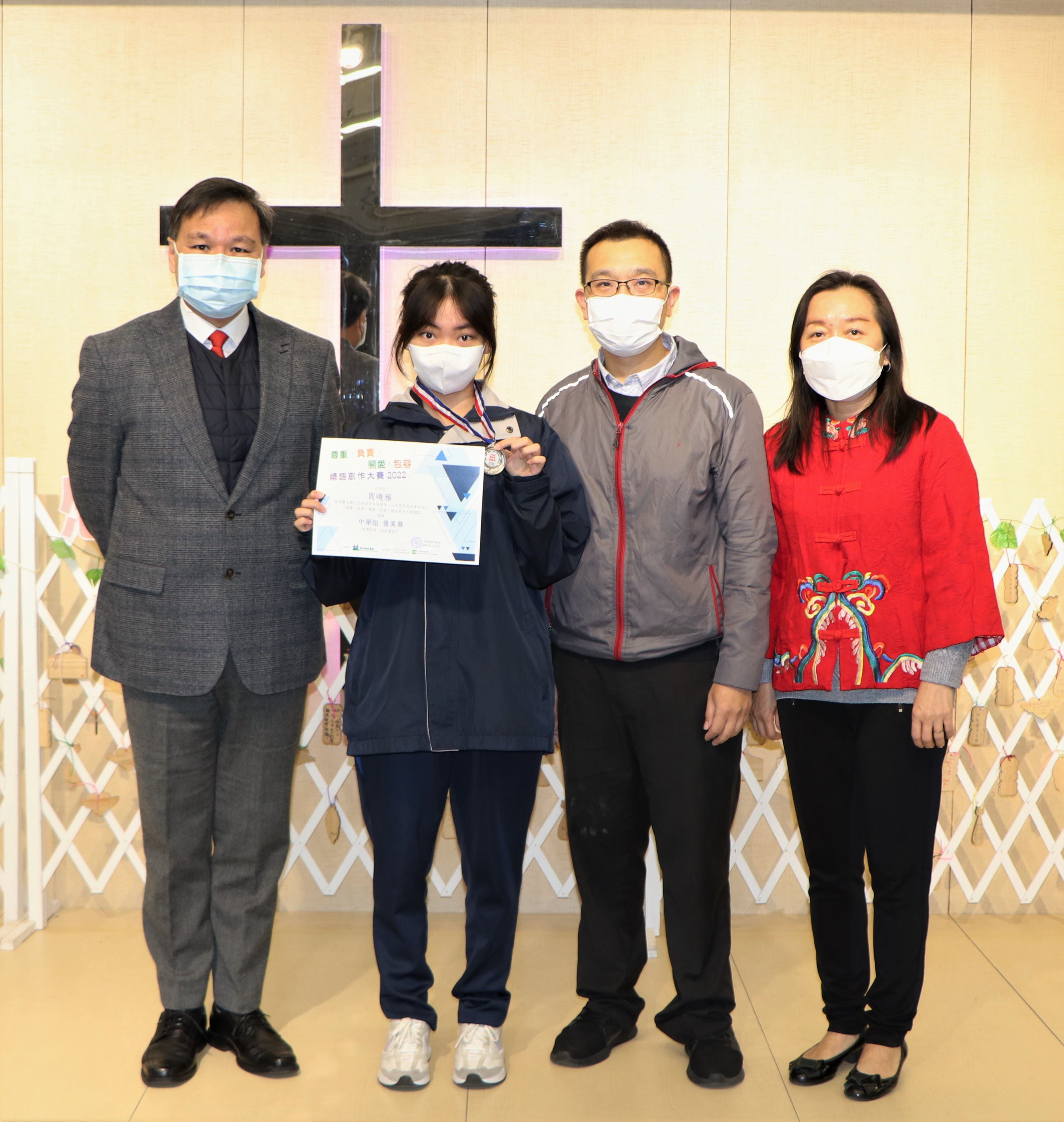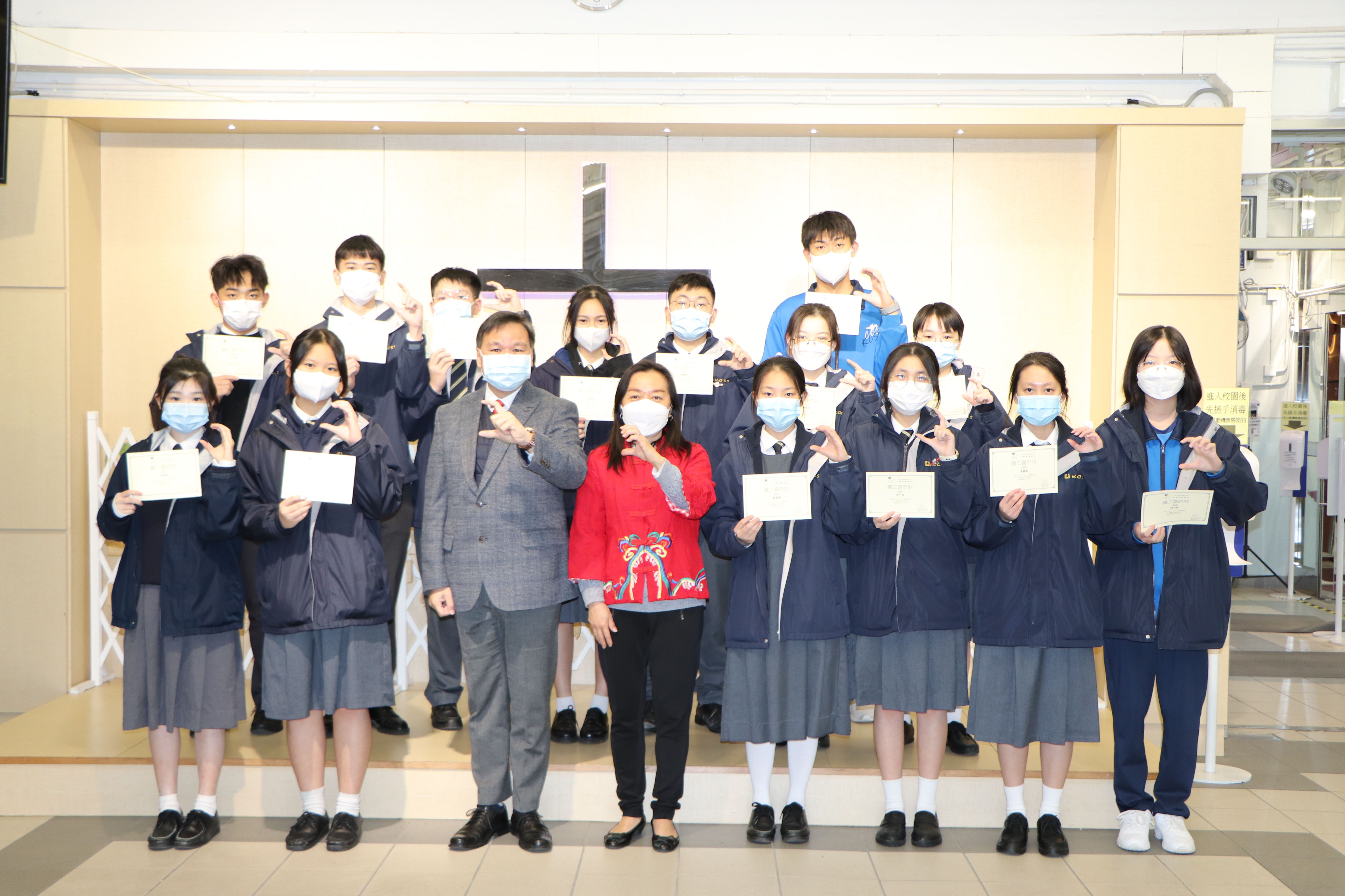 3A周晓雅參加「帶Teen童路」主辦的「尊重、負責、關愛、包容」標語創作大賽2022,獲頒中學組優異獎。5C鄭貫聰、張貽杭、5D鄭志鳴、譚以行參加由「香港青年協會領袖學院」主辦的「文化保育大使計劃」,完成一連串培訓活動後,獲機構頒發證書。本校「4C青年義工領袖計劃」的團員在17/12/2022到油塘高怡邨進行自行策劃服務 - Fun樂暖您心,探訪長者,為長者送上關懷,團員獲玉清慈善基金頒發「義工嘉許狀」。