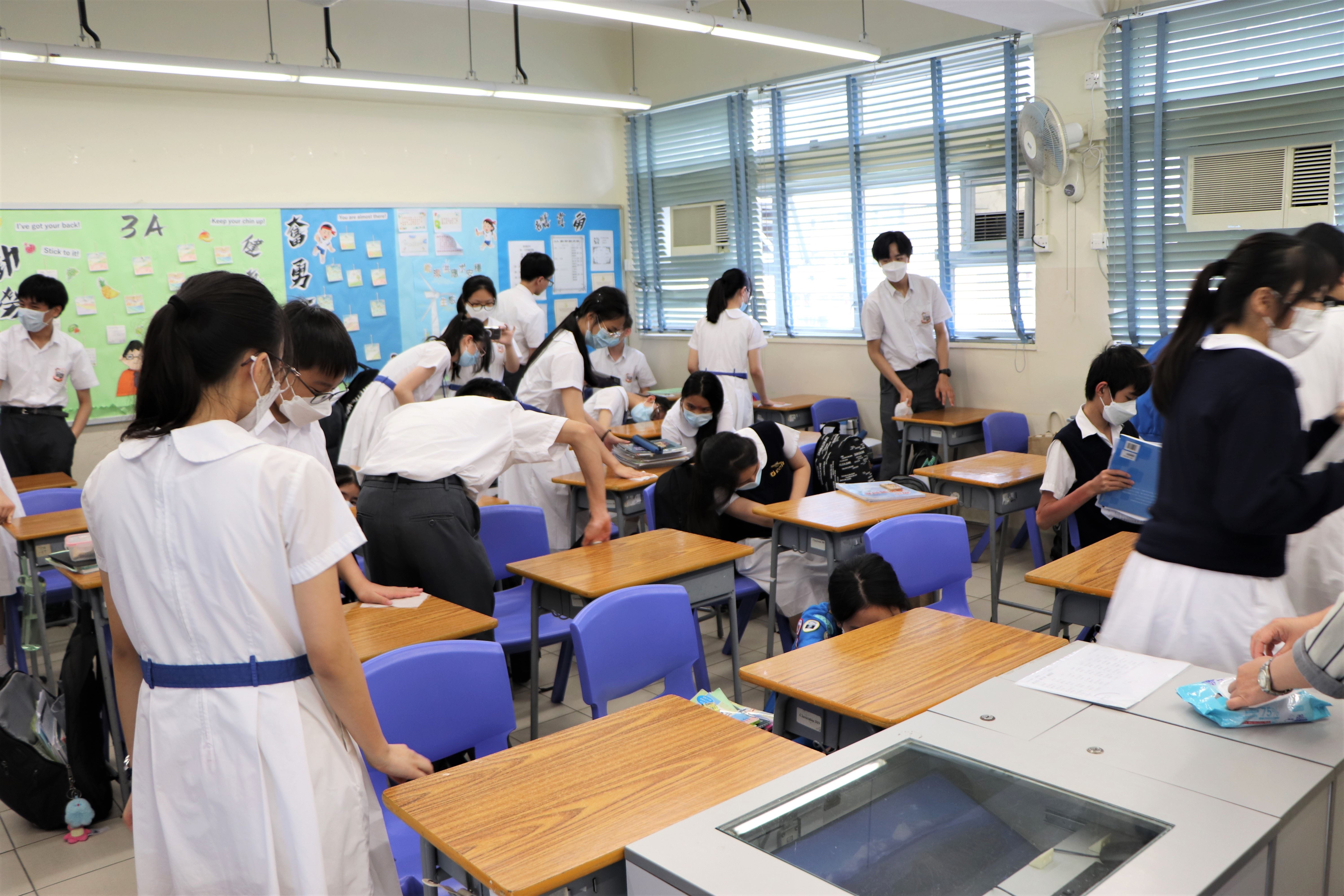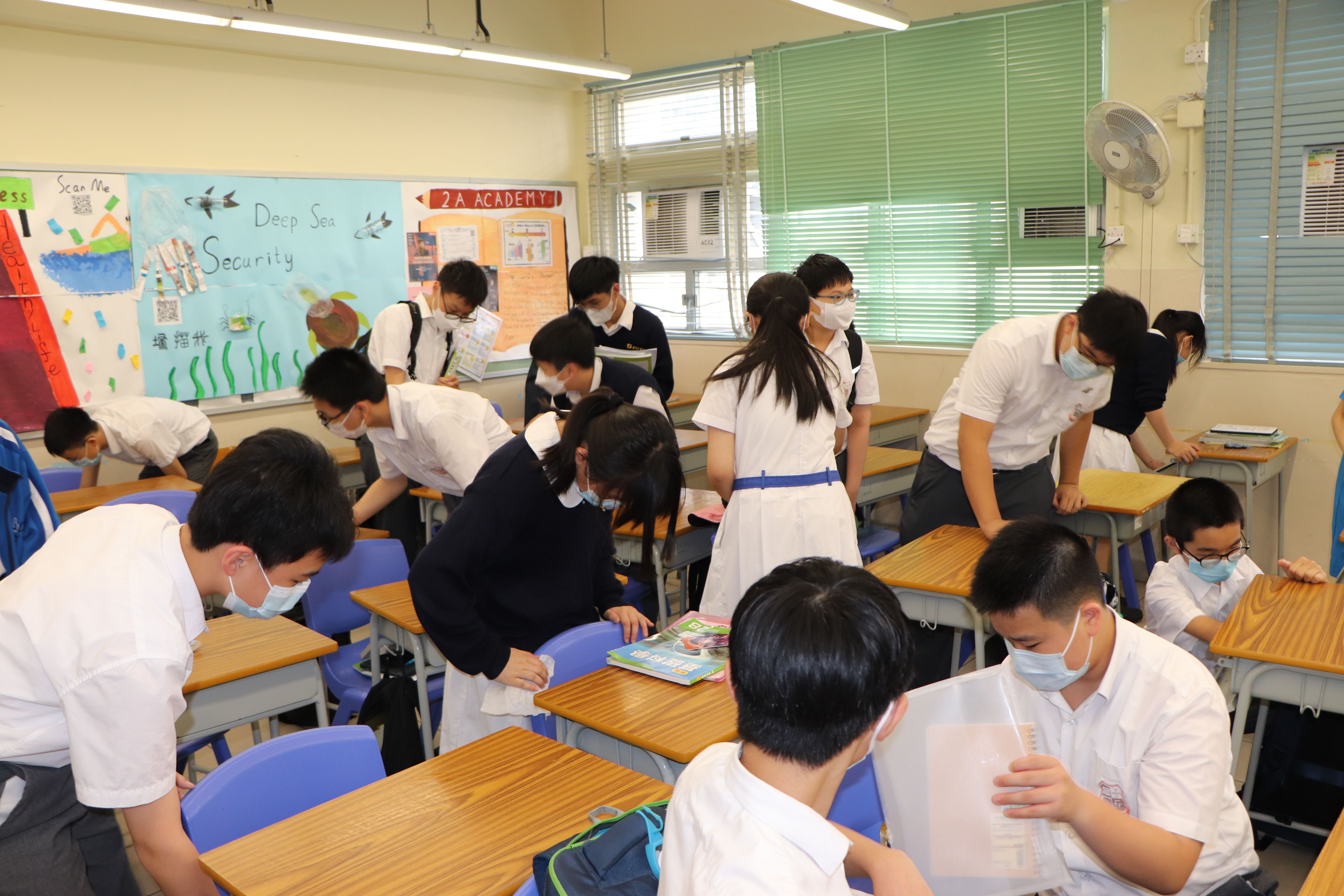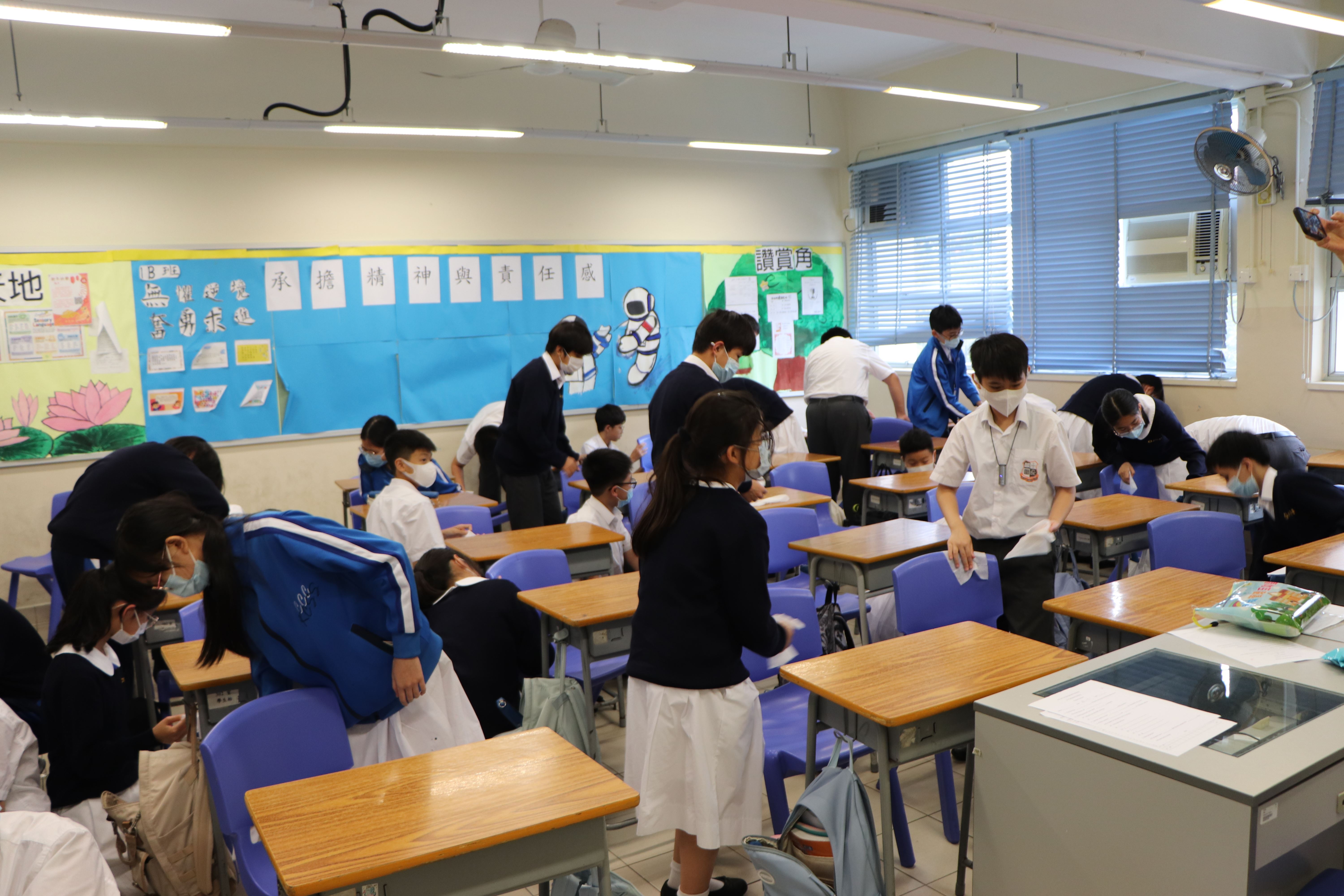 全校學生於4月17日周會後返回自己課室清潔桌椅和整理櫃面,保持校園環境清潔。