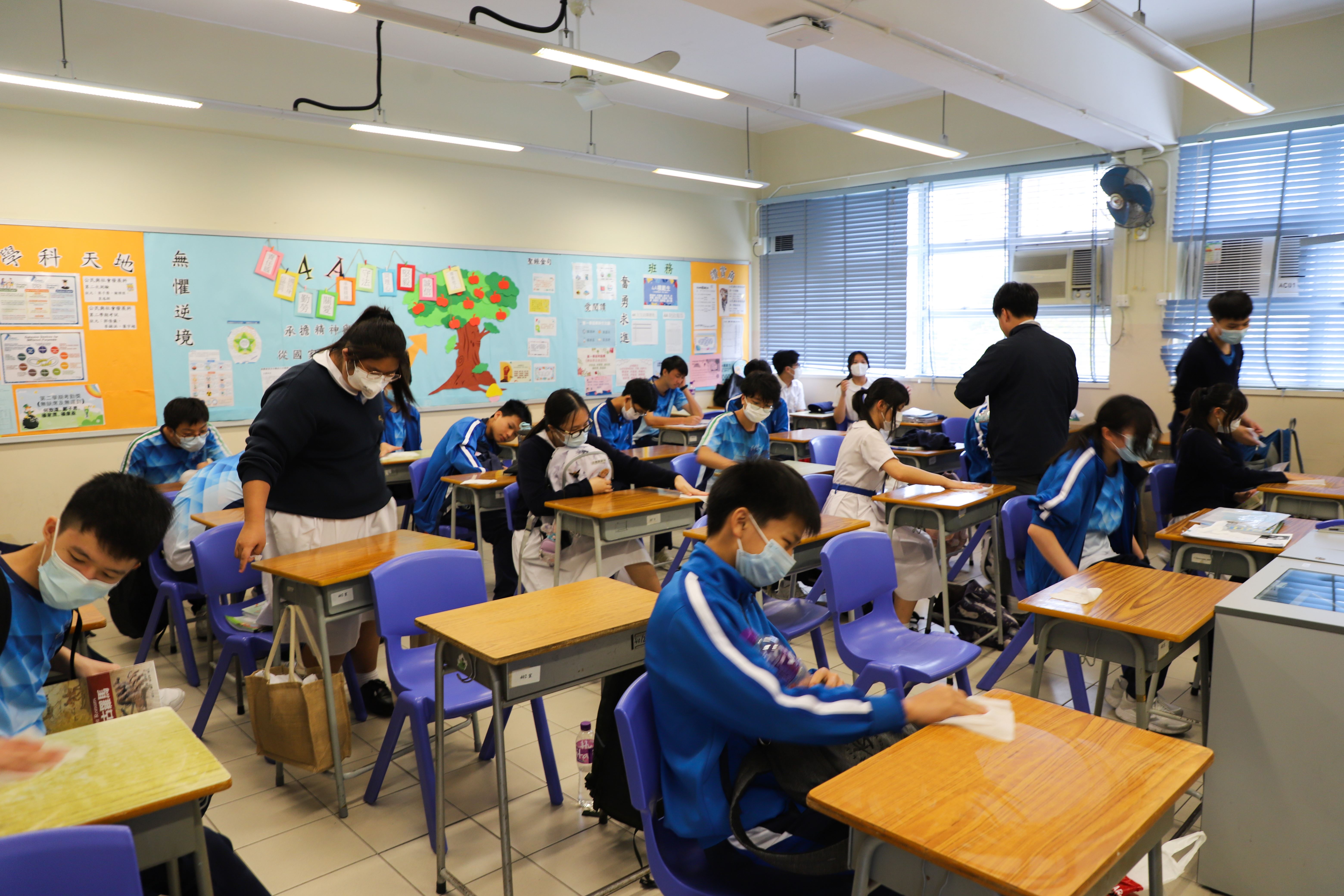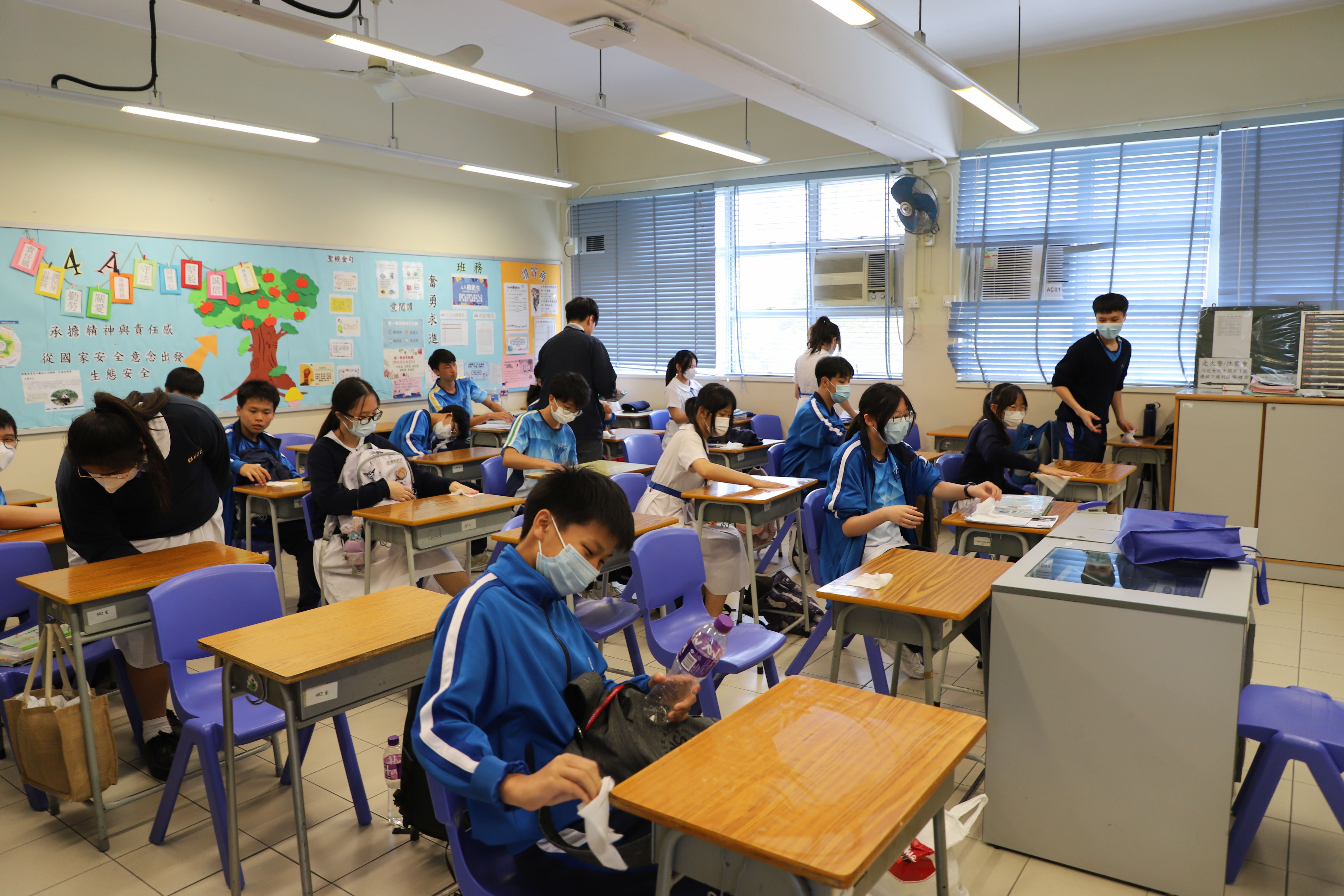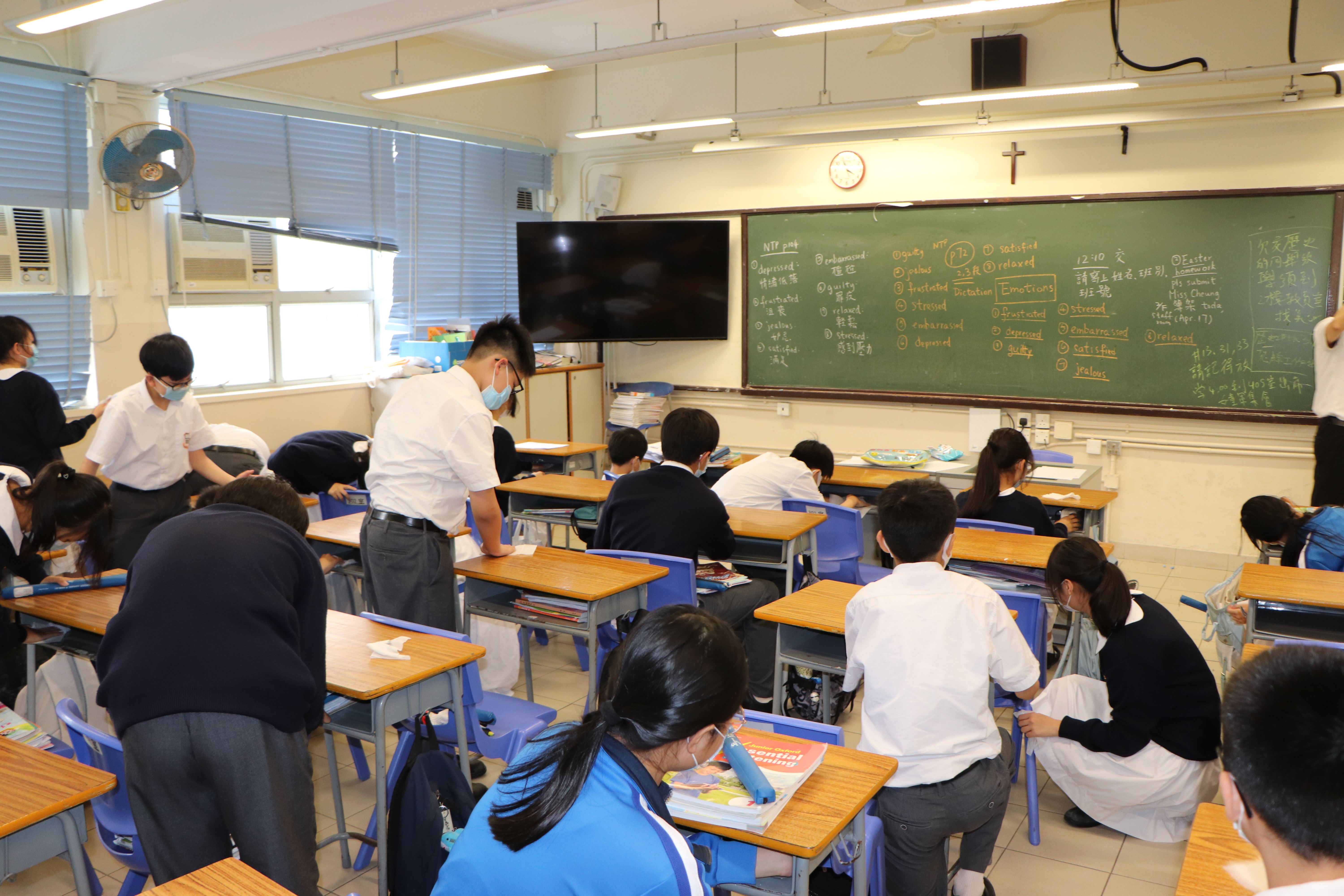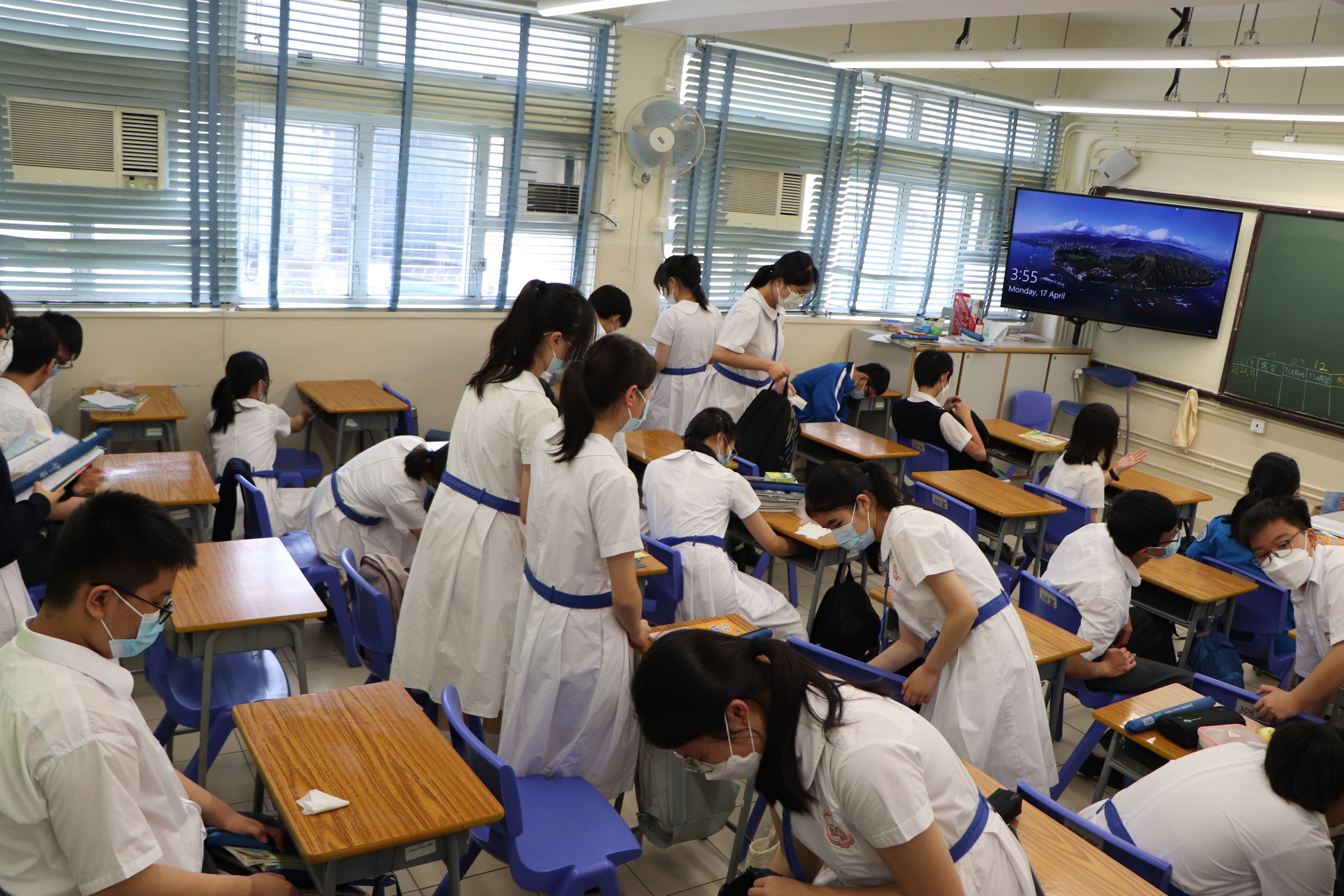 全校學生於4月17日周會後返回自己課室清潔桌椅和整理櫃面,保持校園環境清潔。