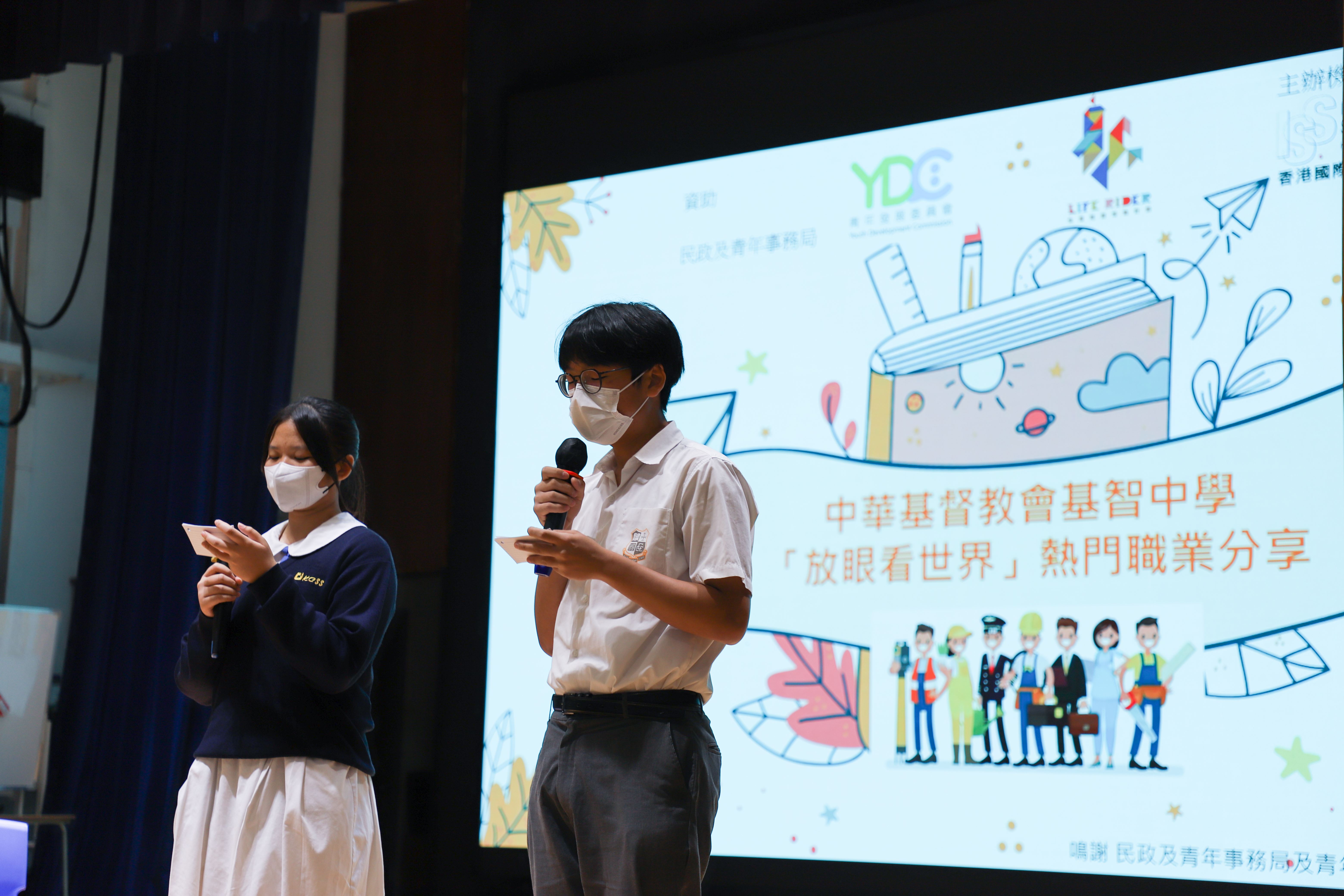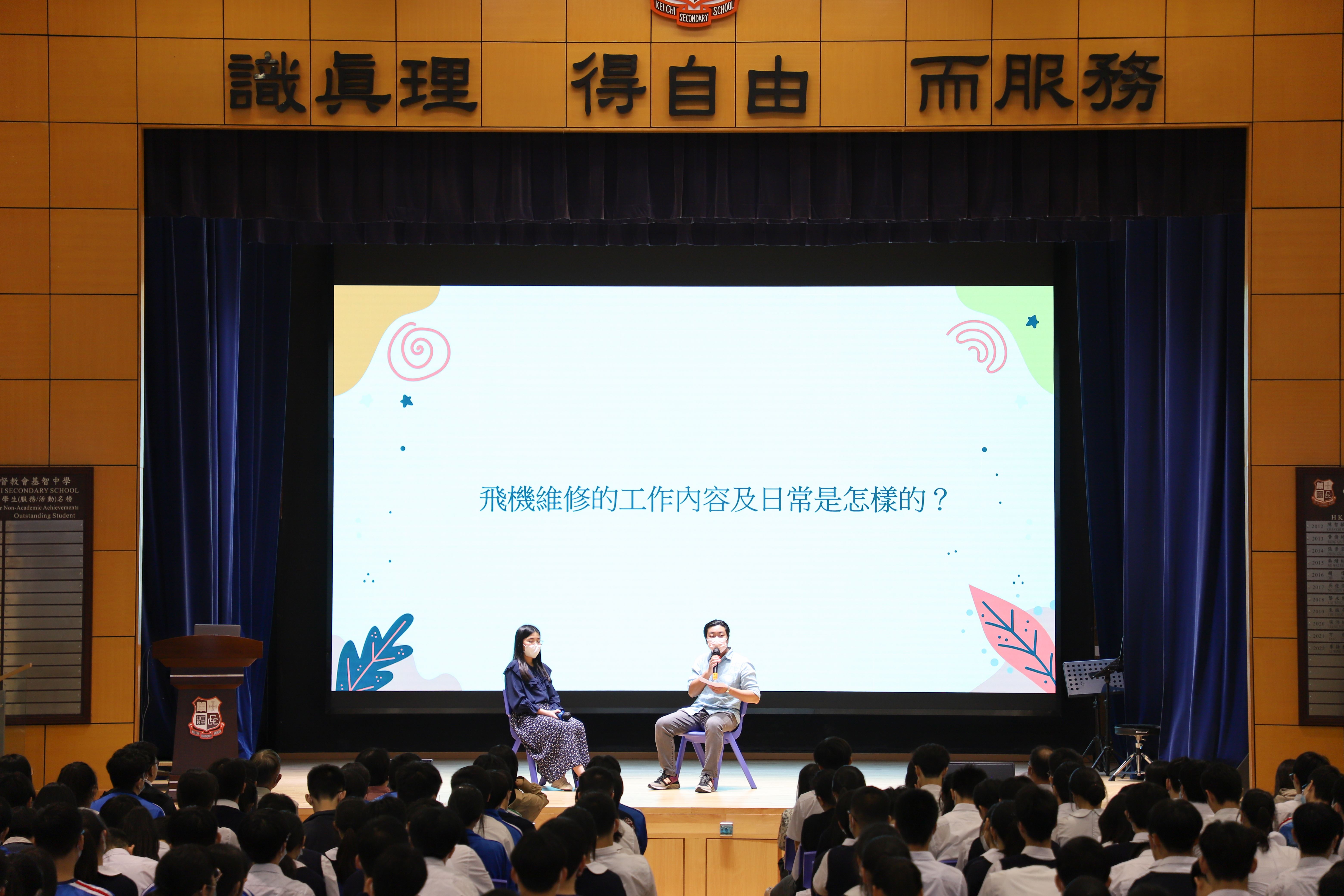 本校於4月17 - 21日舉行價值教育周,全體師生出席主題周會 - 「放眼看世界」,嘉賓介紹護士和飛機維修員的工作內容,亦分享工作生活的苦與樂。同學透過提問與嘉賓交流,從中體會職業生涯應具體「堅毅」和「自律」精神。