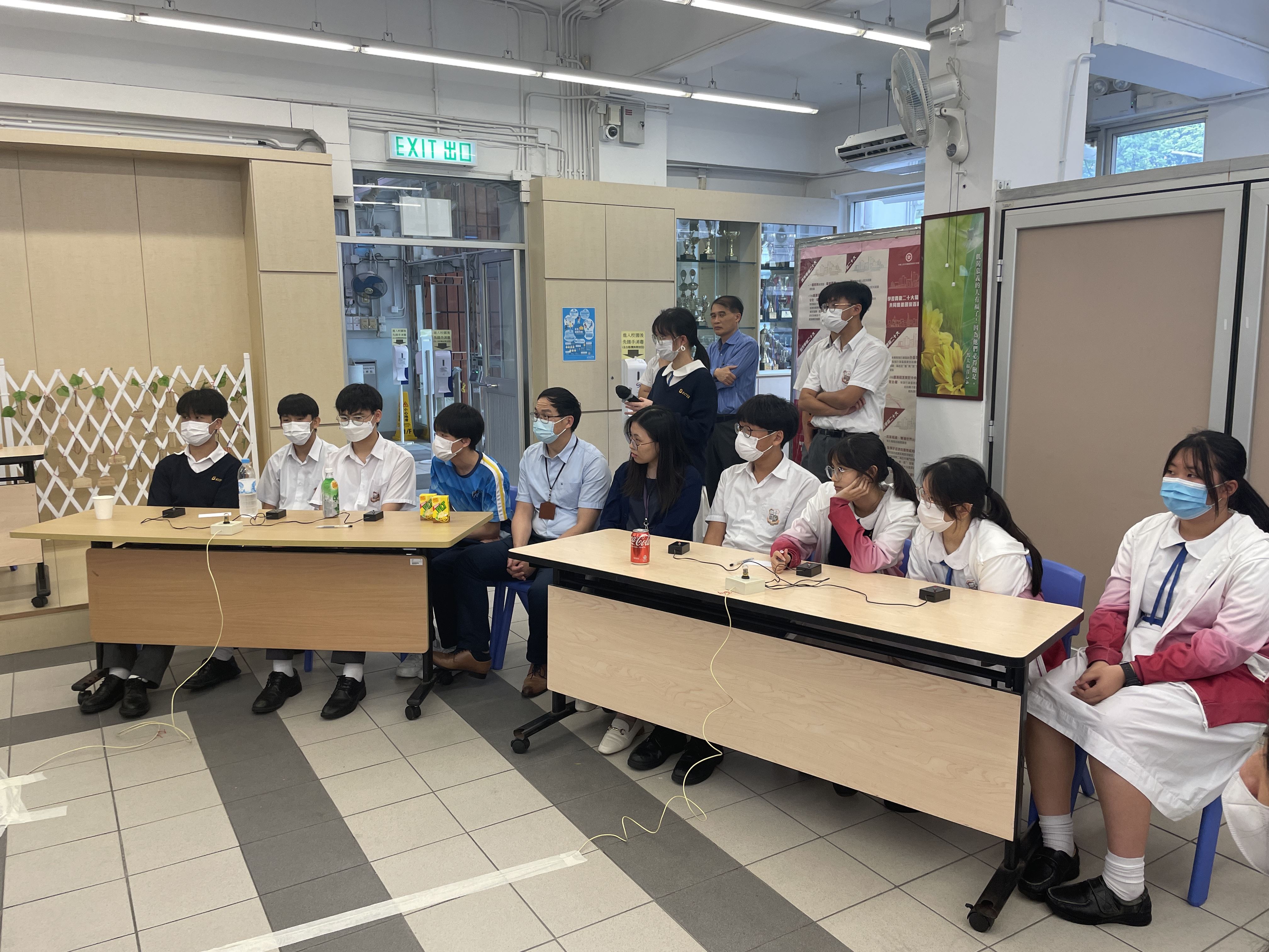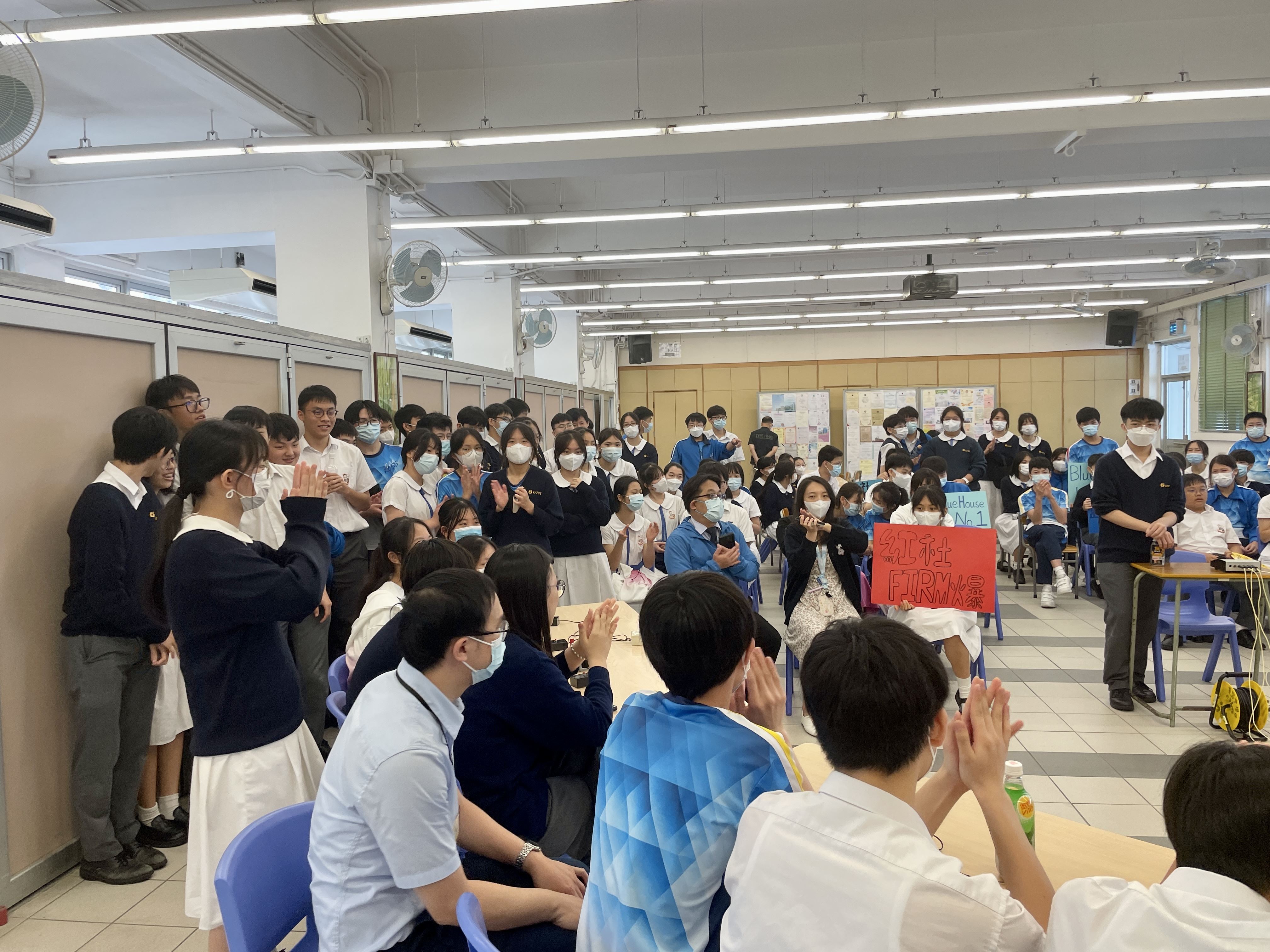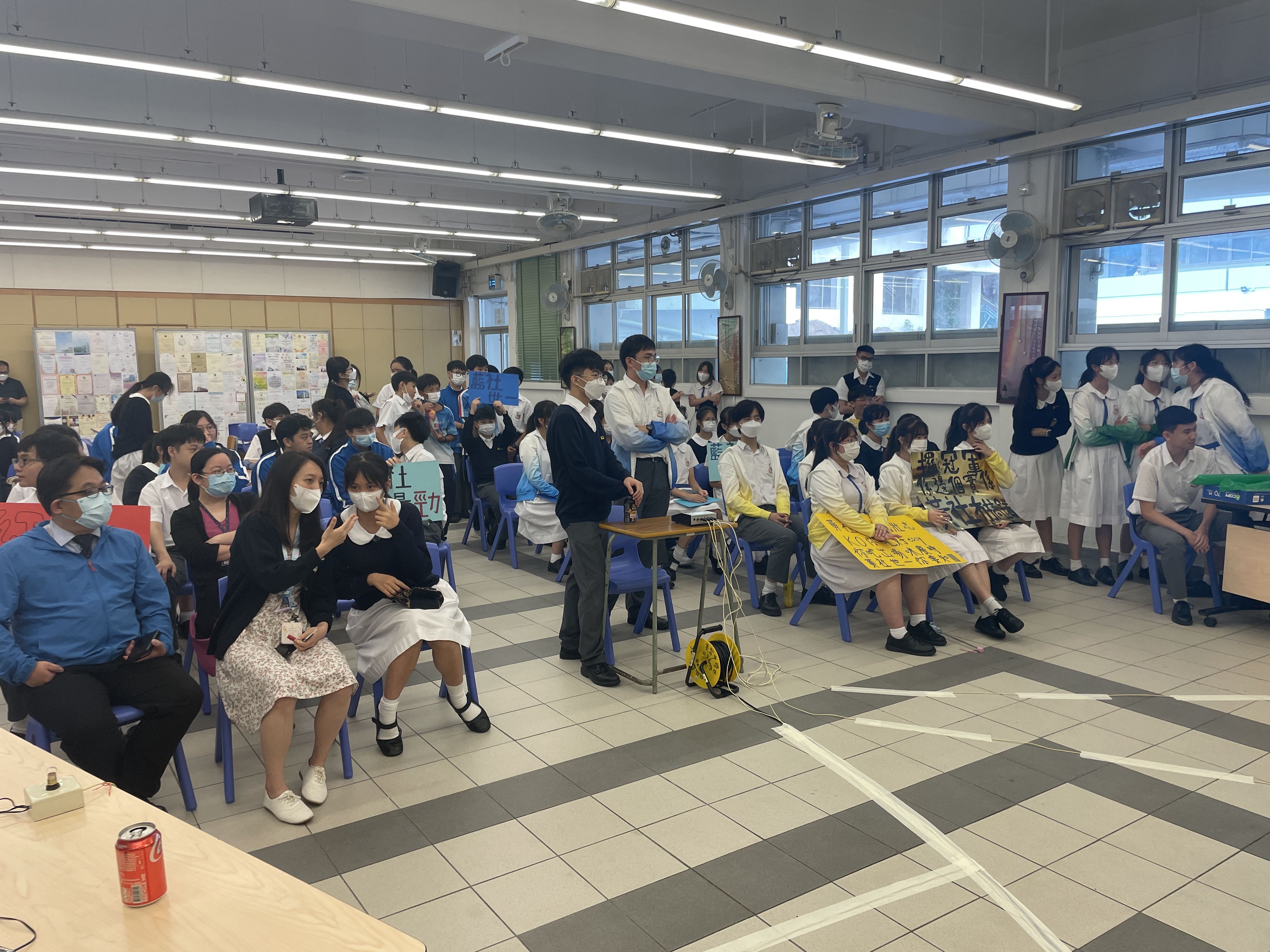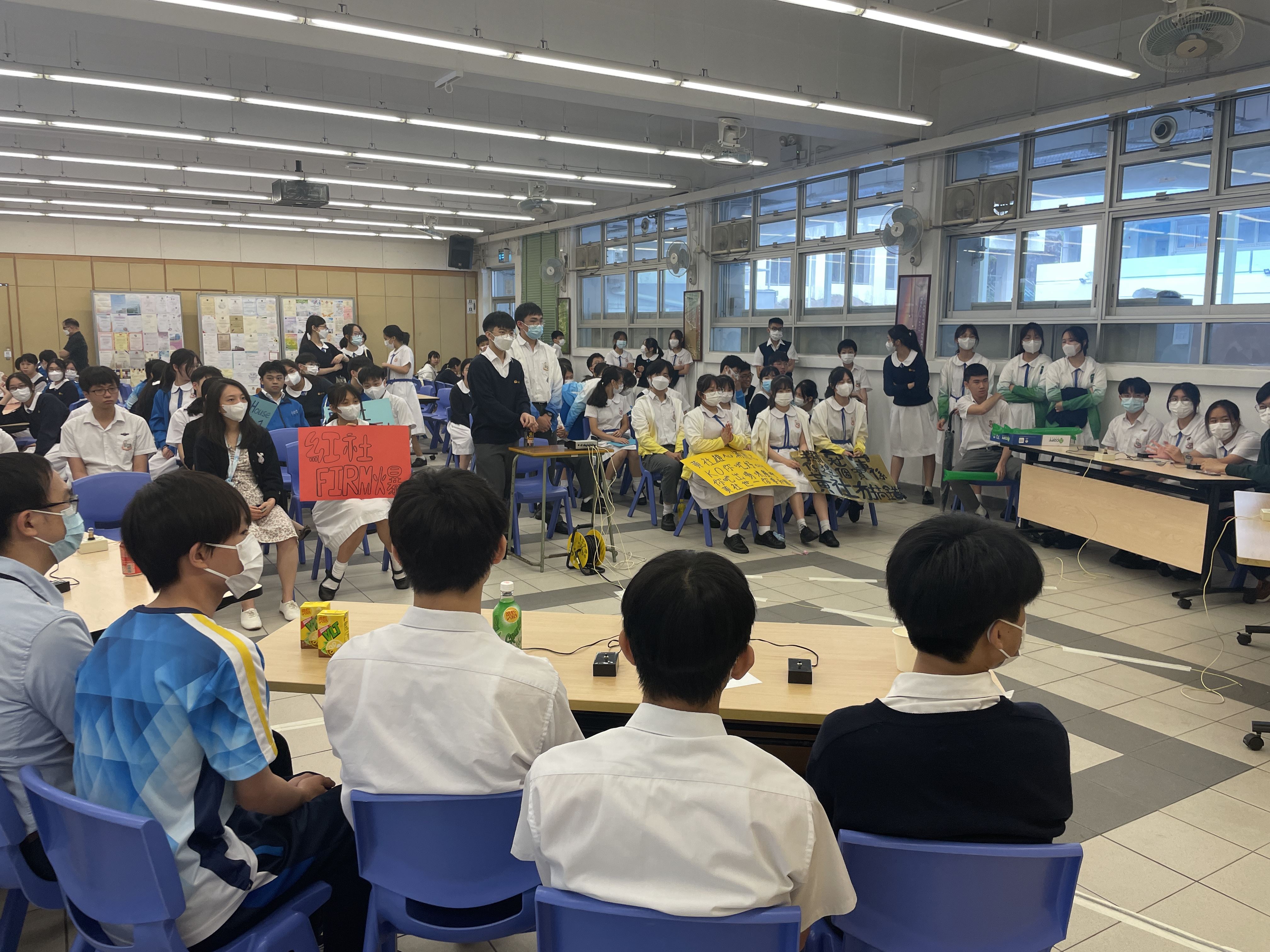 四社代表連同老師組成隊伍進行問答比賽,經過必答及搶答兩輪的問答後,最後由黃社取得第一。