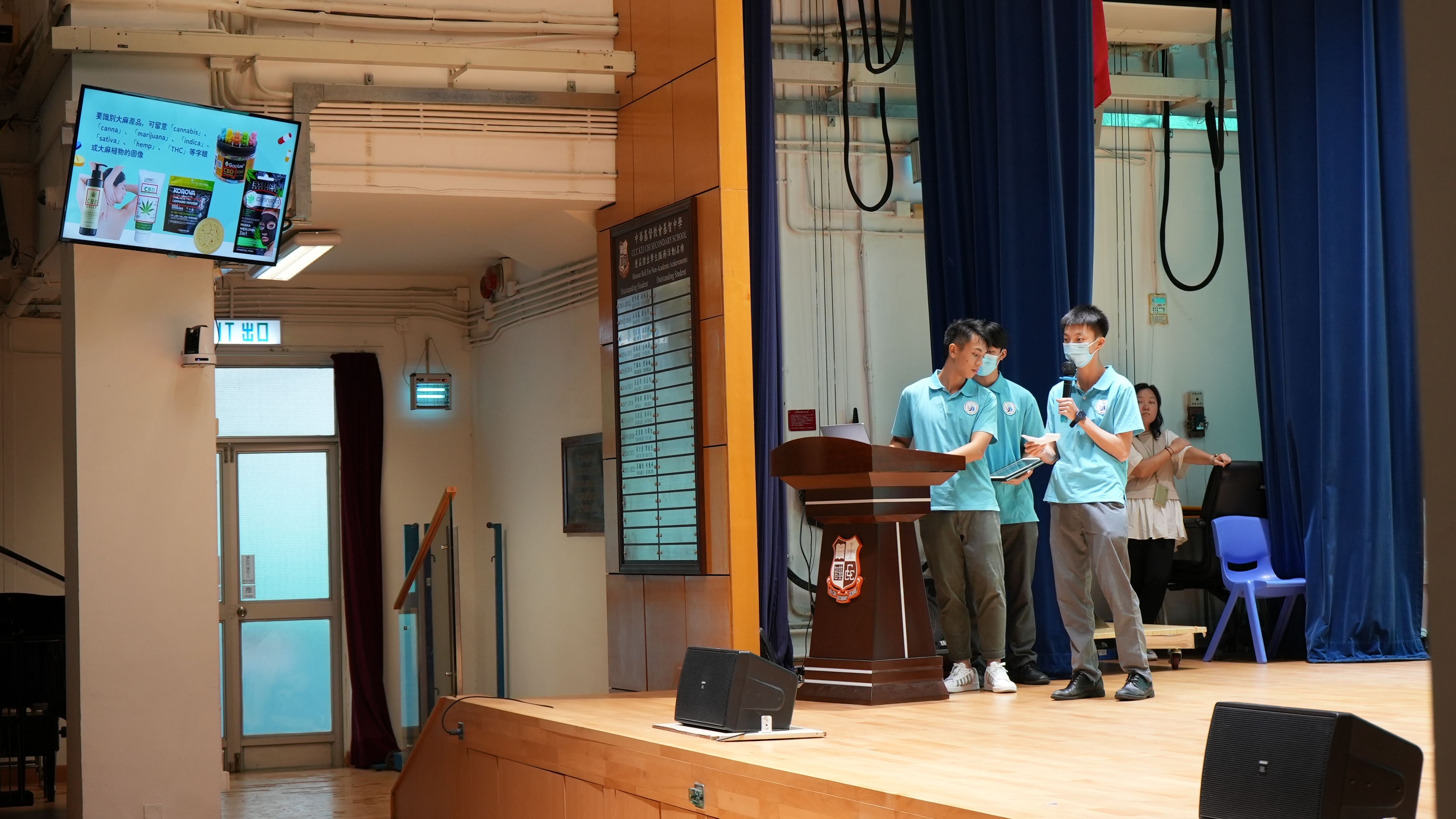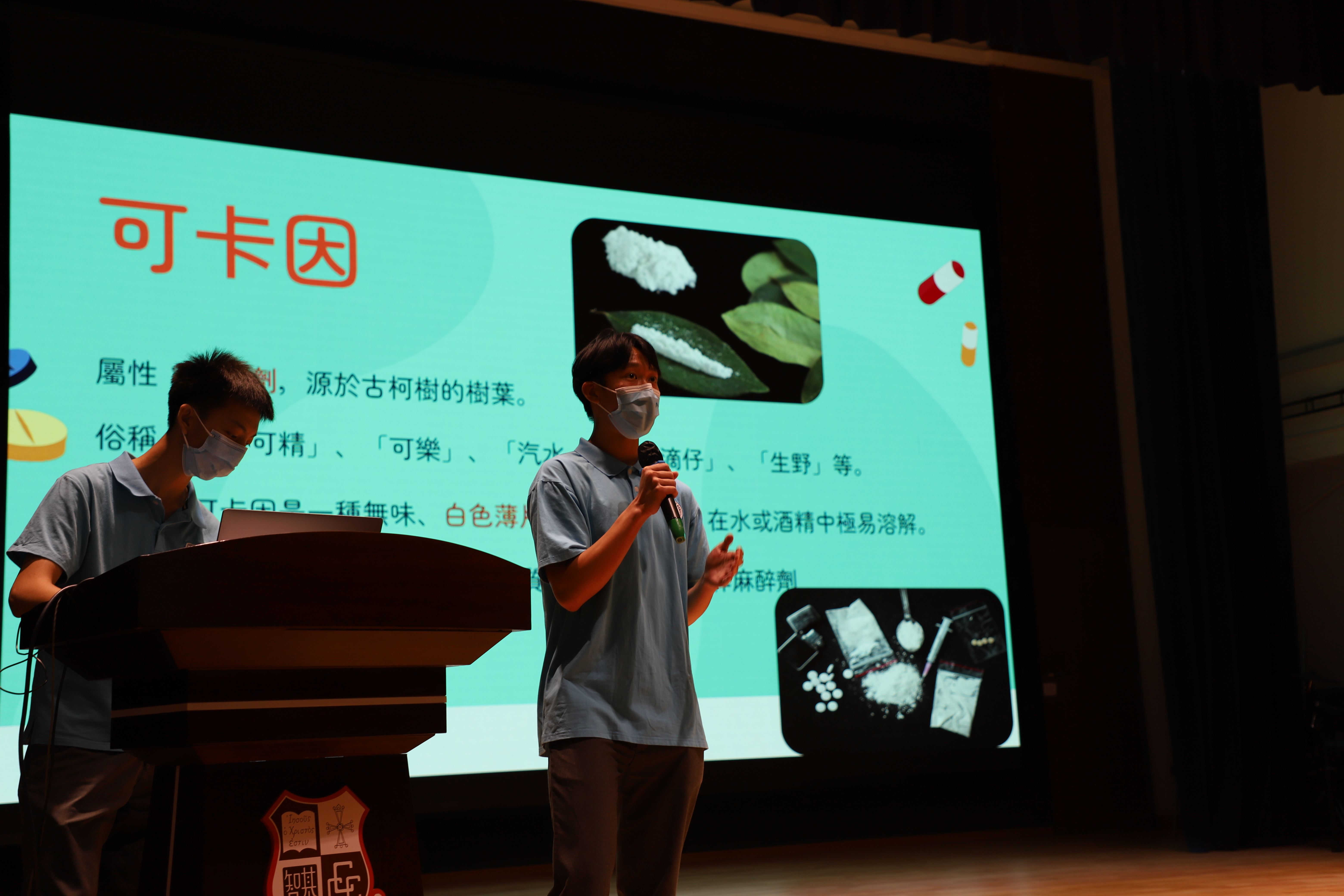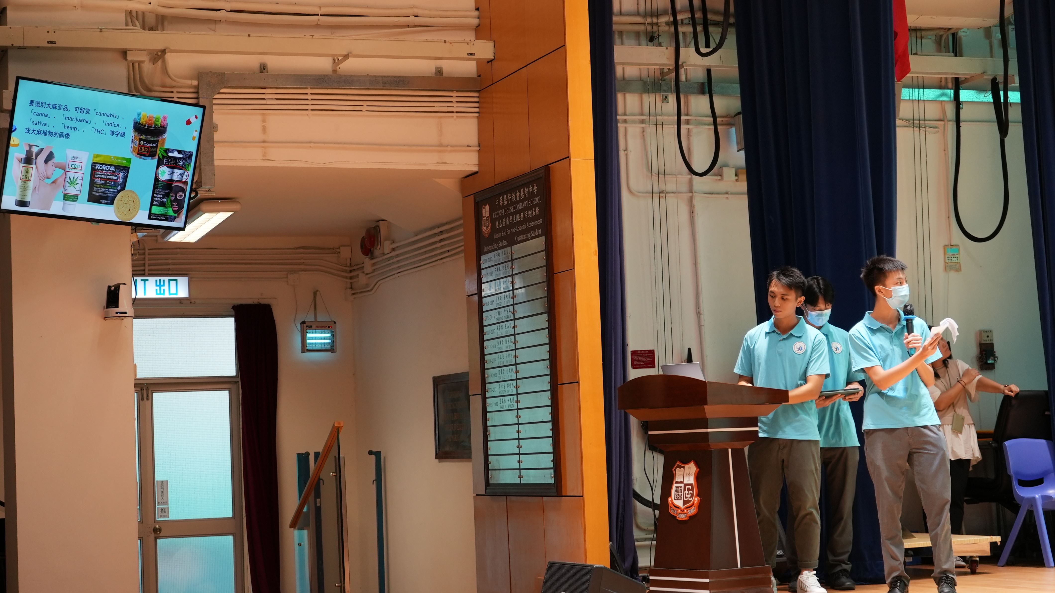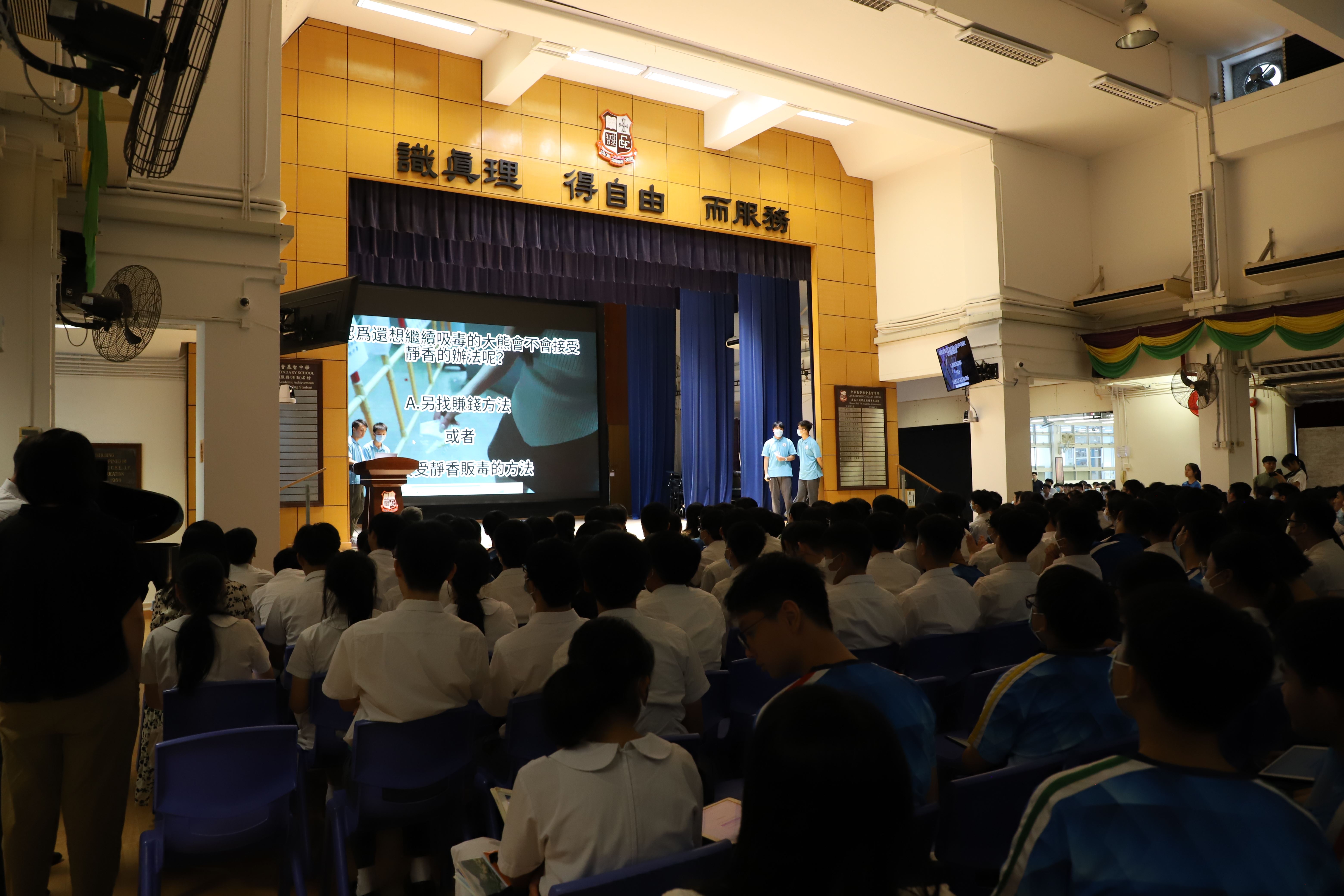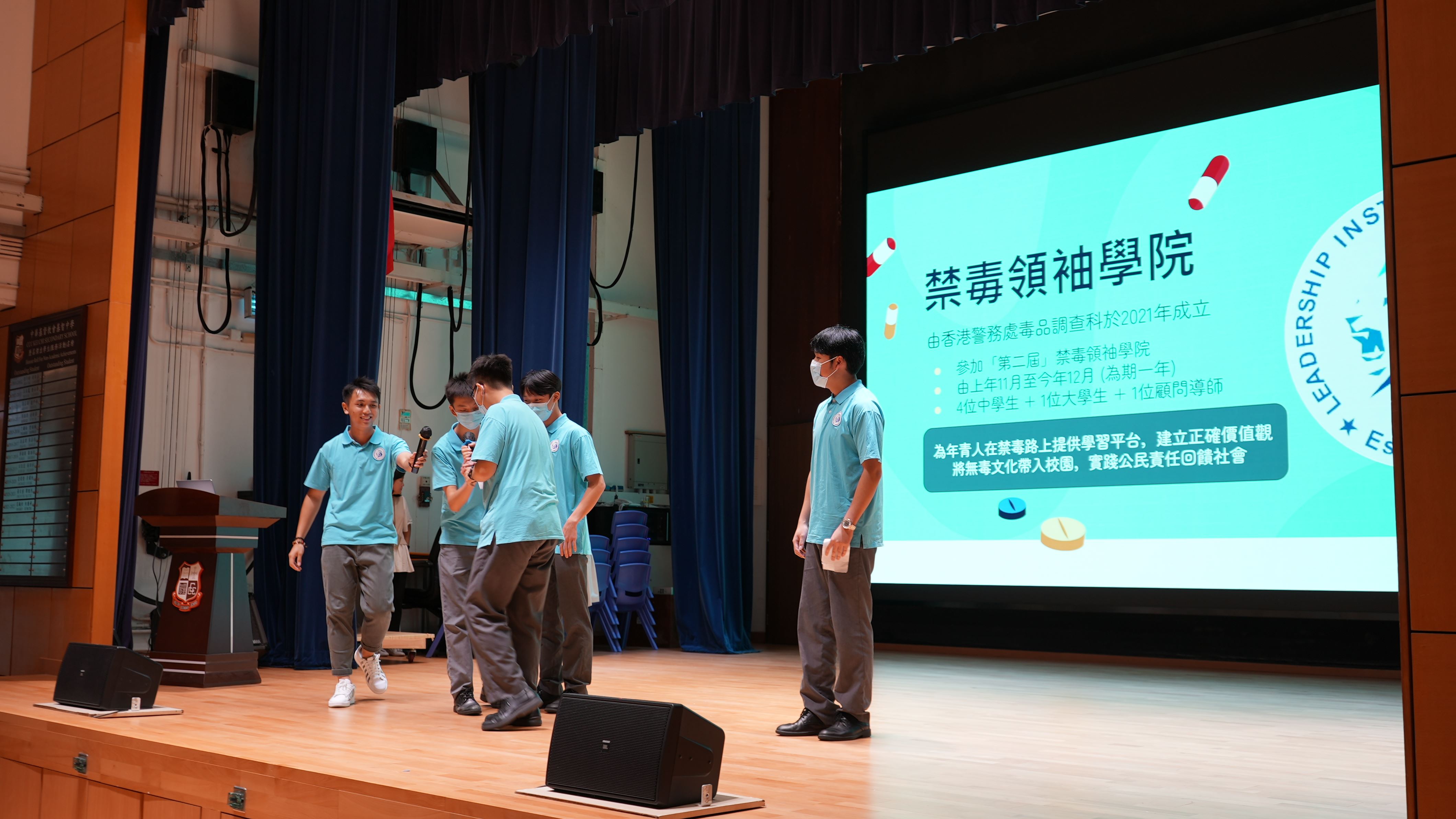 禁毒領袖學院學員大學生卓俊羲 (Jerry)、5A陳鴻坤、5D陳澤鋒、林瑞麒及鄧啓泓於9月11日向全校簡單介紹禁毒領袖學院和青少年最常吸食的毒品。通過觀賞學員精心製作的短片和參與問答及投票互動環節,學生加深對大麻和可卡因的認識,並更加了解吸食毒品帶來的禍害及販賣毒品的刑罰。