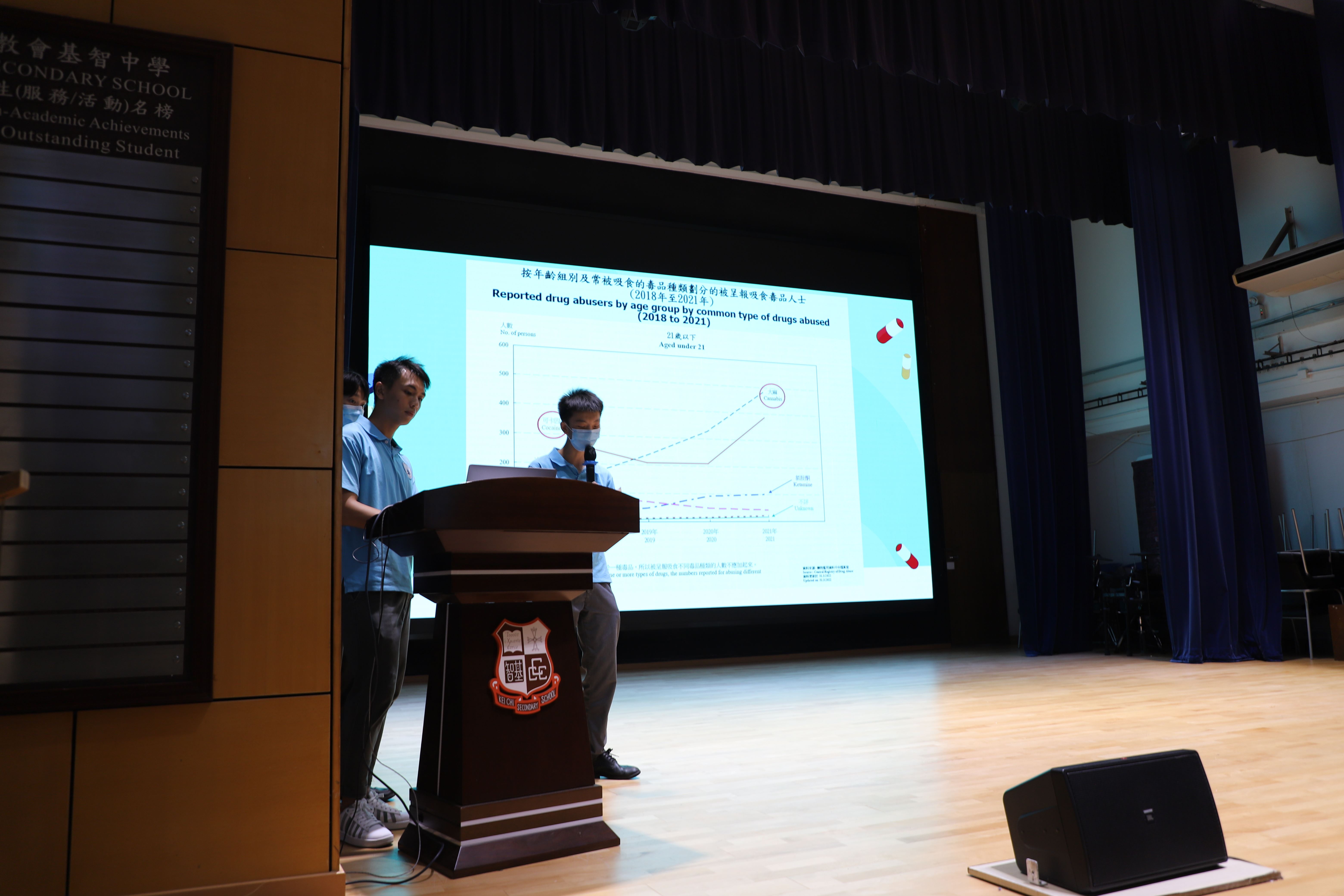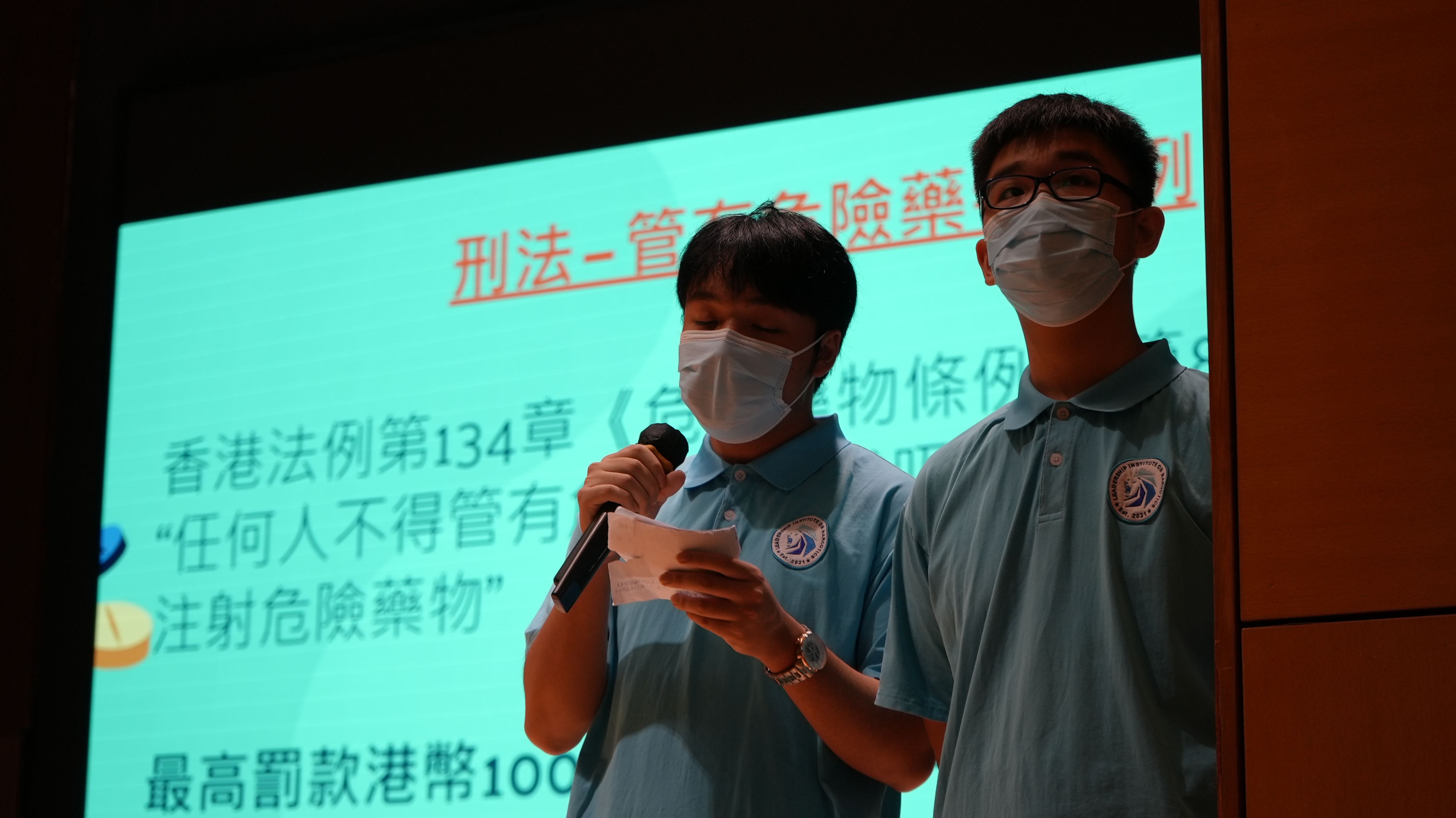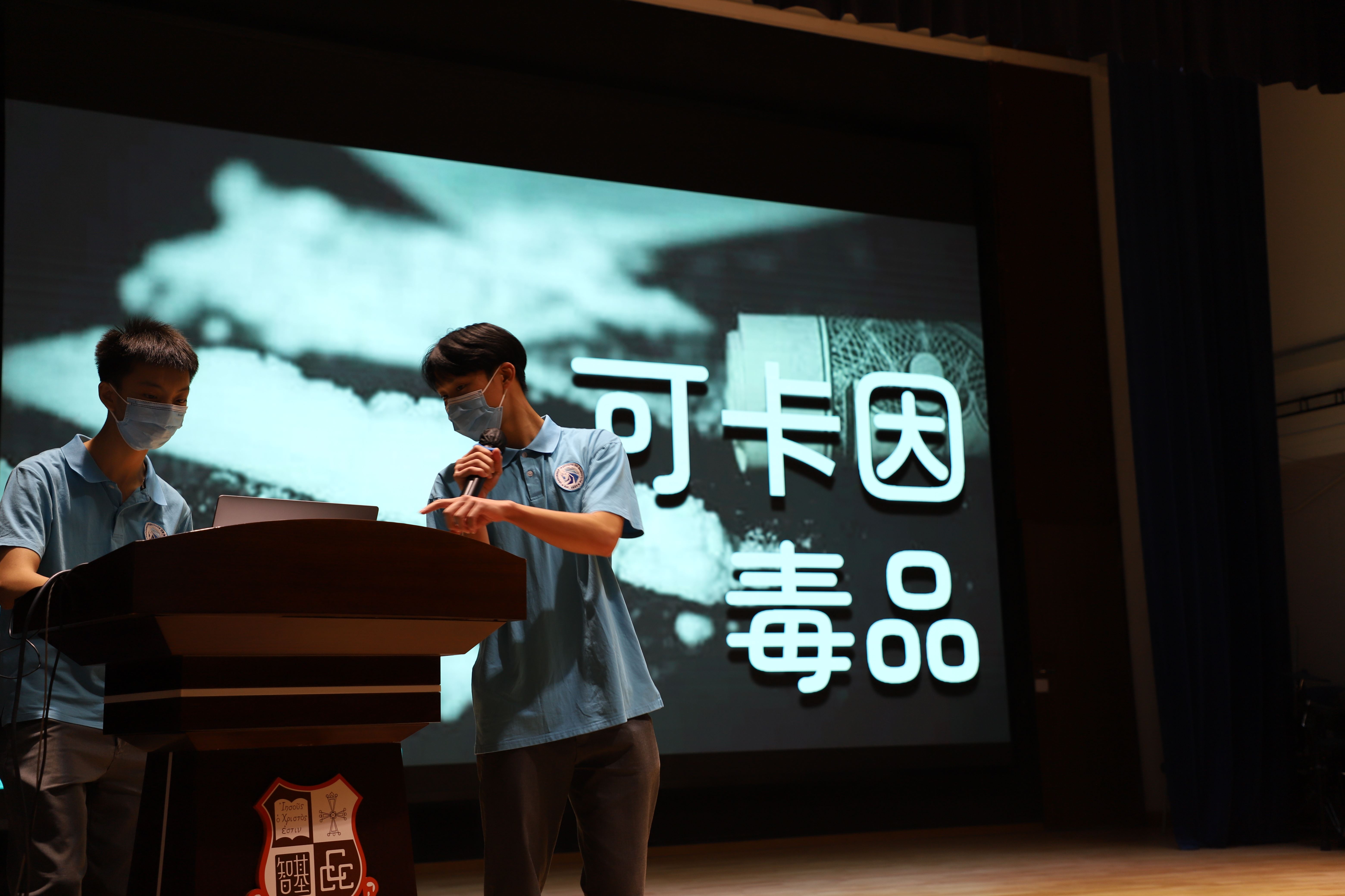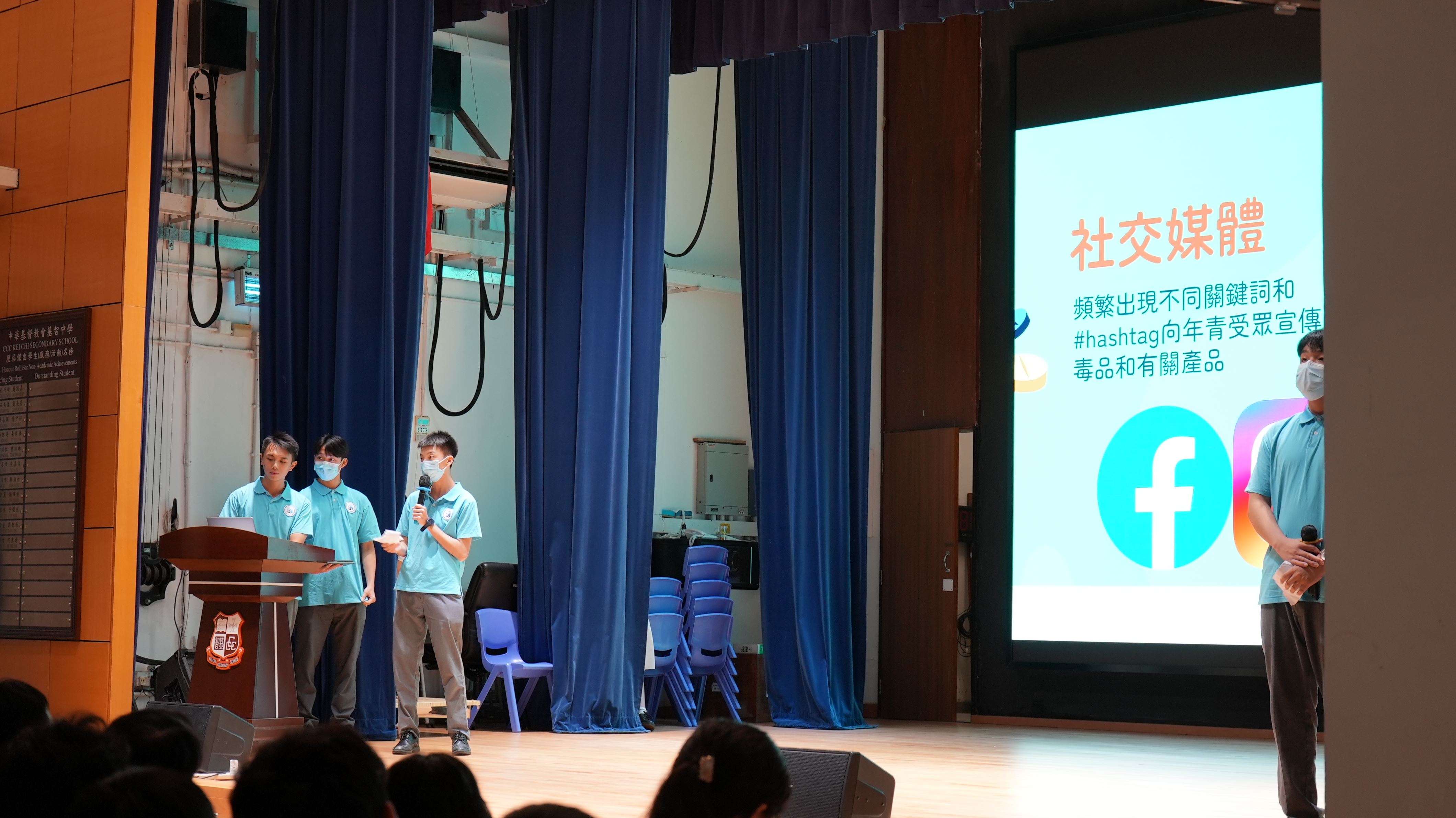 禁毒領袖學院學員大學生卓俊羲 (Jerry)、5A陳鴻坤、5D陳澤鋒、林瑞麒及鄧啓泓於9月11日向全校簡單介紹禁毒領袖學院和青少年最常吸食的毒品。通過觀賞學員精心製作的短片和參與問答及投票互動環節,學生加深對大麻和可卡因的認識,並更加了解吸食毒品帶來的禍害及販賣毒品的刑罰。