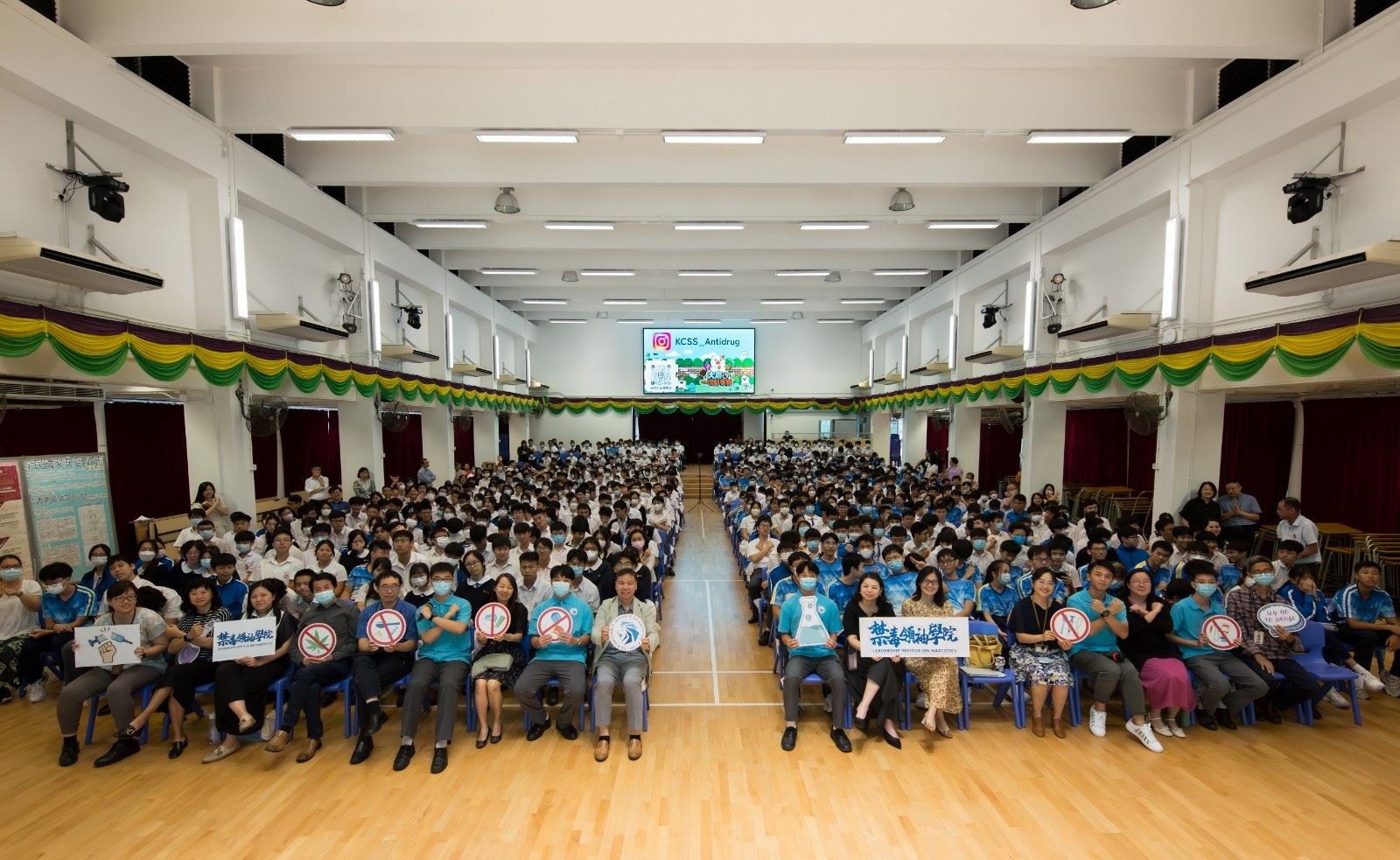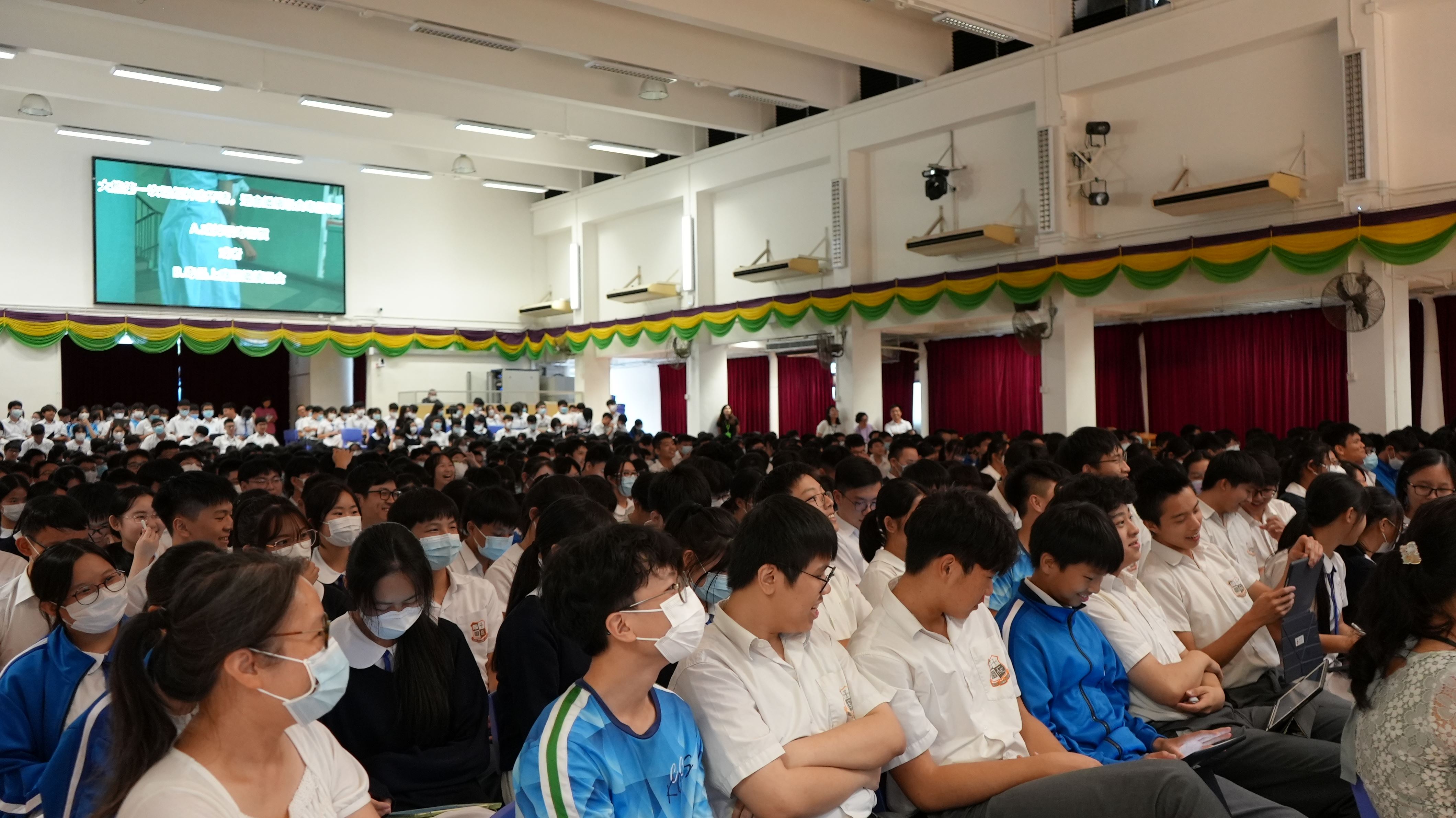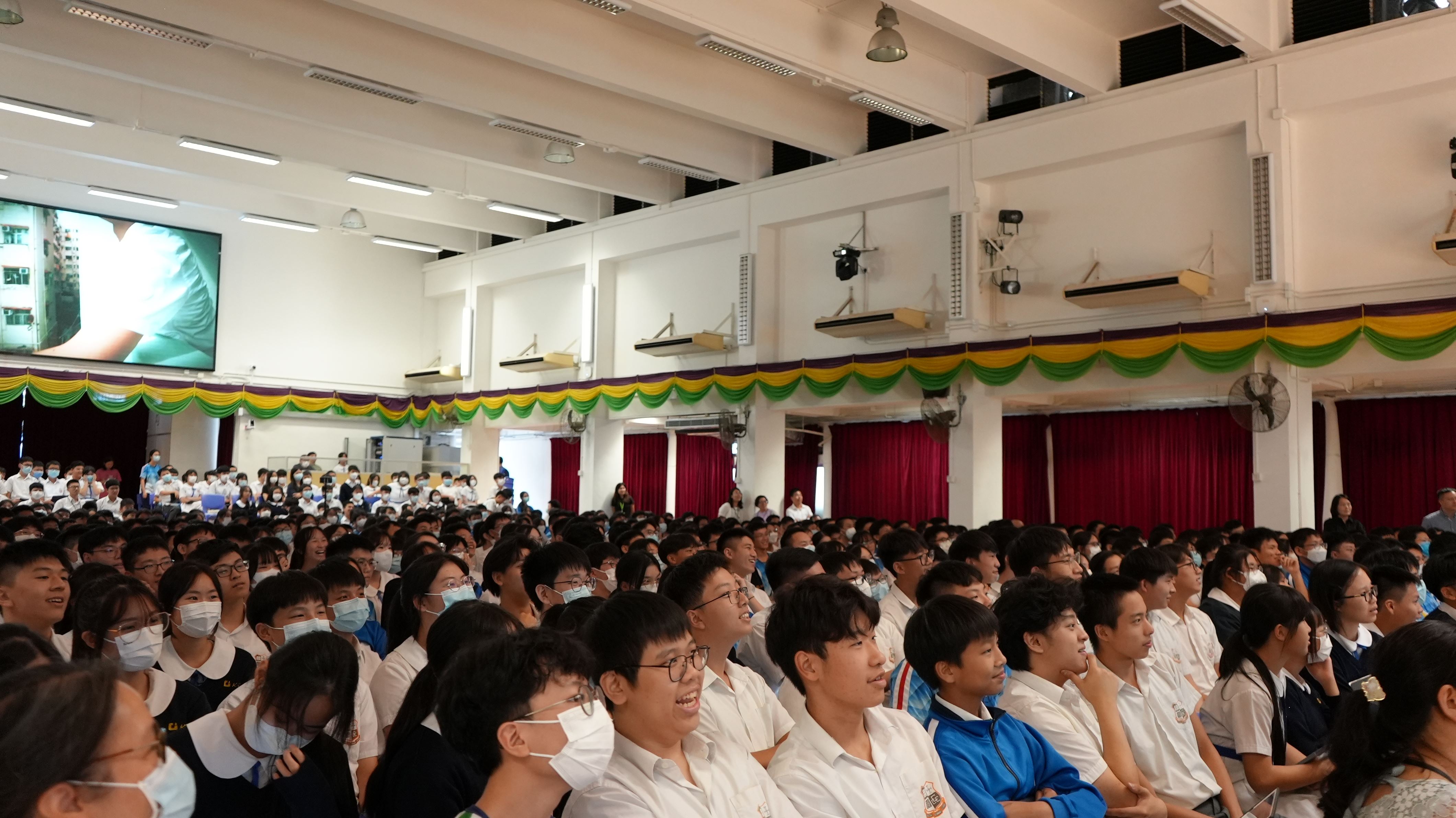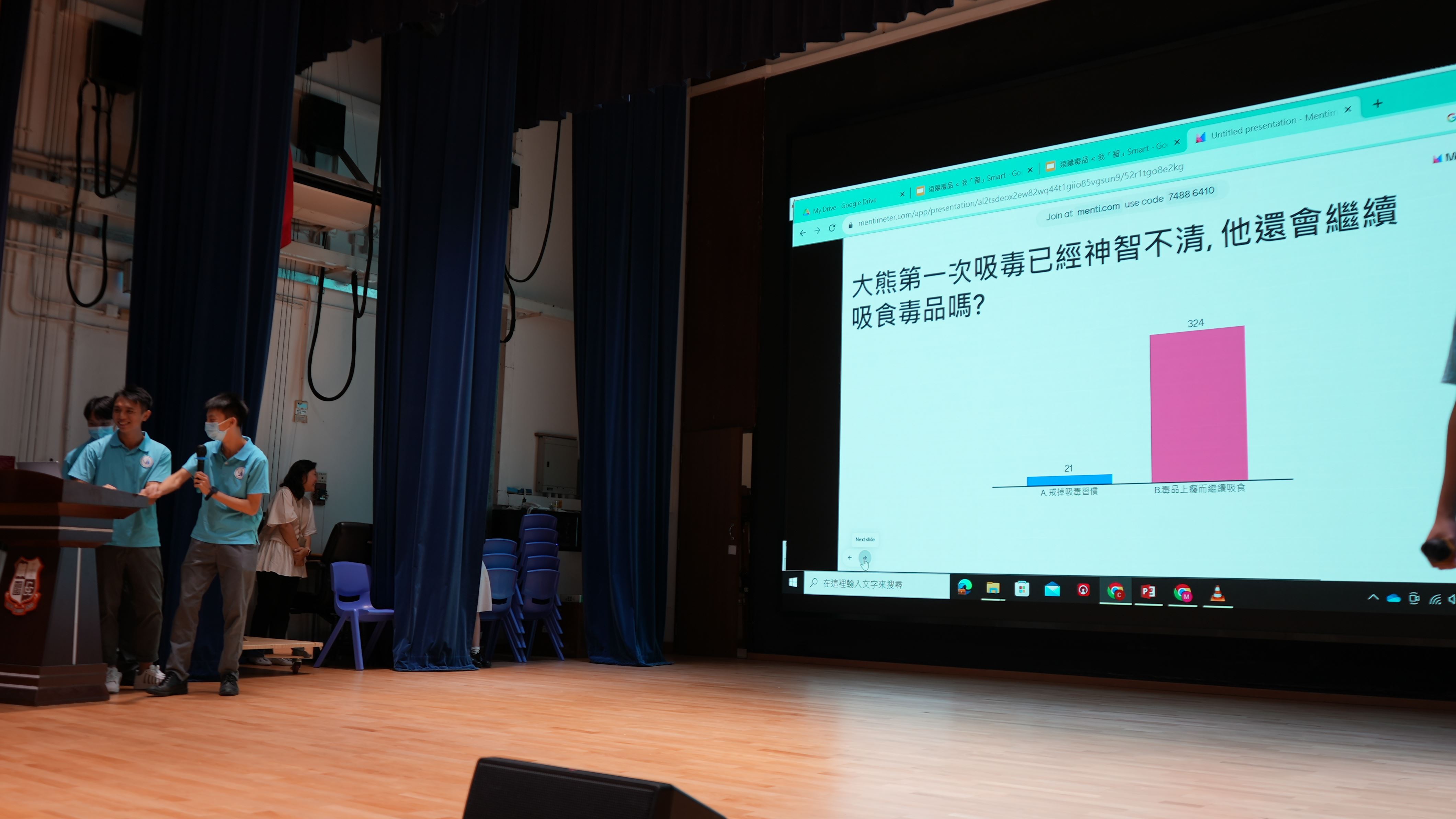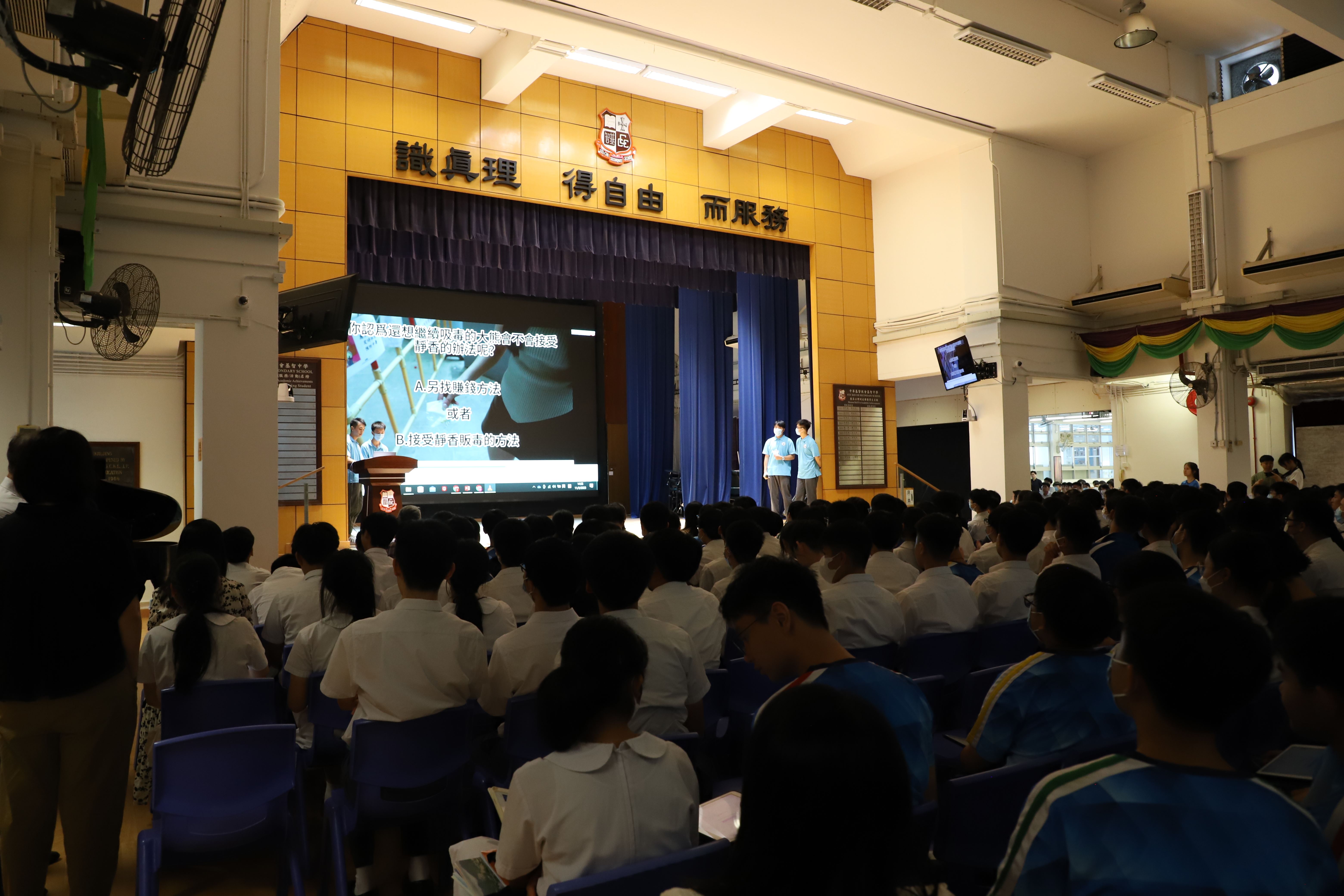 禁毒領袖學院學員大學生卓俊羲 (Jerry)、5A陳鴻坤、5D陳澤鋒、林瑞麒及鄧啓泓於9月11日向全校簡單介紹禁毒領袖學院和青少年最常吸食的毒品。通過觀賞學員精心製作的短片和參與問答及投票互動環節,學生加深對大麻和可卡因的認識,並更加了解吸食毒品帶來的禍害及販賣毒品的刑罰。