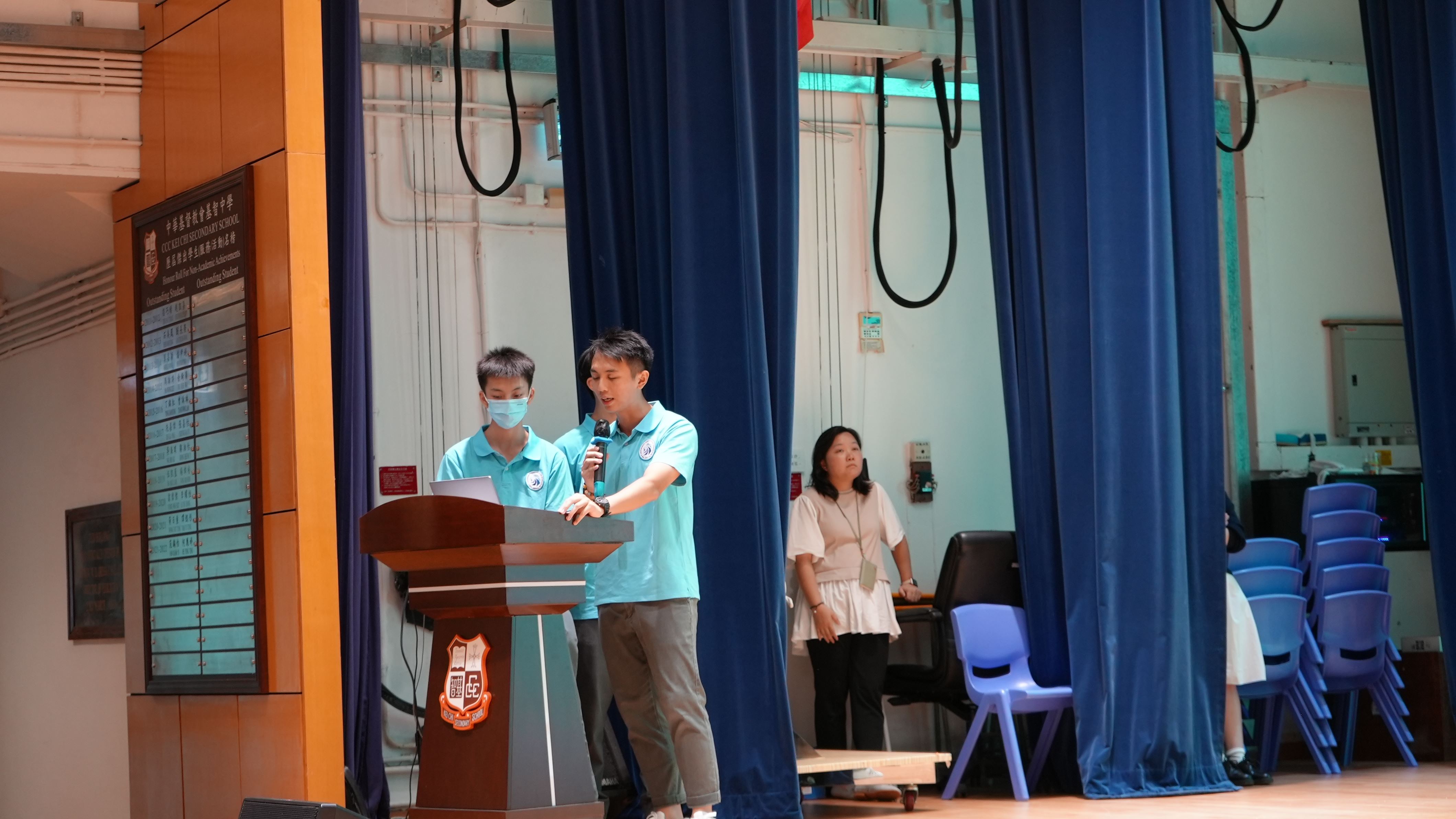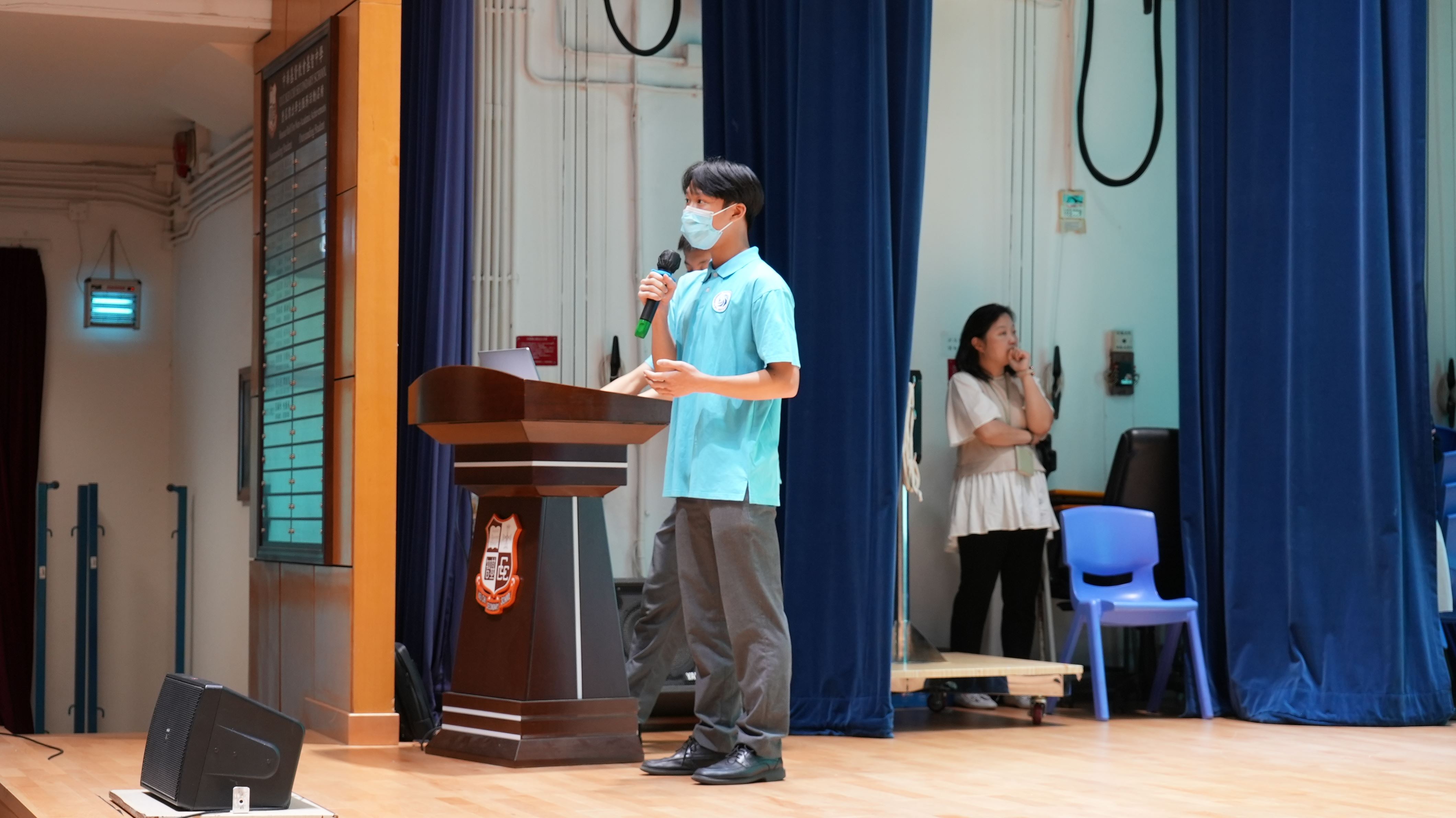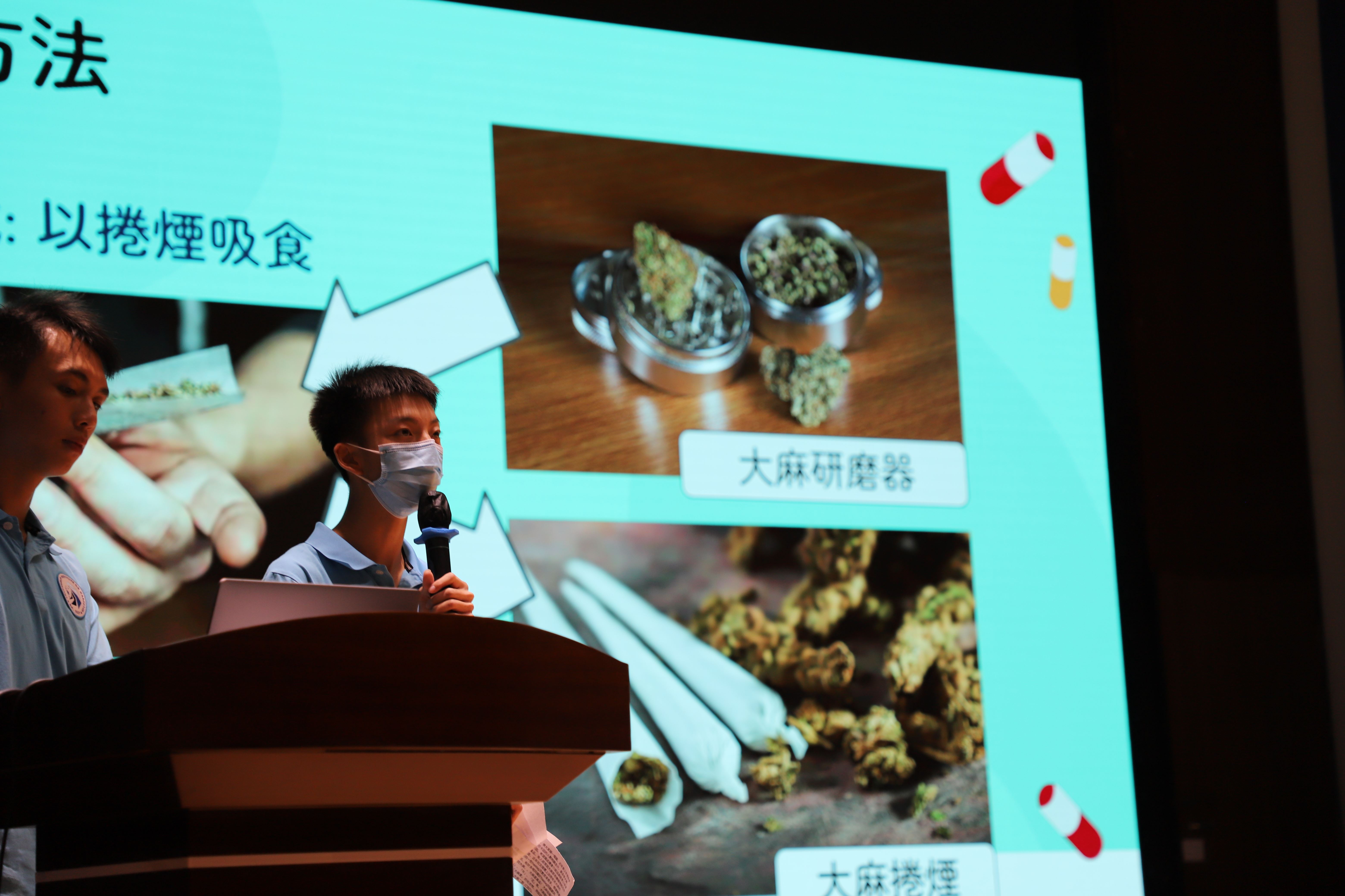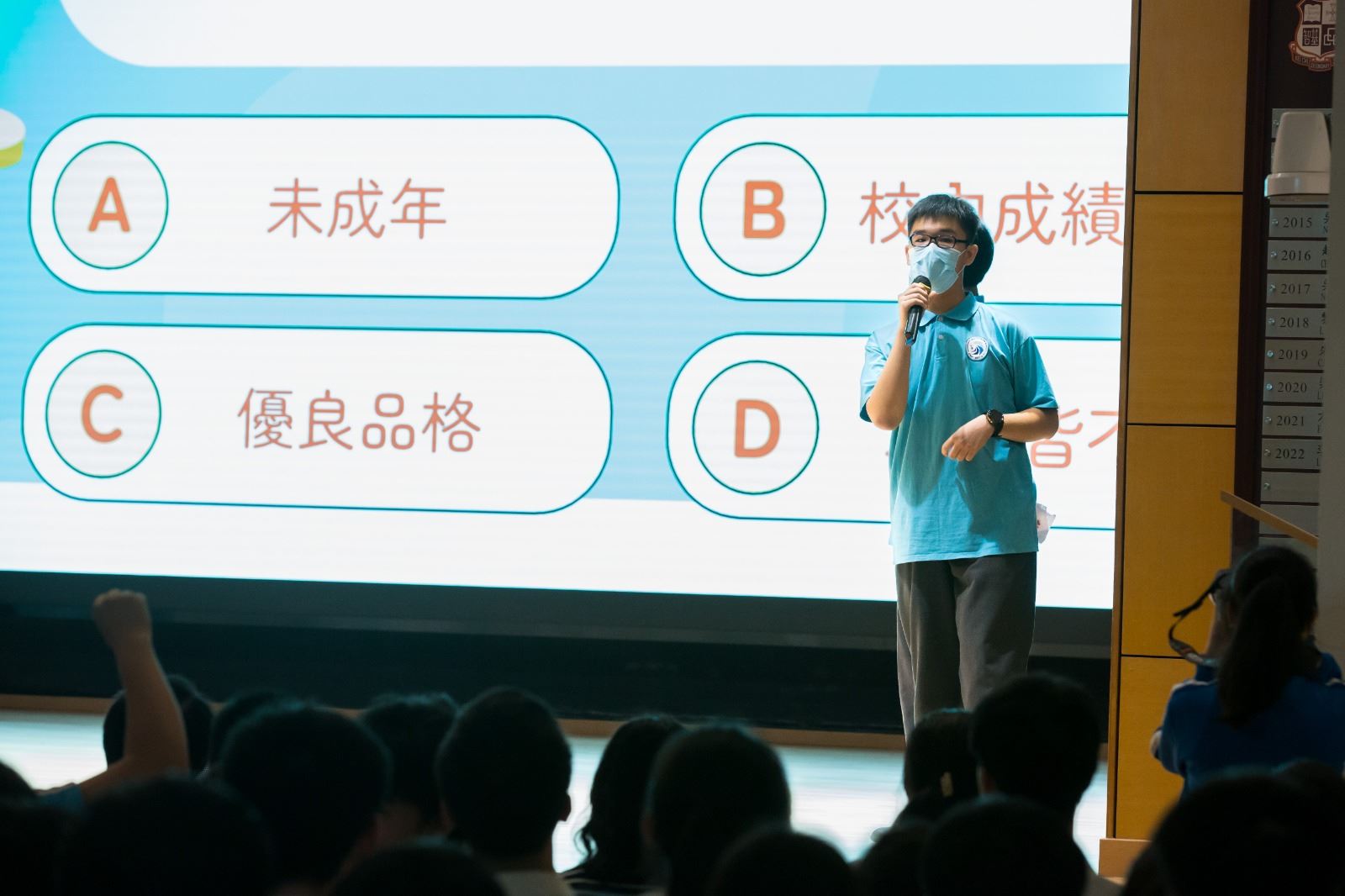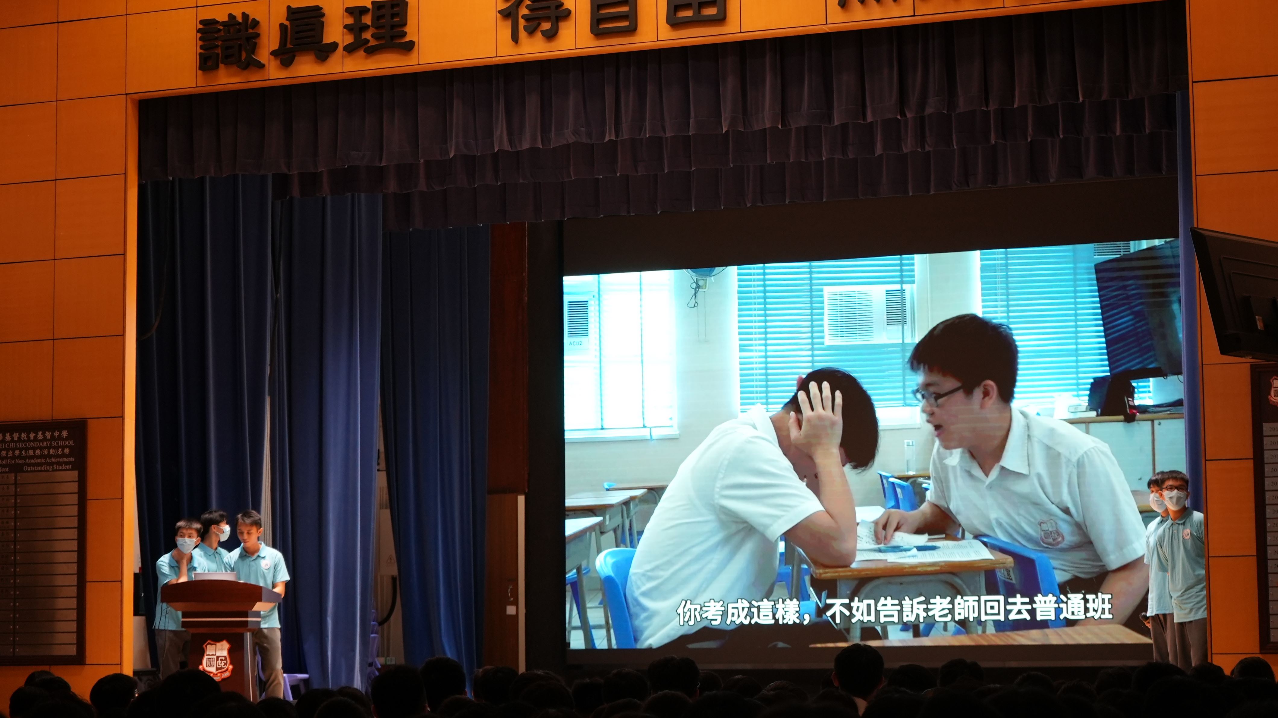 禁毒領袖學院學員大學生卓俊羲 (Jerry)、5A陳鴻坤、5D陳澤鋒、林瑞麒及鄧啓泓於9月11日向全校簡單介紹禁毒領袖學院和青少年最常吸食的毒品。通過觀賞學員精心製作的短片和參與問答及投票互動環節,學生加深對大麻和可卡因的認識,並更加了解吸食毒品帶來的禍害及販賣毒品的刑罰。