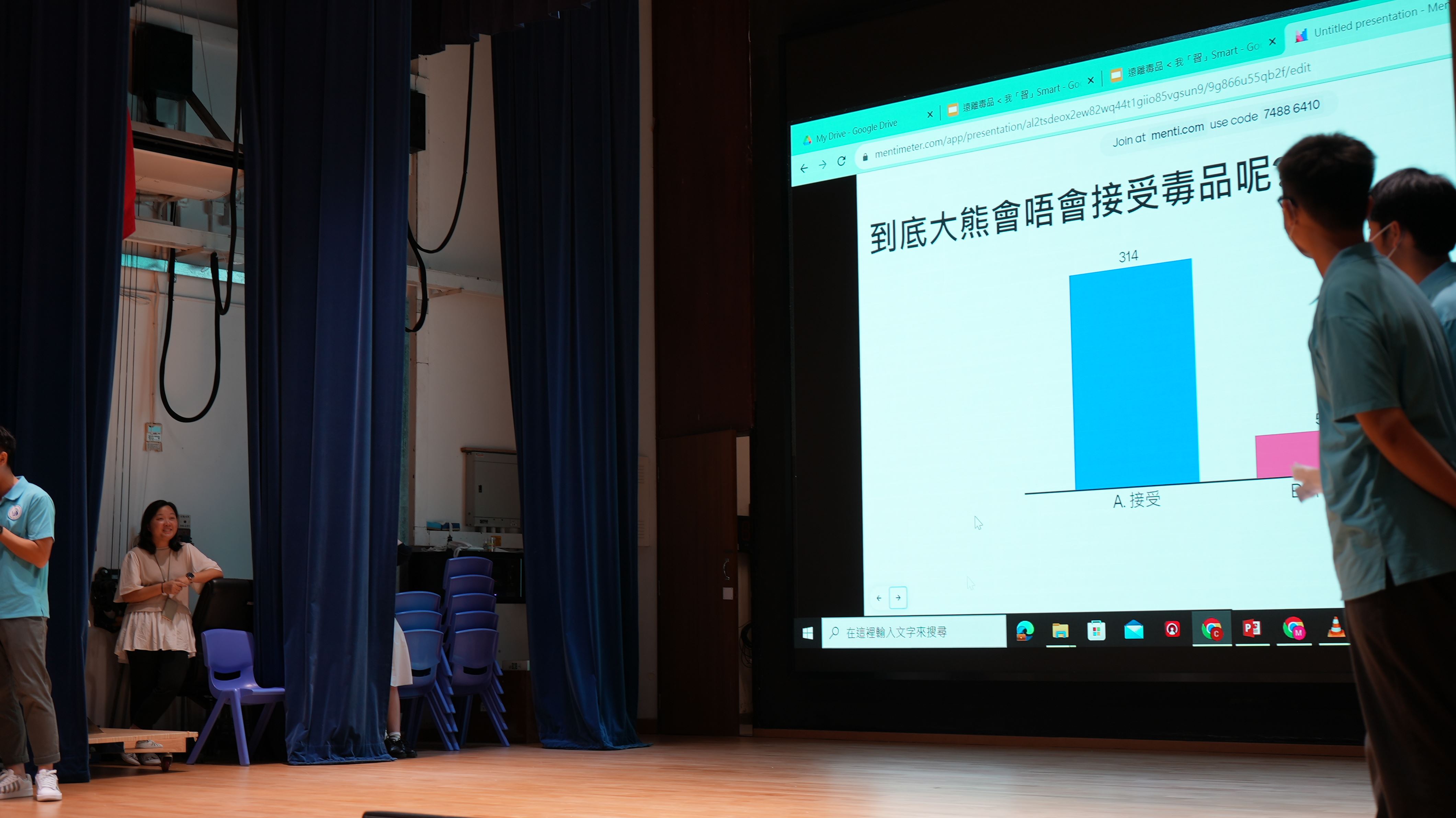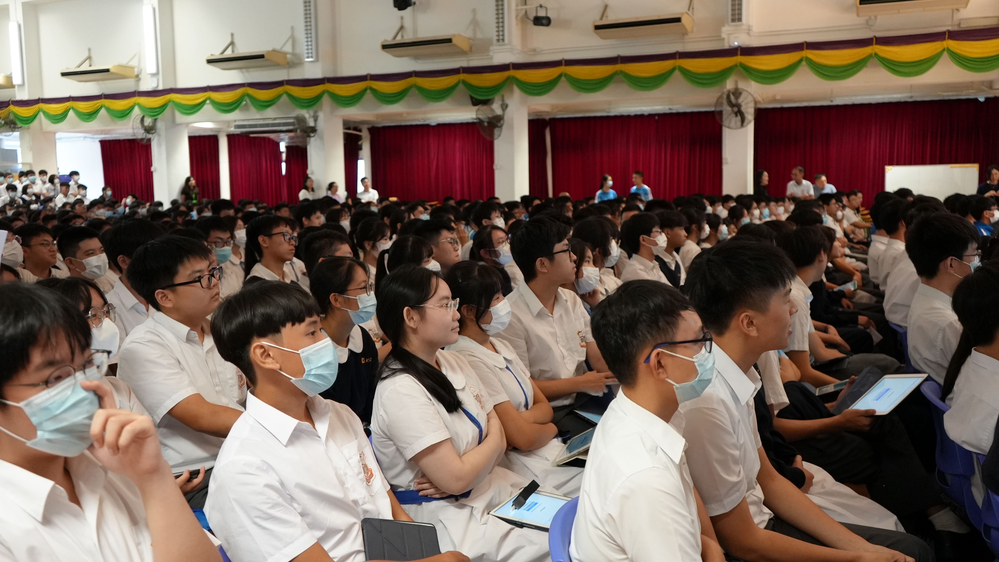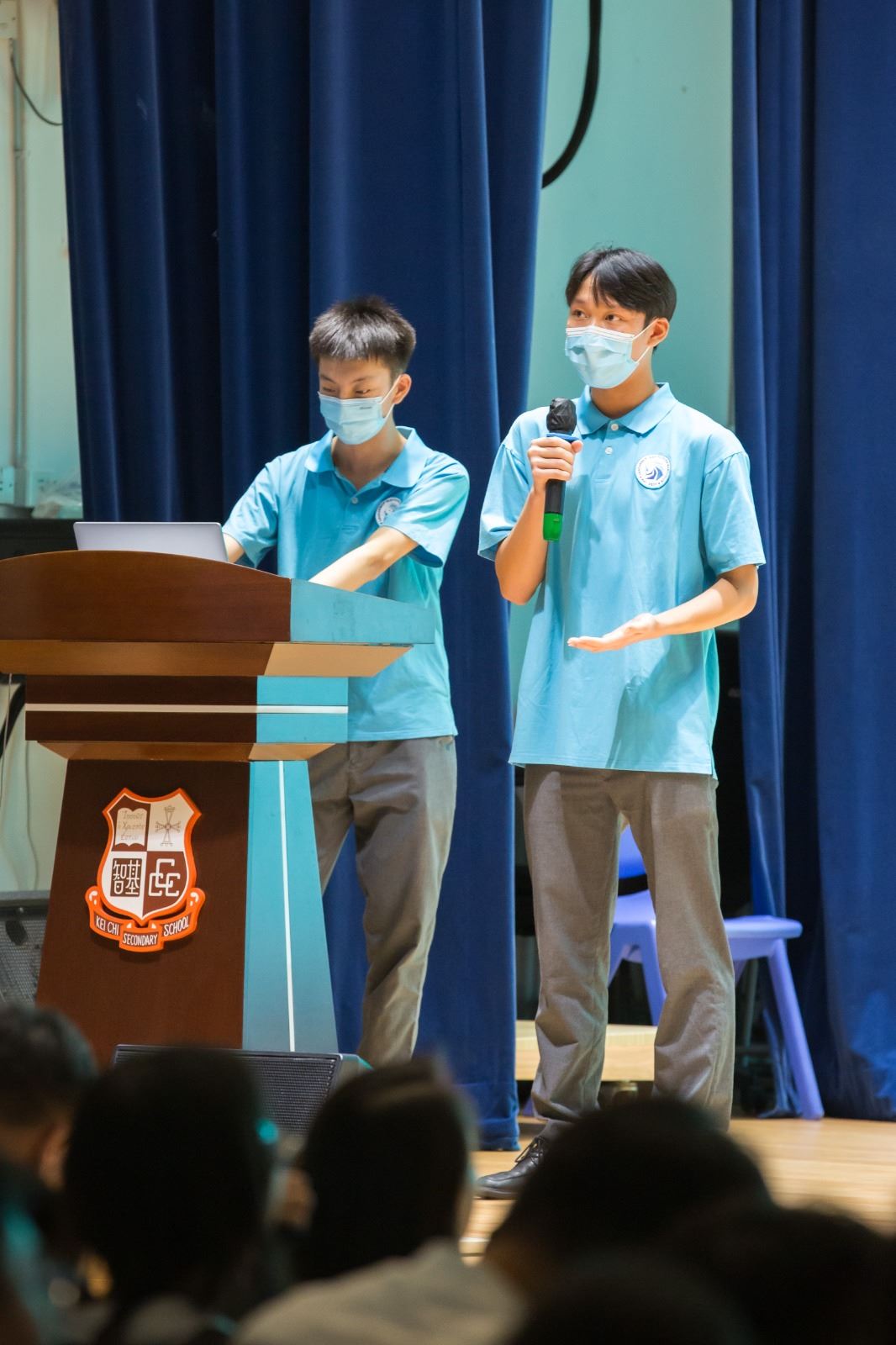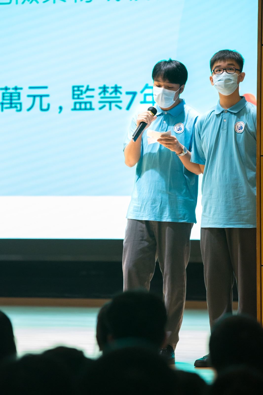 禁毒領袖學院學員大學生卓俊羲 (Jerry)、5A陳鴻坤、5D陳澤鋒、林瑞麒及鄧啓泓於9月11日向全校簡單介紹禁毒領袖學院和青少年最常吸食的毒品。通過觀賞學員精心製作的短片和參與問答及投票互動環節,學生加深對大麻和可卡因的認識,並更加了解吸食毒品帶來的禍害及販賣毒品的刑罰。