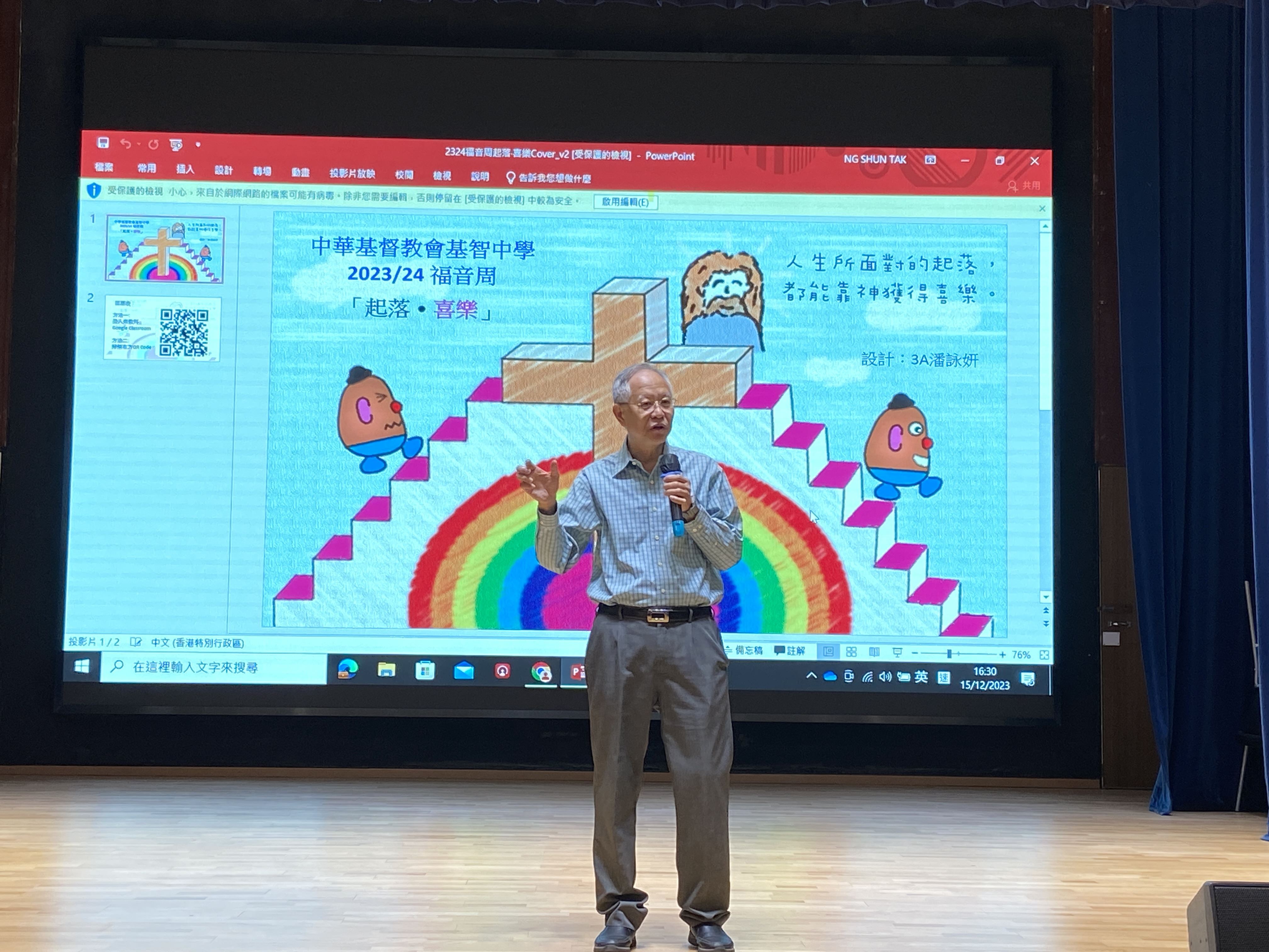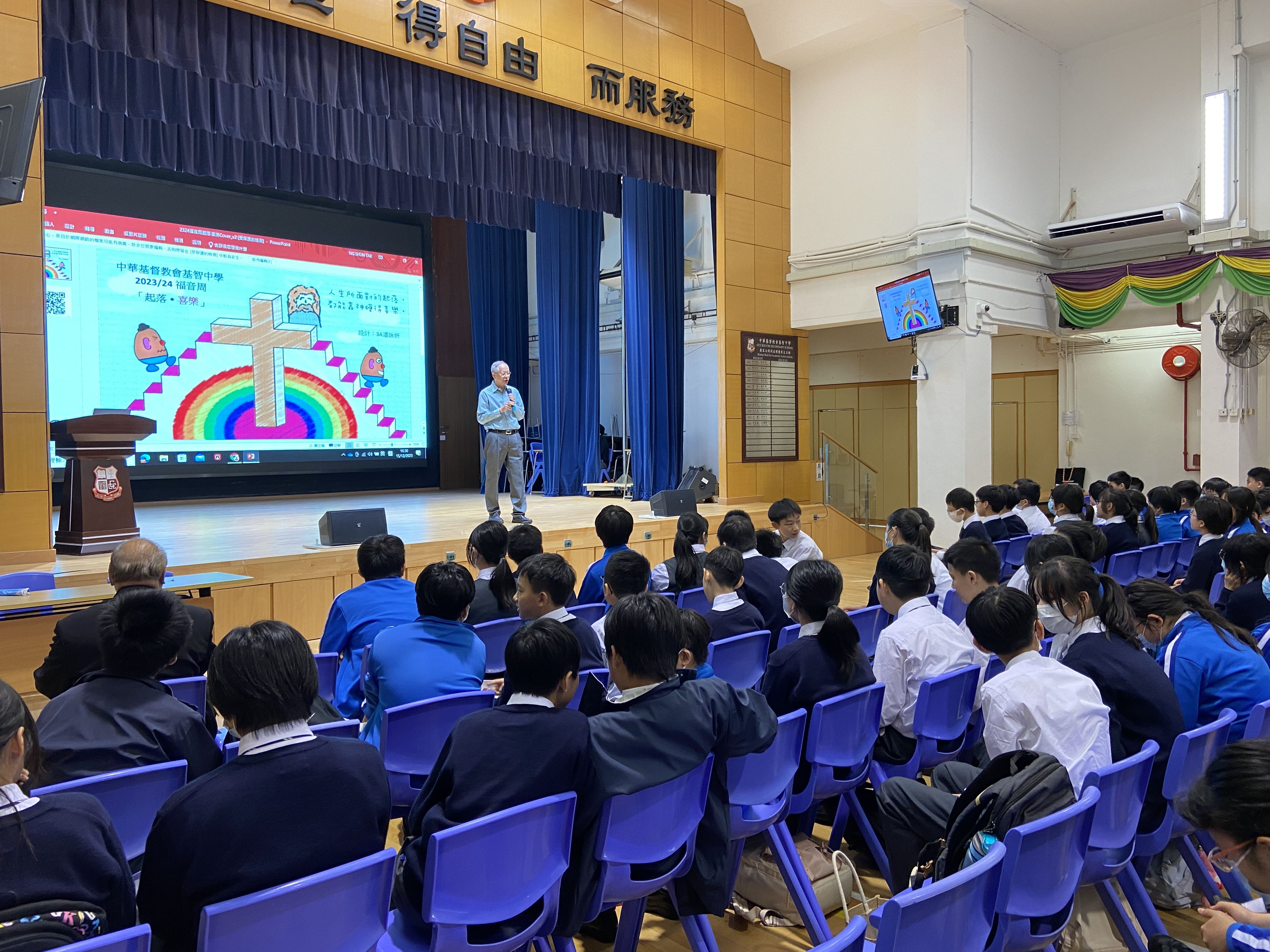 福音周的第四天在12月15日。中午時段我們舉辦了喜勢玩2.0。這次同學可以再一次參與不同的攤位遊戲及換領豐富禮物。放學後,我們有幸邀請了香港城市大學建築系的前教授盧耀博士和香港十大傑出青年伍建新博士來與我們分享見證。他們分享自己如何走出安舒區,並在信仰中找到喜樂的泉源。
