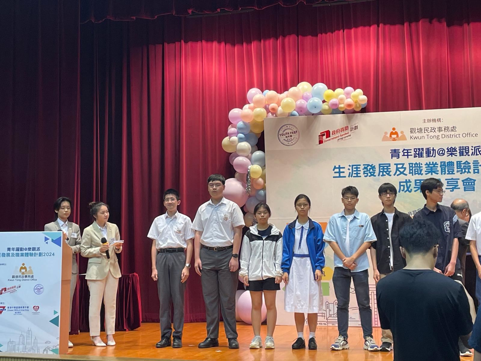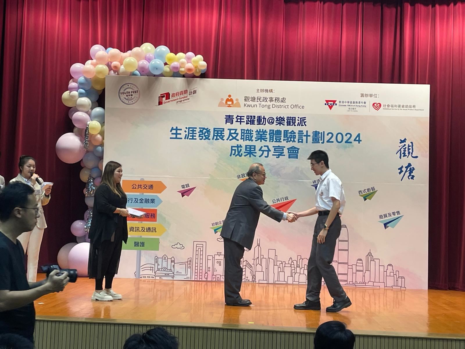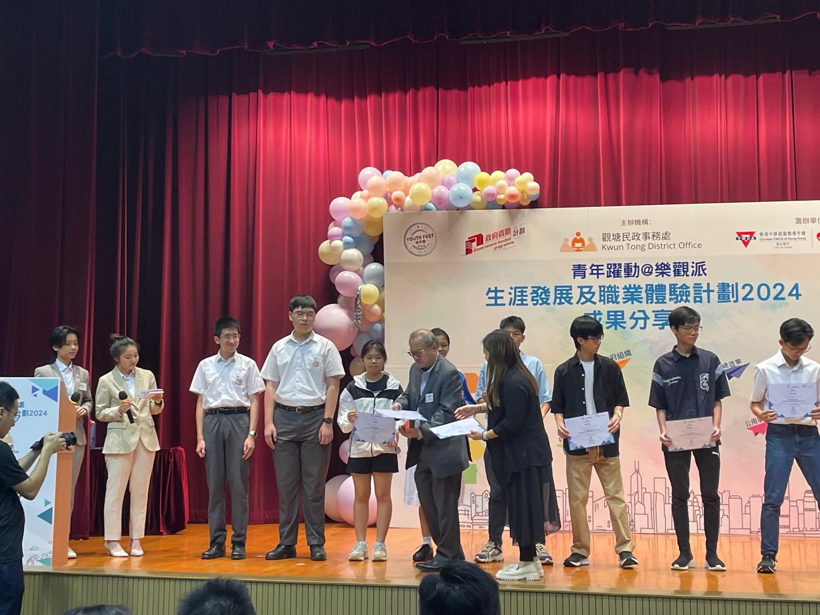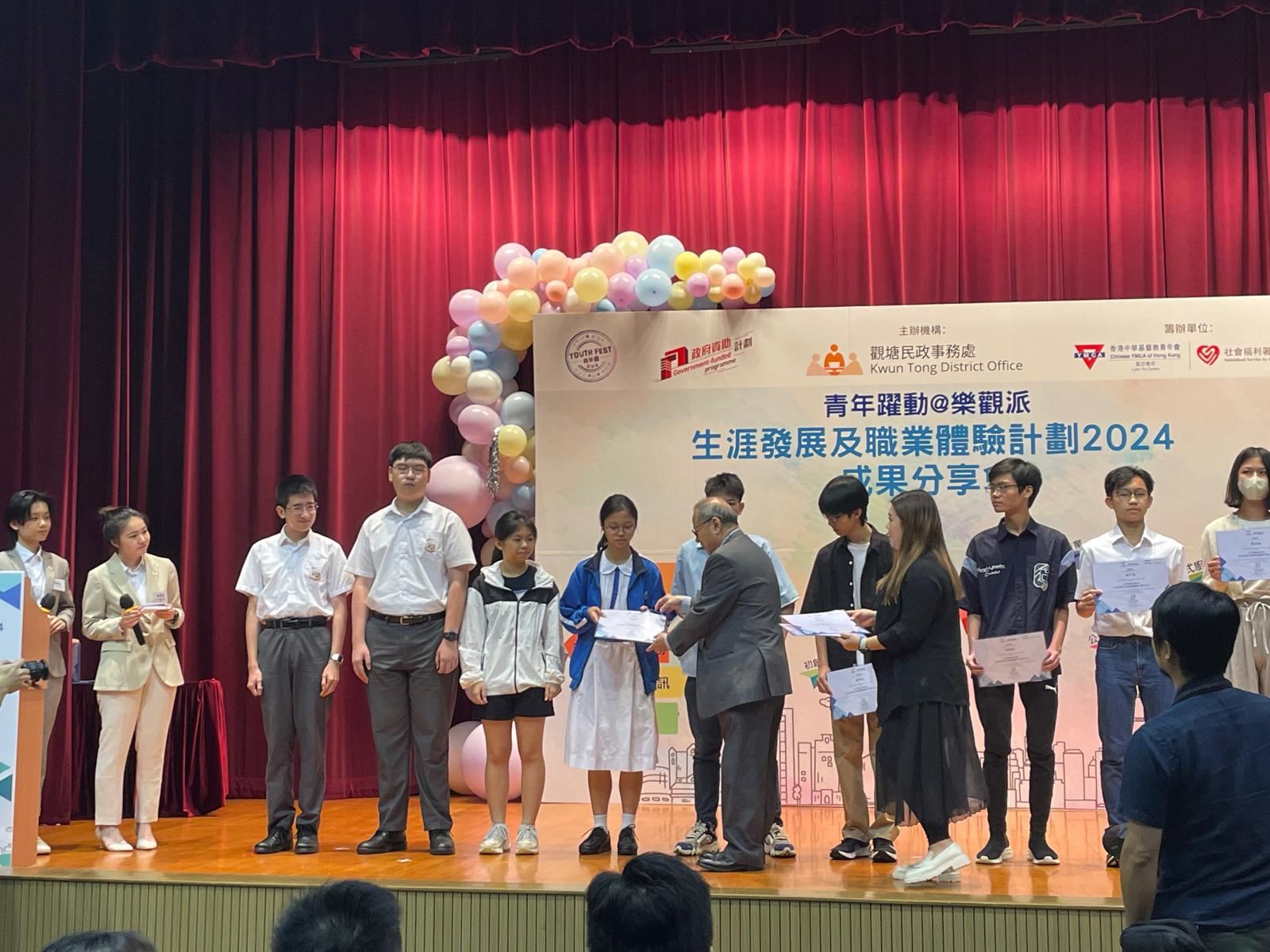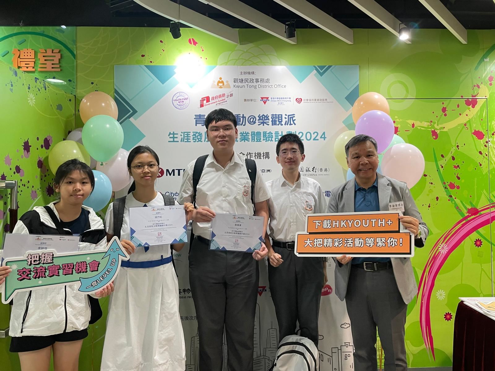 由觀塘民政事務處主辦的<青年躍動@樂觀派> -《生涯發展及職業體驗計劃2024》已於二零二四年七至八月期間順利完成。計劃為學生提供「工作影子」體驗,讓學生跟隨公司/機構員工擔任一天的員工「影子」,親身近距離觀察工作的恆常規律、職務及責任,從而讓他們了解不同行業所需的技巧,加深對該行業的了解。此外,學生透過體驗他們感興趣的工作,亦讓他們從中了解自己的興趣及如何裝備自己,為將來投身社會作好準備。本校四位學生踴躍參與活動,表現卓越,獲機構表揚並頒發證書,獲獎的學生有6D吳子浩、黃浩傑、5D姚竹虹及4D林錦香。