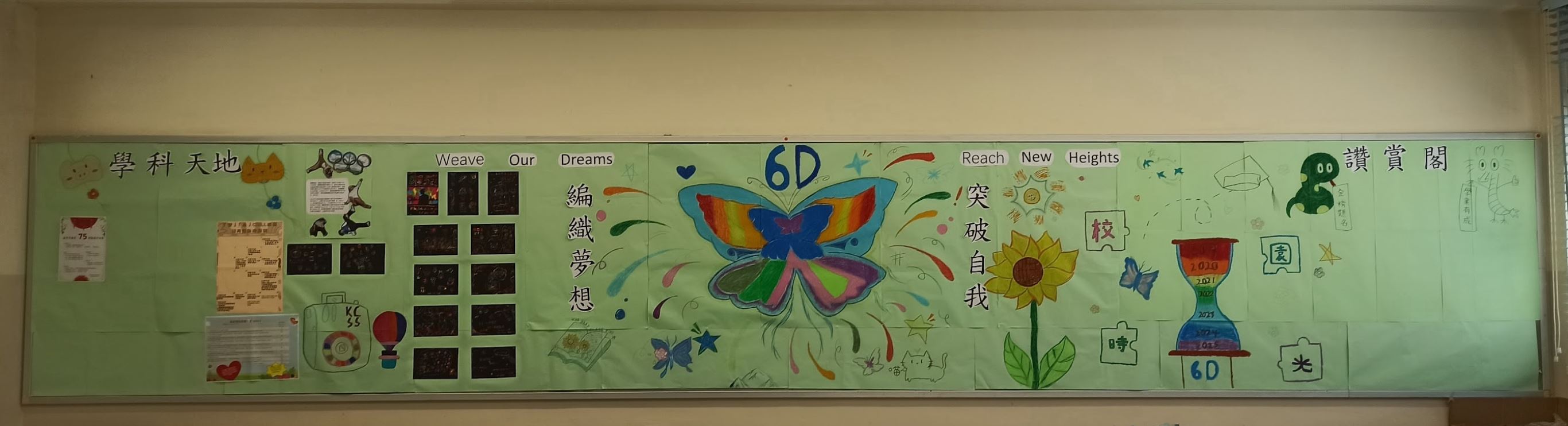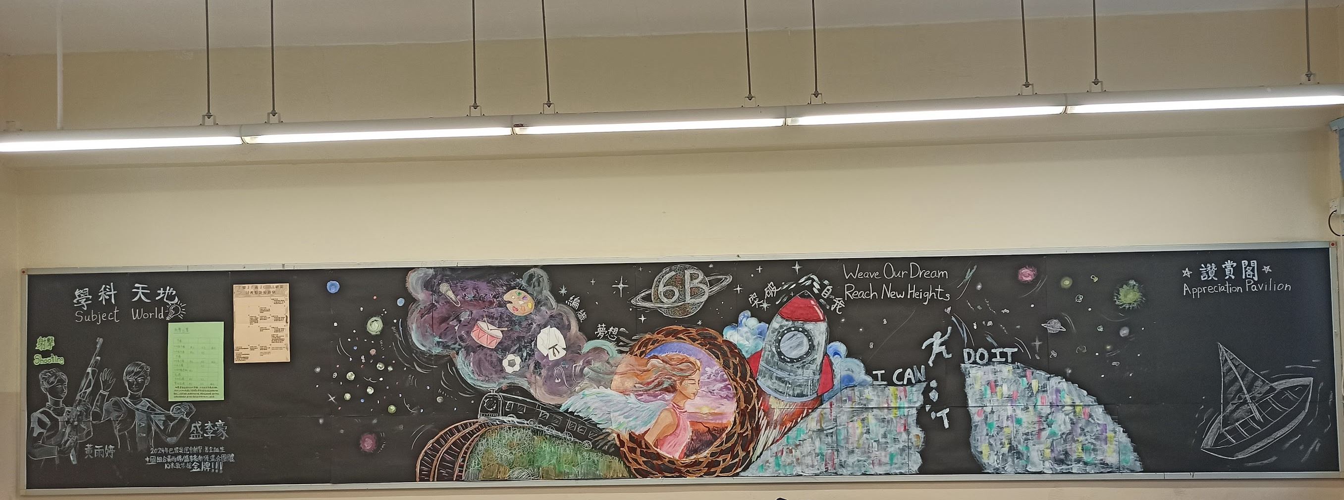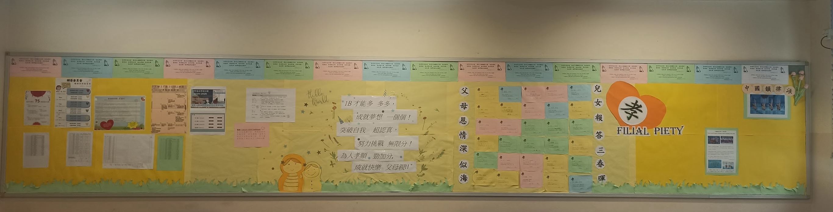 在2024至2025年度的課室壁佈設計比賽中,初中主題為「孝親」(Filial Piety),而高中主題則為「編織夢想,突破自我」(Weave Our Dreams Reach New Heights)。同學們在設計中融入了中國在奧運比賽中的多個項目。初中組的季軍為1B,亞軍為1A,冠軍為2D;高中組的季軍為6D,亞軍為6B,冠軍則是6C。