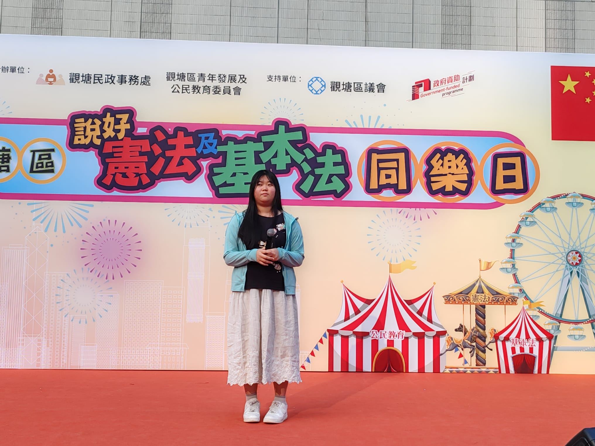 4D林錦香、5C林子妍、蔡菁菁、5D廖梓琳、徐梓譯、6A陳鴻坤及6C鍾娉婷參與由觀塘區青年發展及公民教育委員會於7/12/2024主辦的「觀塘區說好<憲法>及<基本法>同樂日」攤位遊戲營運,學生透過營運攤位遊戲,向公眾推廣<憲法>及<基本法>,活動讓學生表達對祖國及香港的關懷,以提升他們對祖國的認同感及國民意識,亦藉此活動讓學生反思對香港的情懷,及獲取參與社會服務的經驗。另4B尹俊森及5C香卓瑩參加由觀塘民政事務處 - 觀塘區青年發展及公民教育委員會舉辦,觀塘區議會支持的 「說好觀塘 ! 變好觀塘 !」- 棟篤笑/脫口秀課程。學生透過學習棟篤笑/脫口秀(Stand-up comedy)課程及表演,建立自我情緒管理技能,提升自信。此外,活動亦讓學生認識及學習固中技巧,宣揚不同的藝術文化,以藝術將歡樂帶給身邊的人。學生於2/11/2024及9/11/2024進行共8小時培訓,之後5C香卓瑩於7/12/2024的「觀塘區說好<憲法>及<基本法>同樂日」中公開表演。
