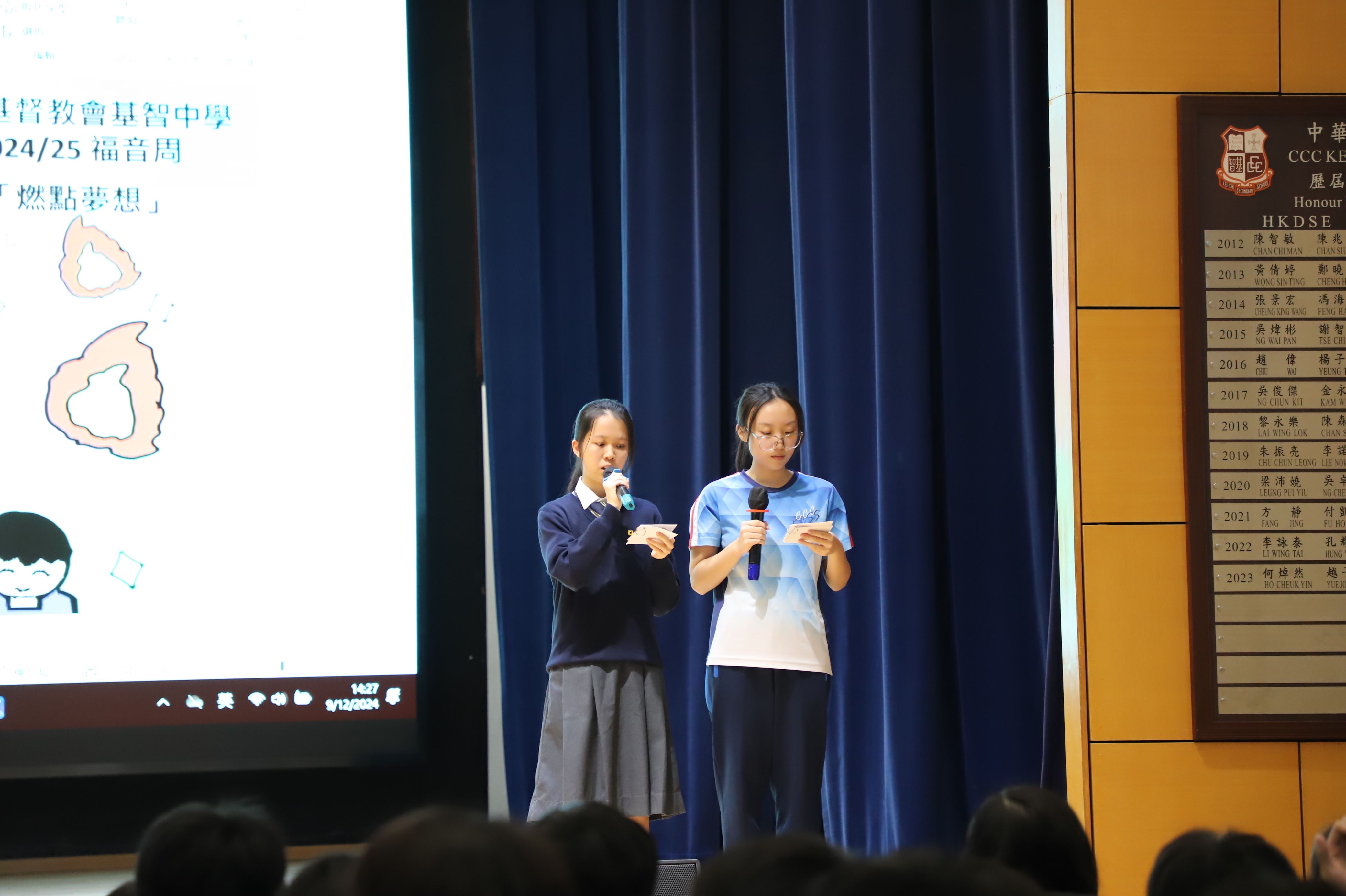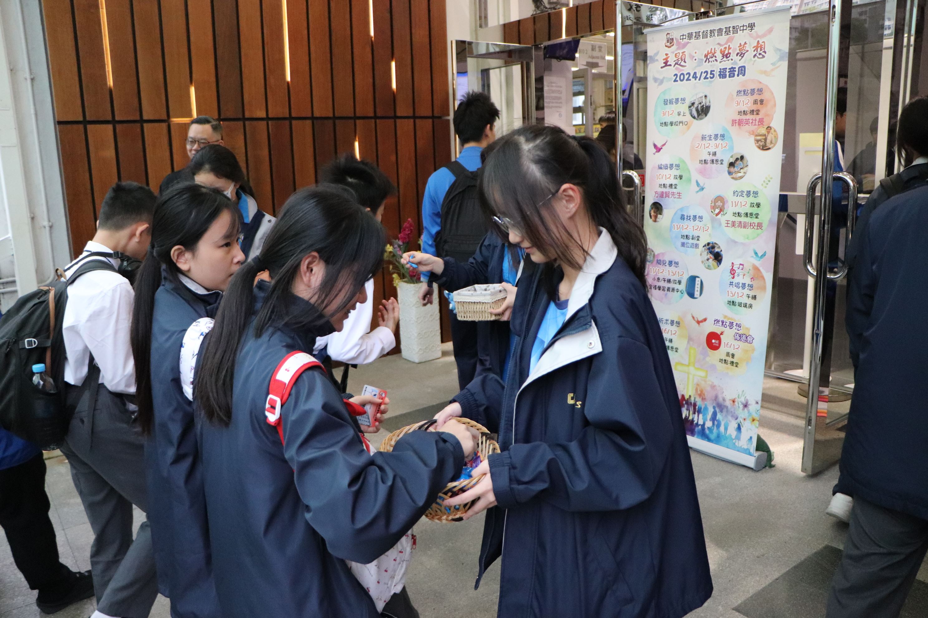 福音周「燃點夢想」於12月9日早上正式展開。這天一群基督精兵在學校門口派發驚喜小禮物,鼓勵同學們發掘夢想。今年我校有幸邀請到愛基金協助籌備福音周,下午的福音周預工周會有幸邀請到許朝英博士分享見證和表演武術,讓同學們在信仰上能夠有所得著。