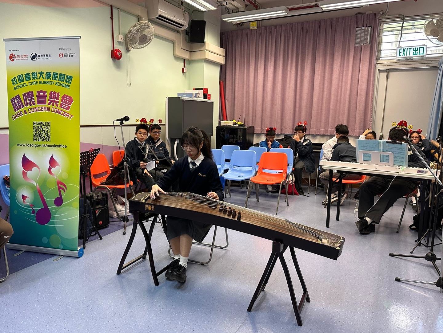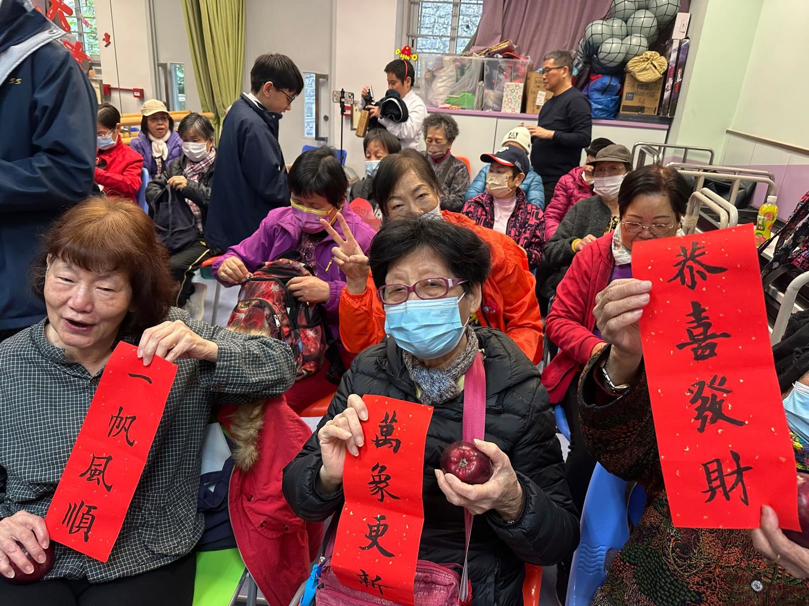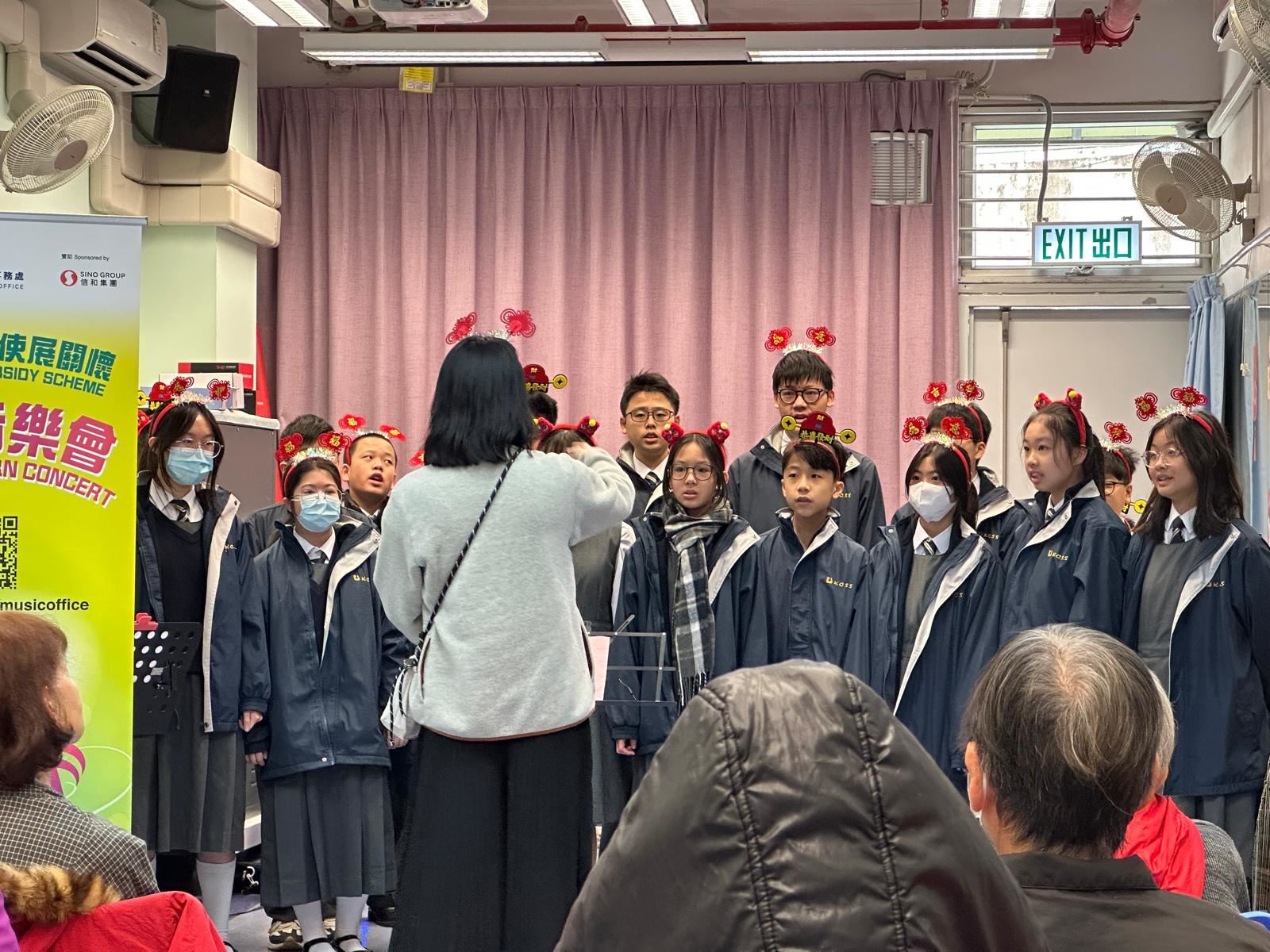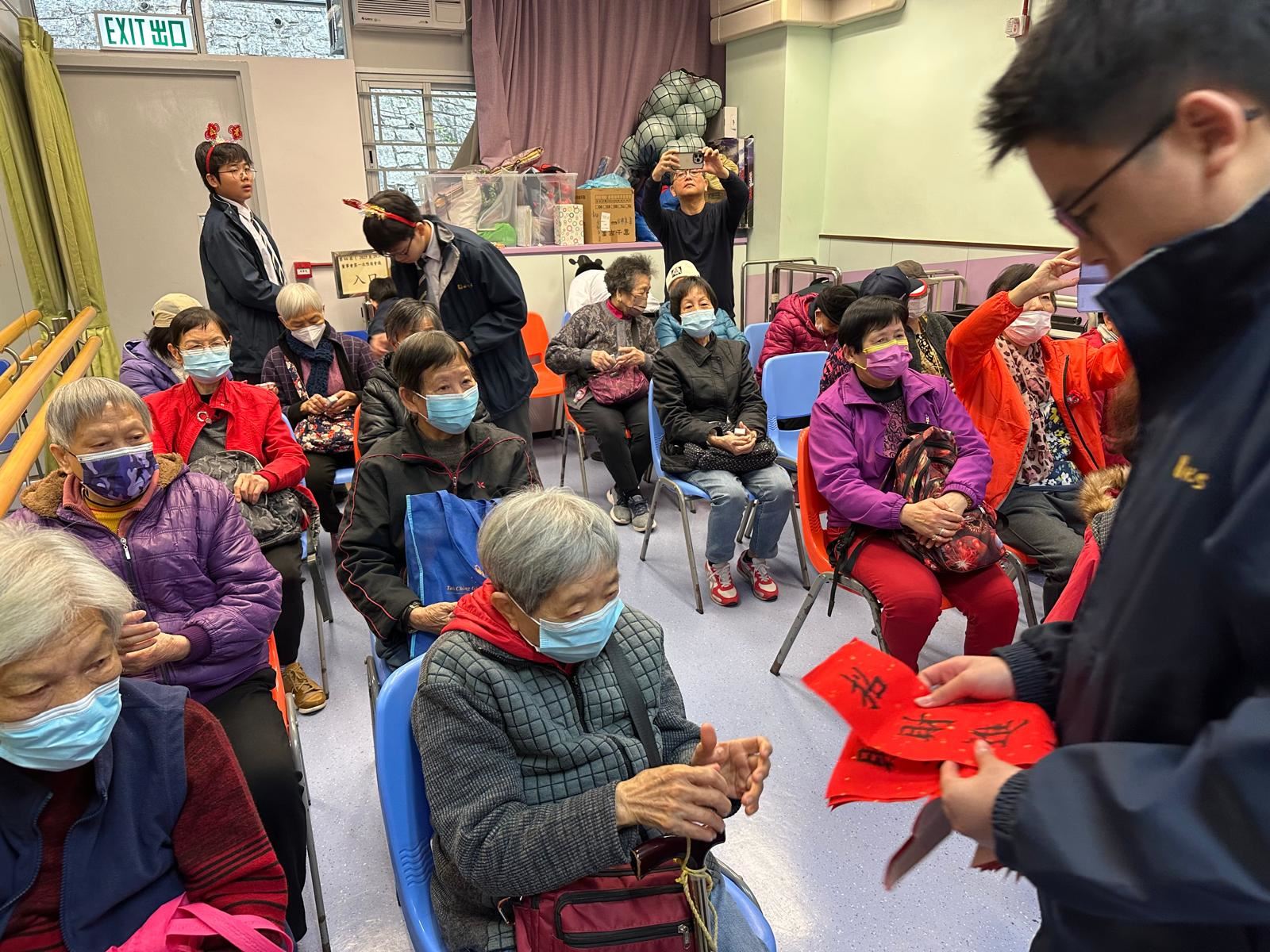 本校合唱團A和口琴班,聯同部分同學於1月18日參與了由康樂及文化事務署和音樂事務處主辦的「校園音樂大使展關懷」計劃,讓同學透過音樂表演向社區人士送上祝福。 一眾「音樂大使」到鐘聲慈善社胡陳金枝長者鄰舍中心為長者們表演,其中合唱團A表演了「月亮代表我的心」;口琴班同學演奏歌曲「恭喜恭喜」;其他同學進行了歌唱、結他和古箏表演。並準備了水果和揮春送給長者。揮春由同學們親手寫出,並寫上賀語,向長者送上農曆新年祝福和關懷。