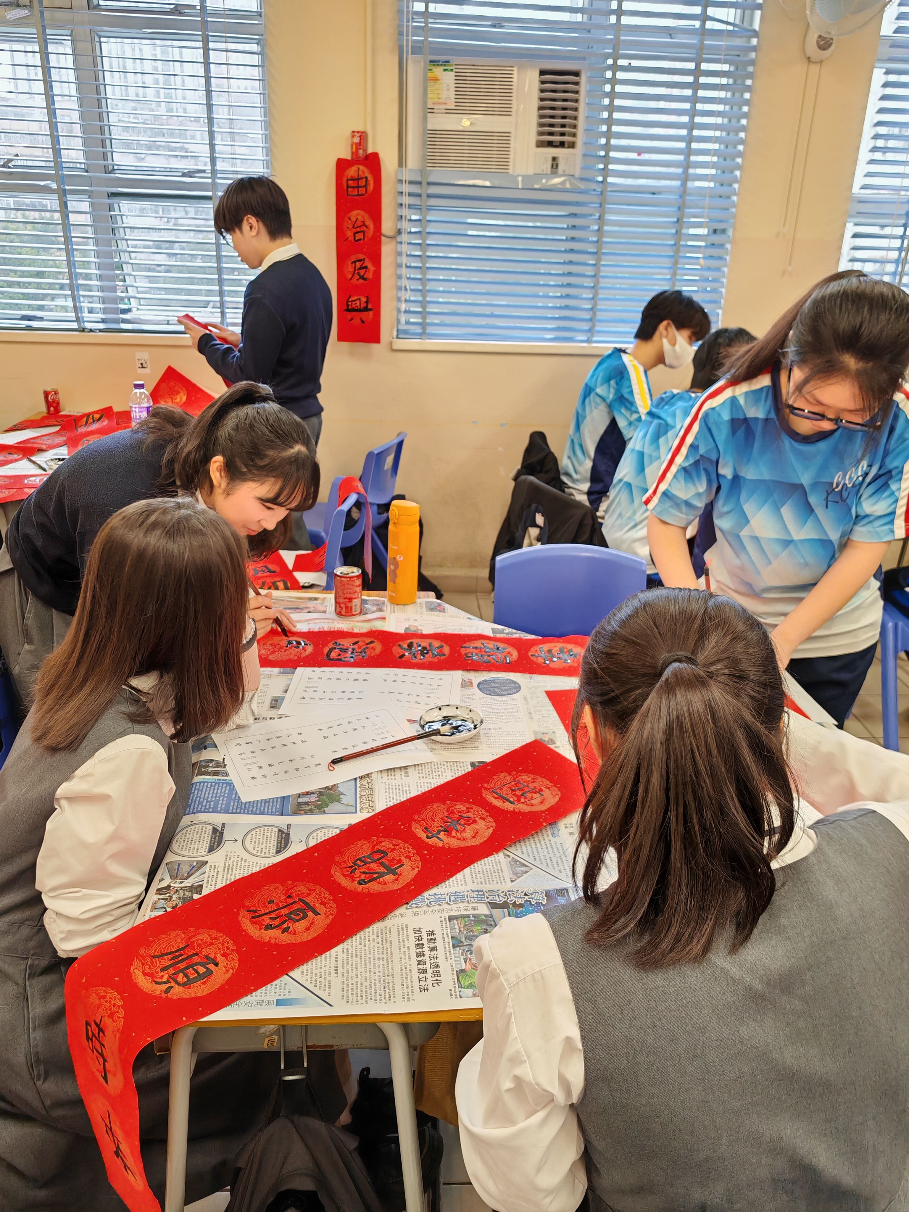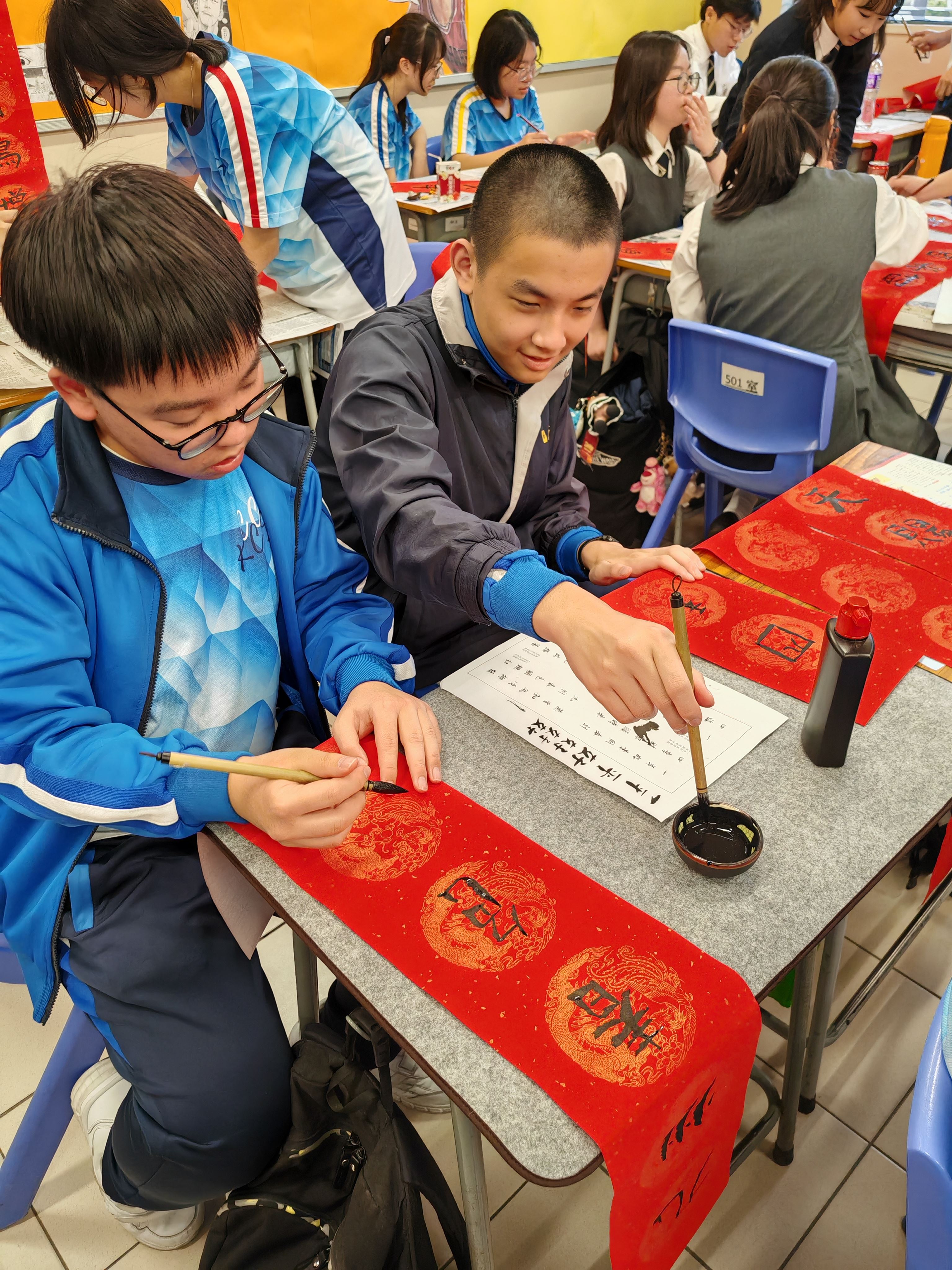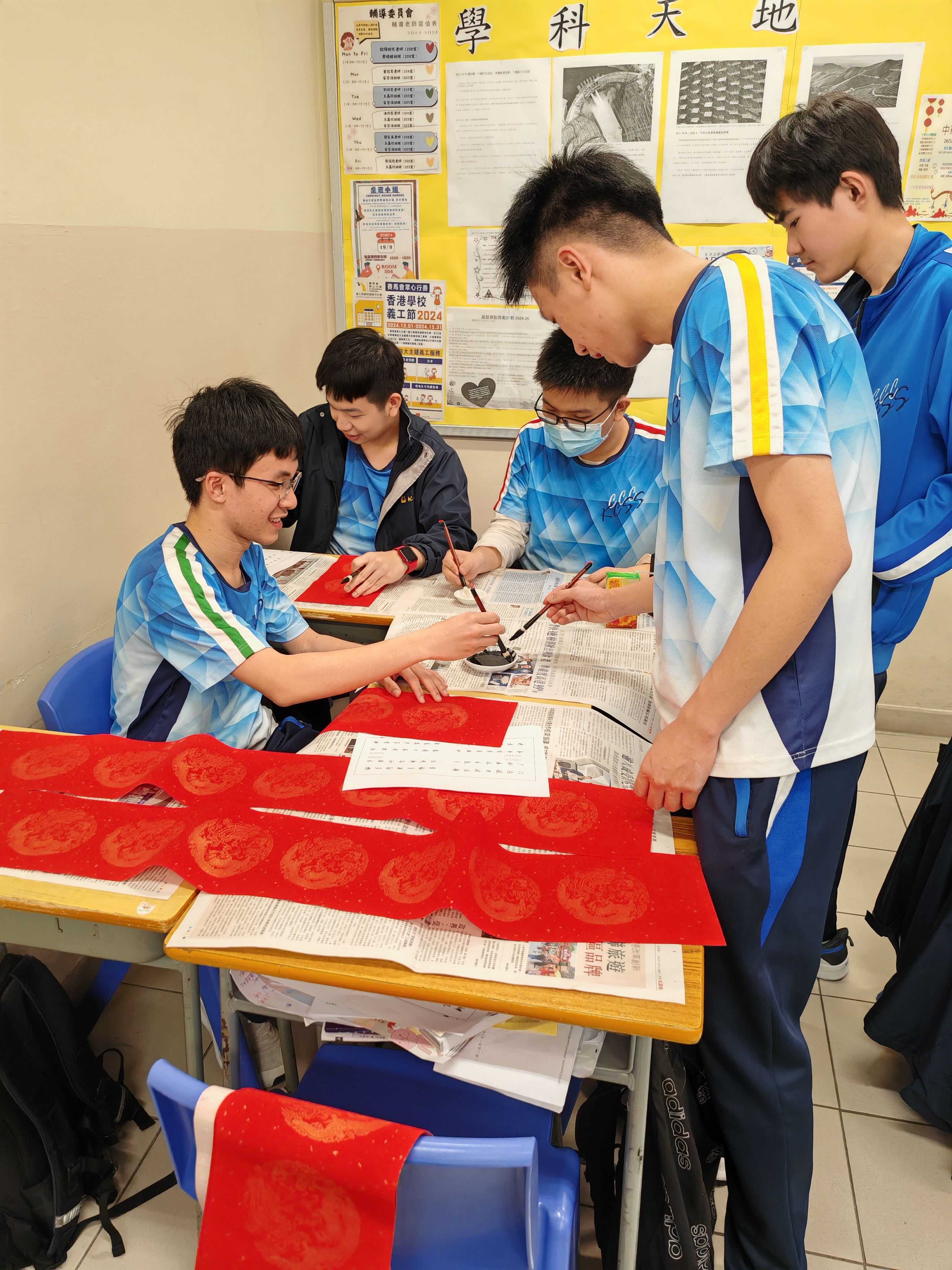 中五級同學於中文課學習中國對聯文化,同學嘗試創作對聯並書寫,樂在其中。