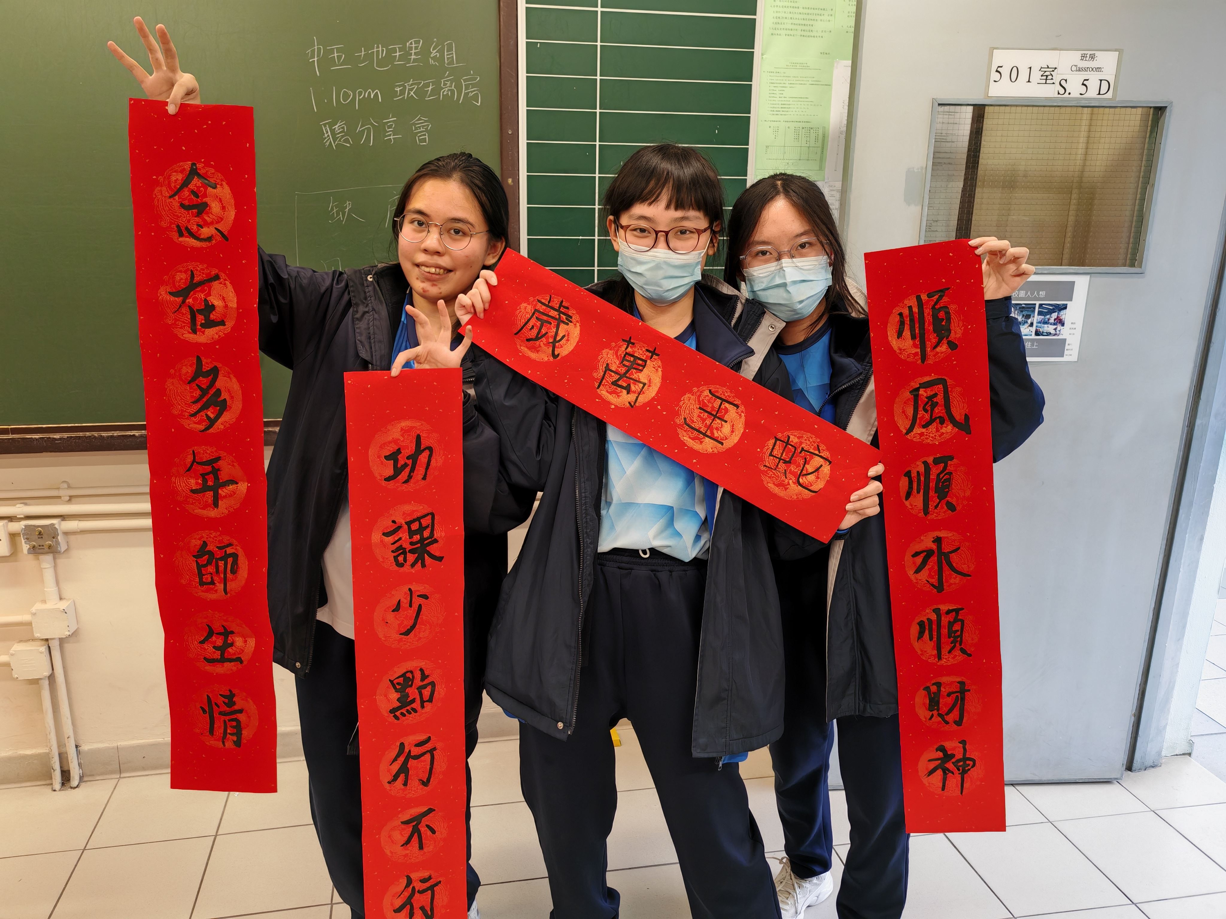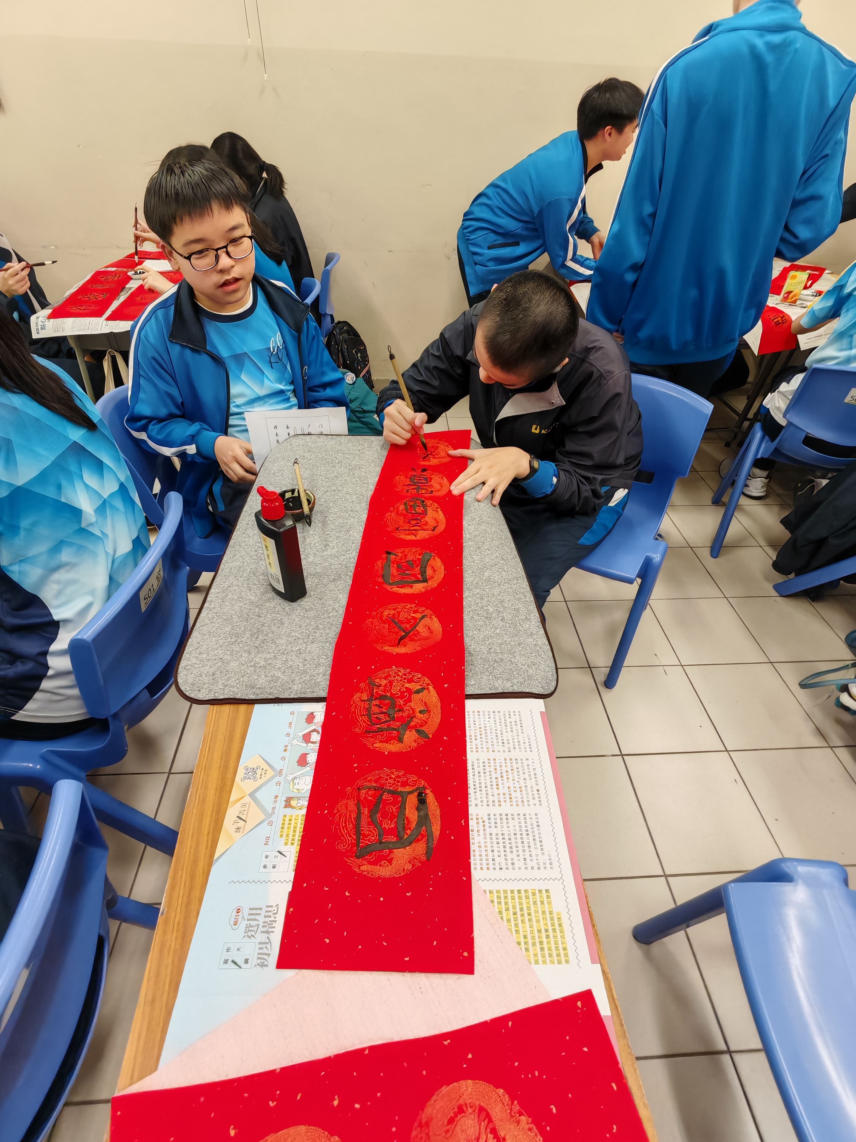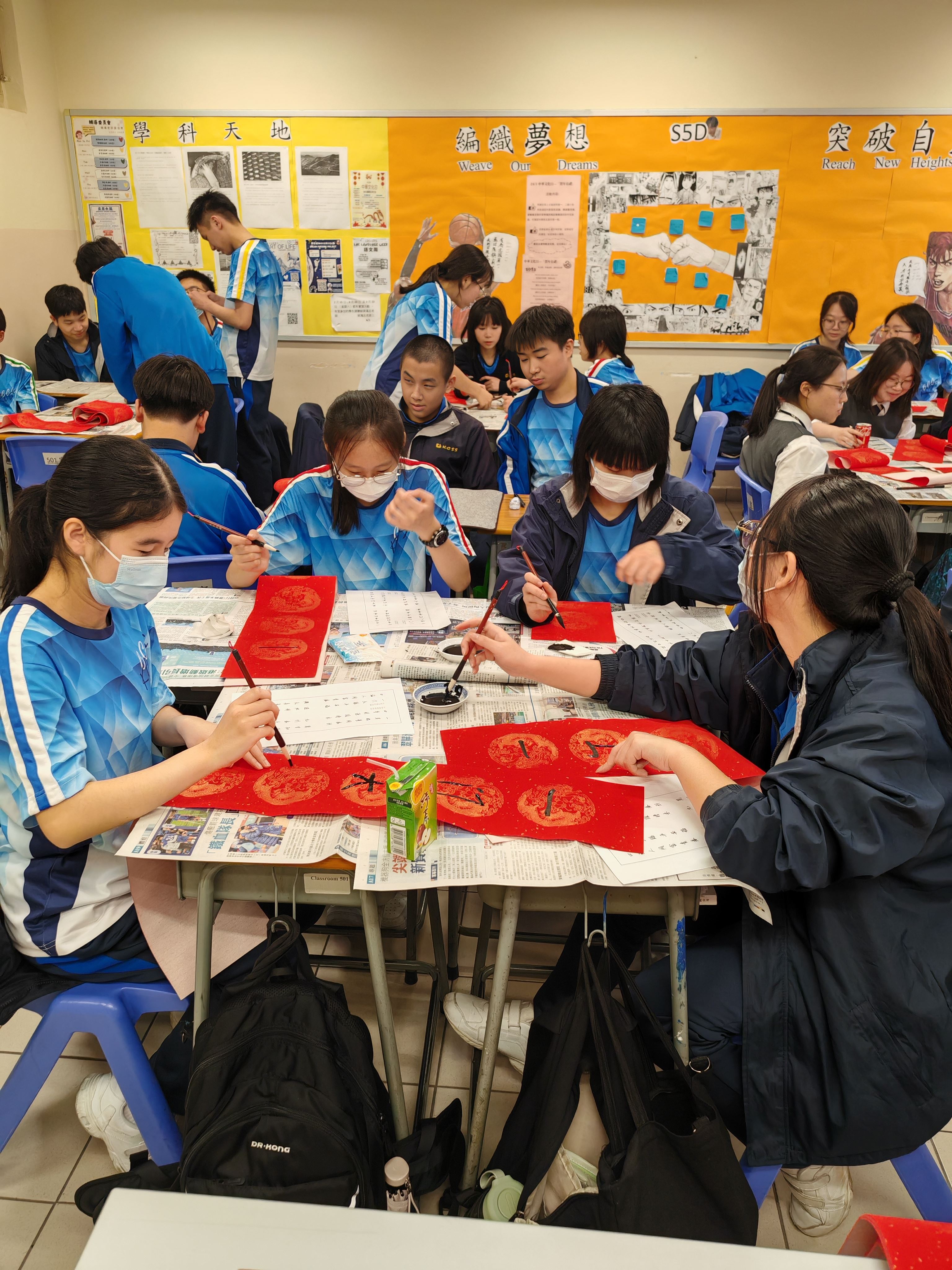 中五級同學於中文課學習中國對聯文化,同學嘗試創作對聯並書寫,樂在其中。