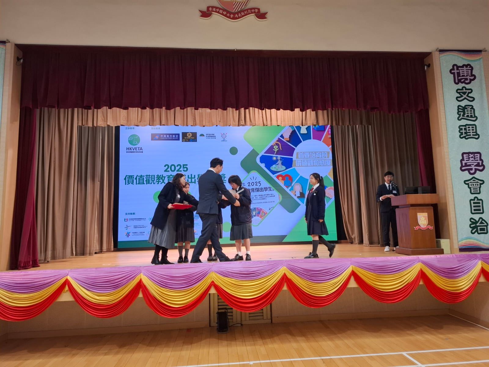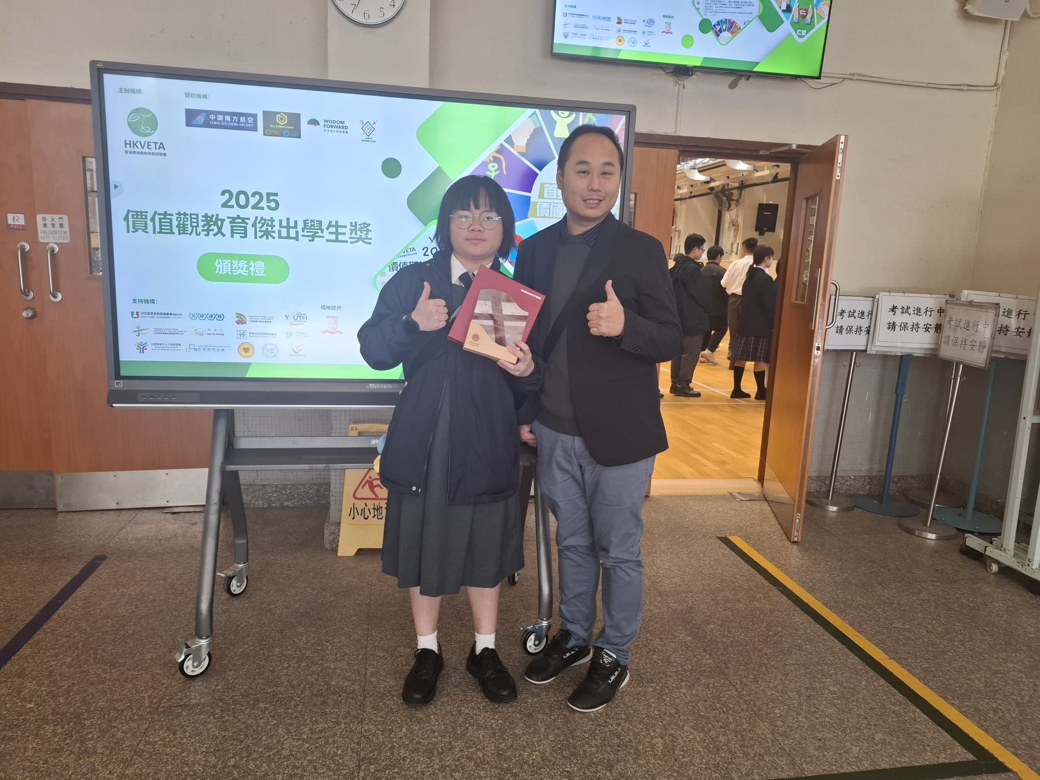 恭喜5D班陳恩惠同學榮獲香港價值觀教育教師協會主辦的「2025年價值觀教育傑出學生獎」!這份殊榮肯定了她的品德與努力,願她繼續發光發熱,成為同學的榜樣!