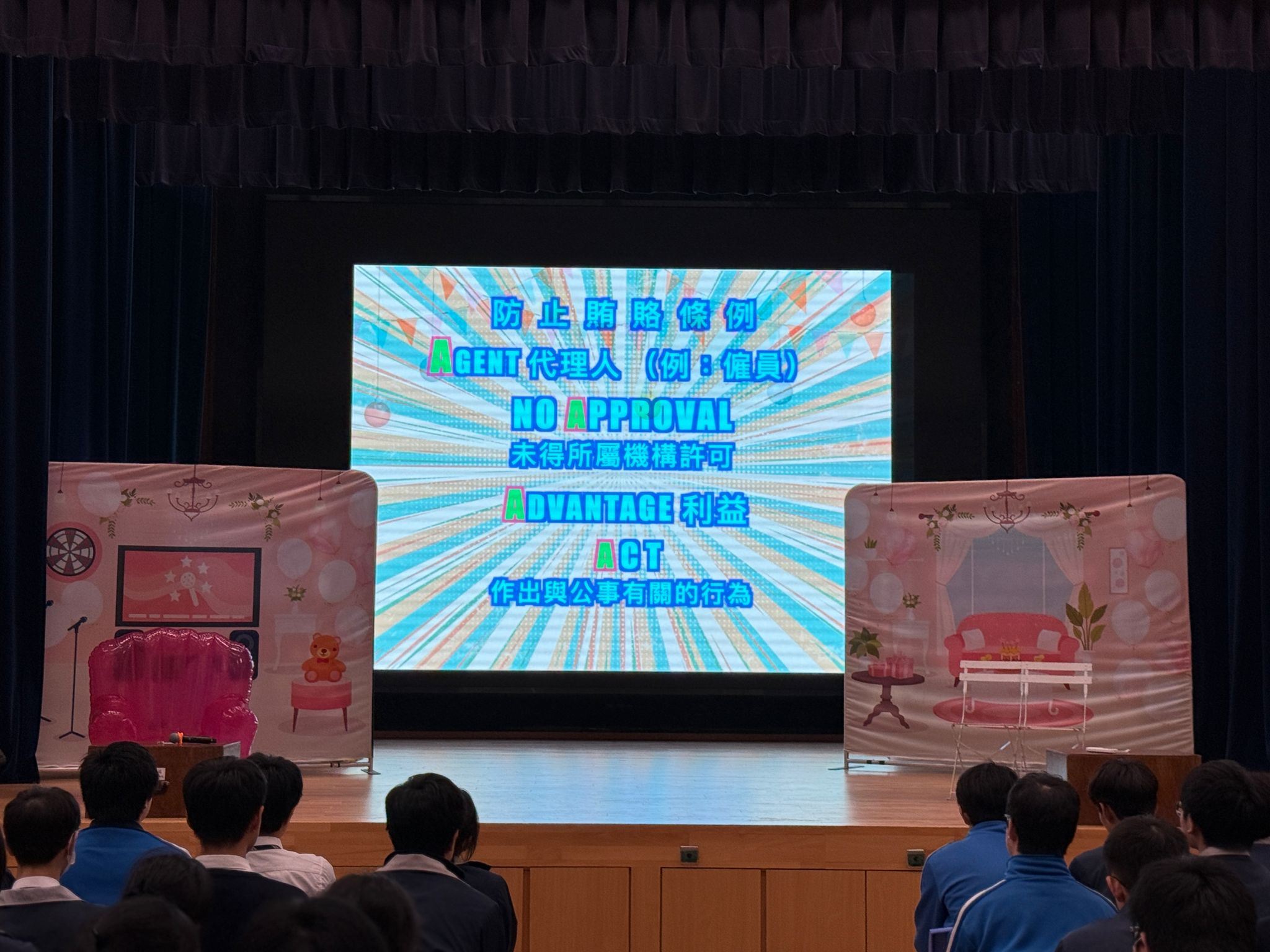 社會服務委員會聯同價值教育委員會及公民與社會發展科參與由「廉政公署」舉辦的「廉政互動劇場」。中四全級學生透過觀看《Party自肥企劃》互動倡廉話劇,讓學生明白貪污對個人、不同持分者及整體社會的負面影響,從而帶出守法的重要性,學生投入參與與演出者的互動環節。