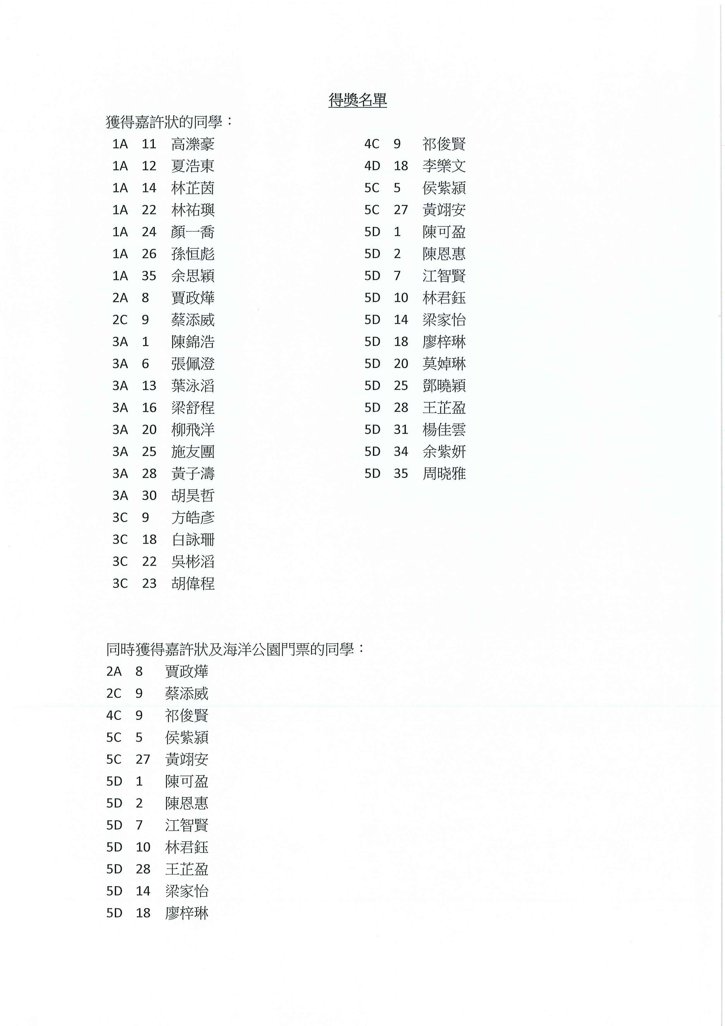 本校同學積極參與「『認識祖國』地理科線上遊戲平台」,以提升對國家地理的認識,加強國民身分認同及民族自豪感。教育局特此頒發嘉許狀,予以表揚。此外,教育局為了嘉許成績優異的學生,分數最高的學生除了可獲得嘉許狀外,更可獲得海洋公園門票兩張,以作獎勵。 本校共37位同學獲得嘉許狀,其中14位同時獲得嘉許狀及海洋公園門票。恭喜所有得獎的同學!