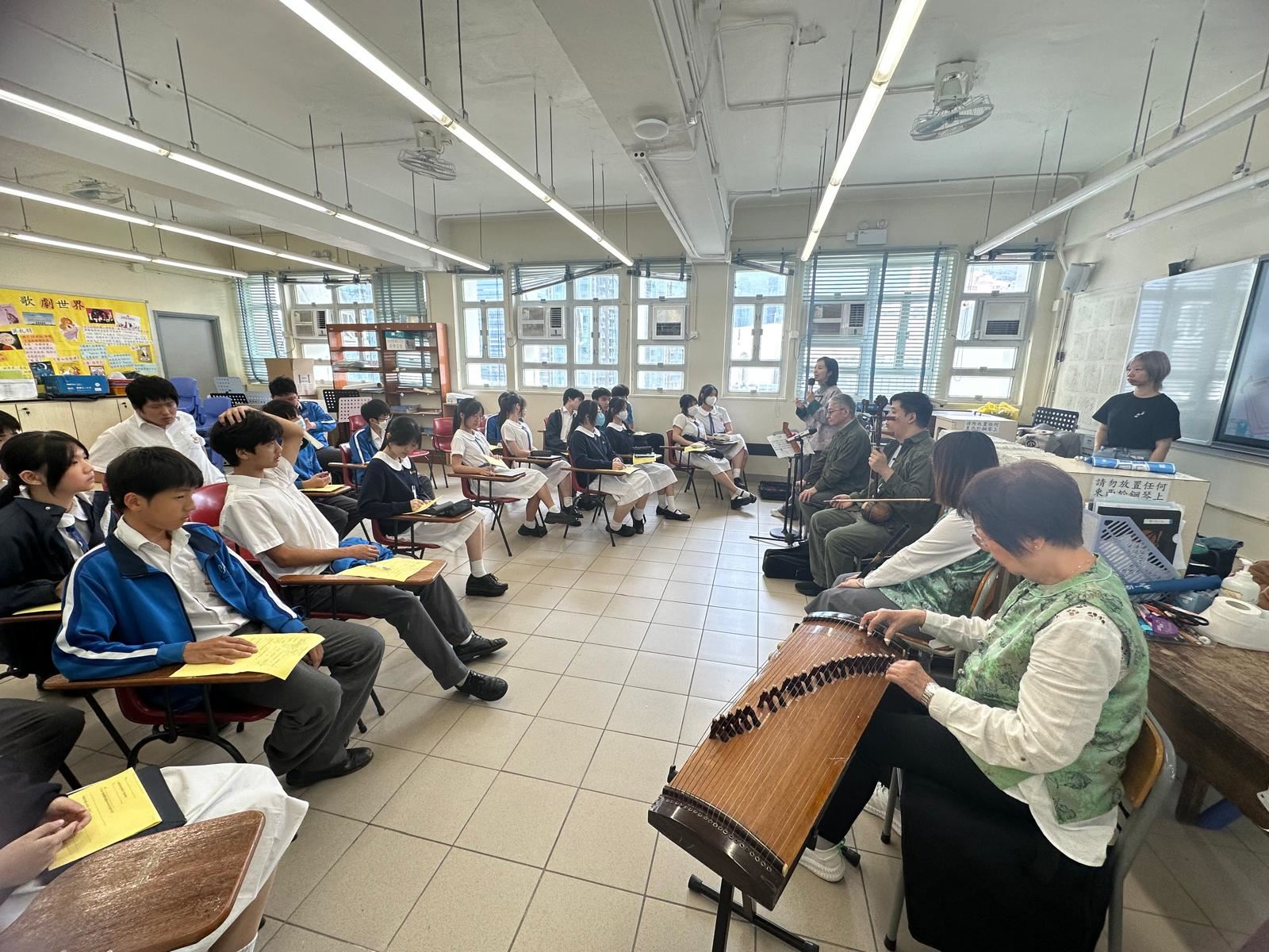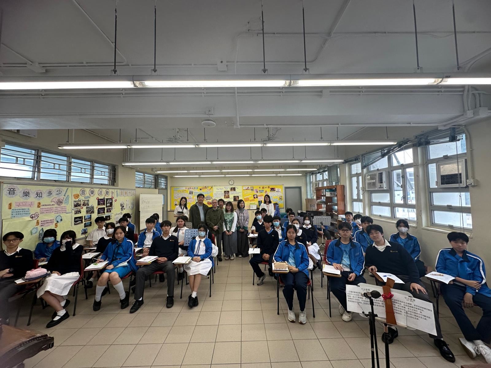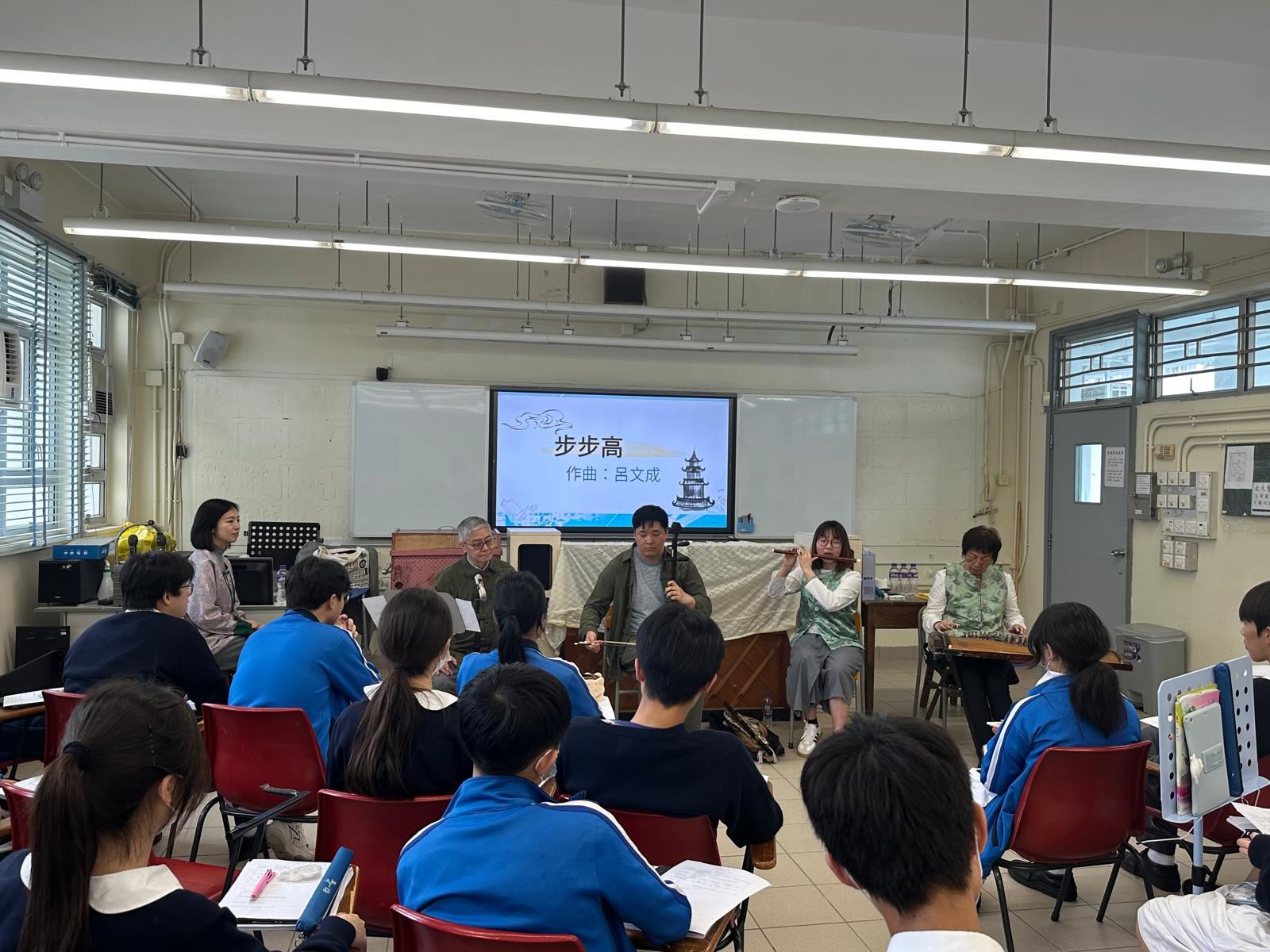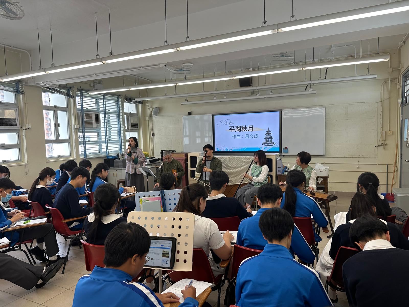 為了加深同學對中華文化和中國音樂的認識,音樂科於2025年4月11日(星期五)邀請一桌兩椅慈善基金進行講座。 著名資深粵劇藝術家阮兆輝博士向中三級同學講解廣東南音的特色和歷史,分享珍貴的知識經驗,親身示範及演唱南音,還有一桌兩椅慈善基金主席曾慕雪進行說書講解,另外有三位中樂演奏家進行演奏與樂器介紹。 在這次音樂堂中,同學能夠有機會近距離與音樂家進行互動,十分投入學習,對南音音樂有了初步的認識,並在課堂中完成導賞工作紙,為這次音樂講座進行反思。