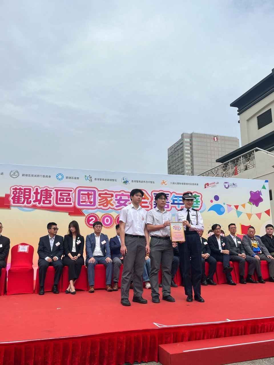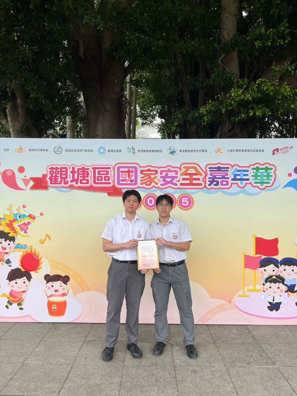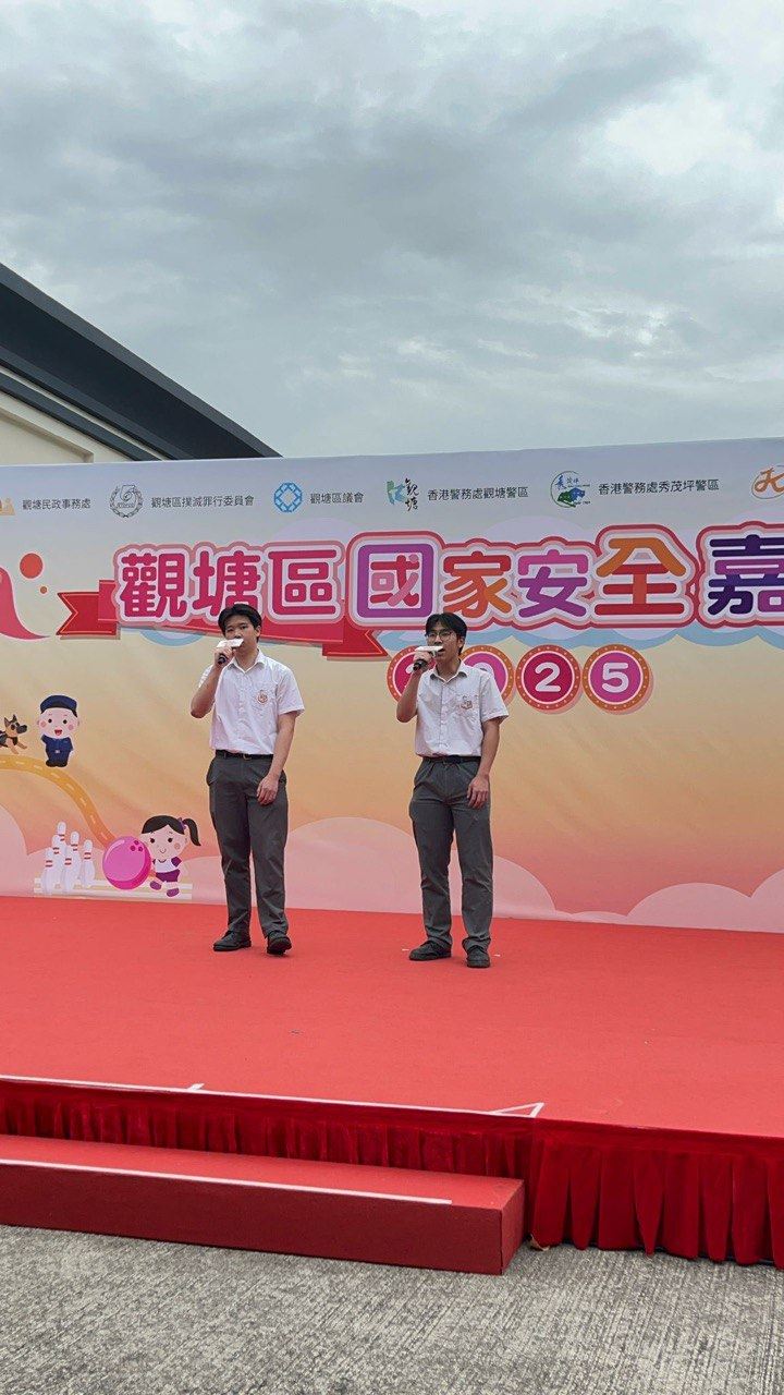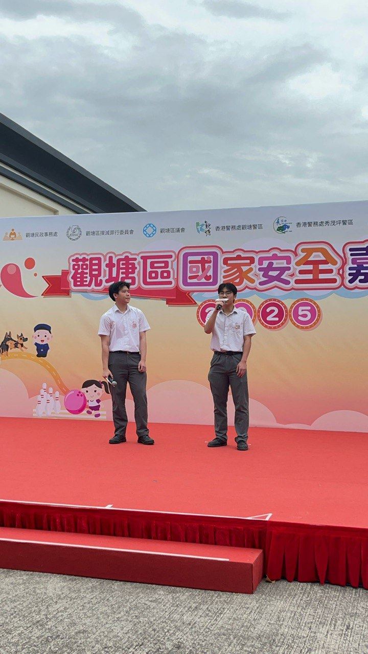 訓育委員會推薦5A 肖志軒、5C 周志豪參與「觀塘區國家安全嘉年華2025」擔任歌唱表演嘉賓,獻唱「我愛你中國」、「紫荊花盛開」,宣揚愛國愛港訊息。