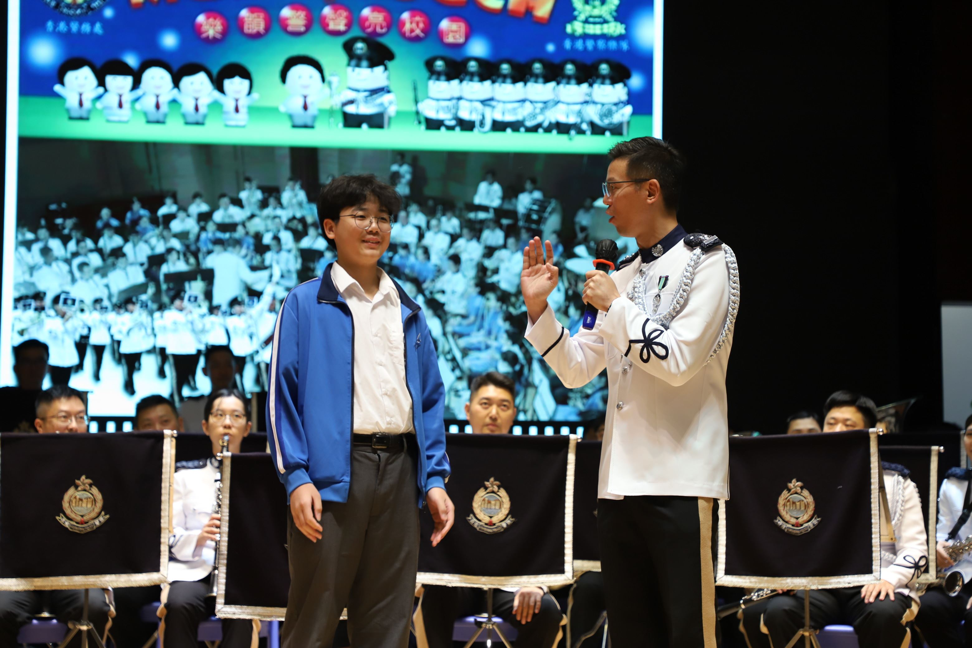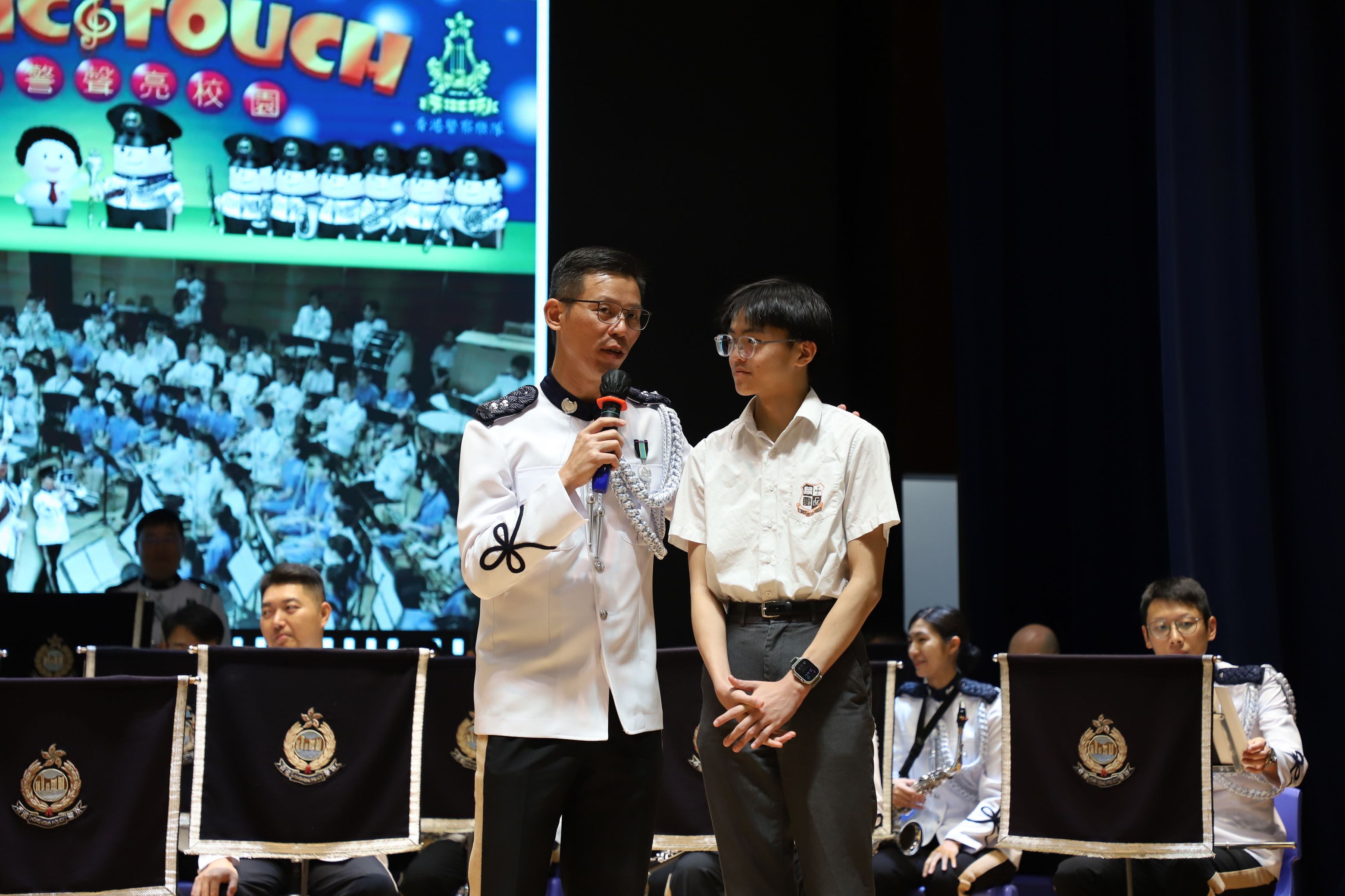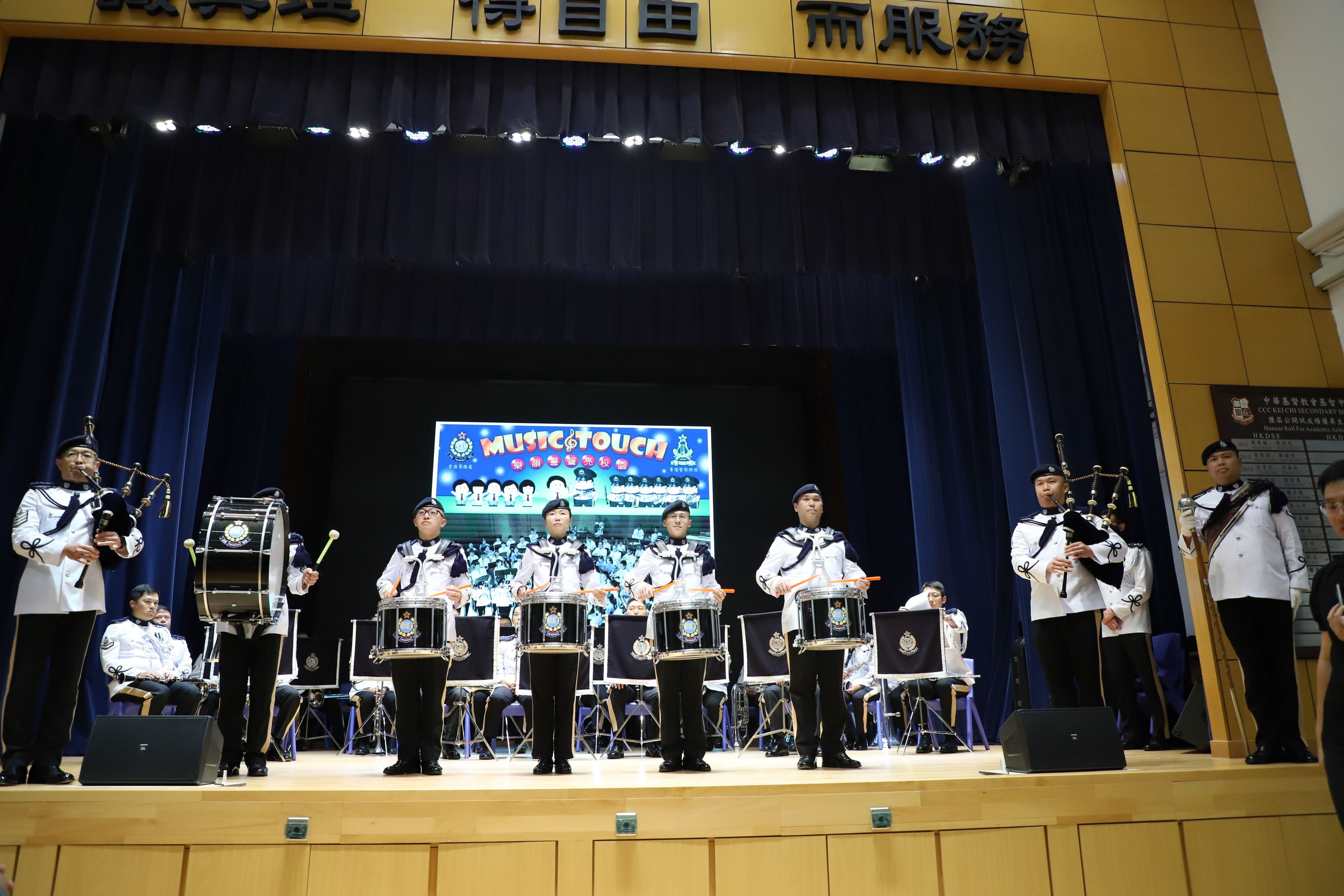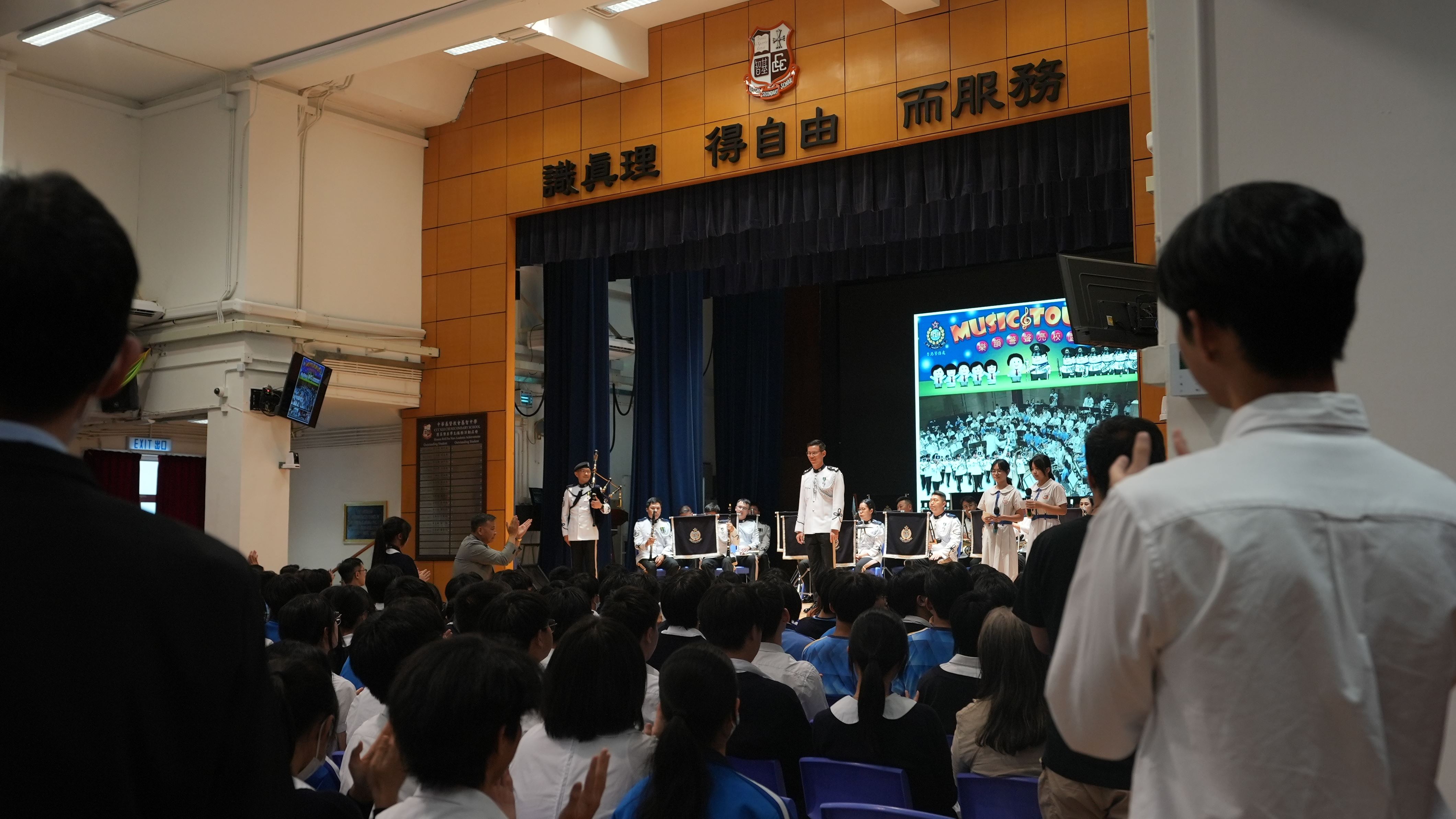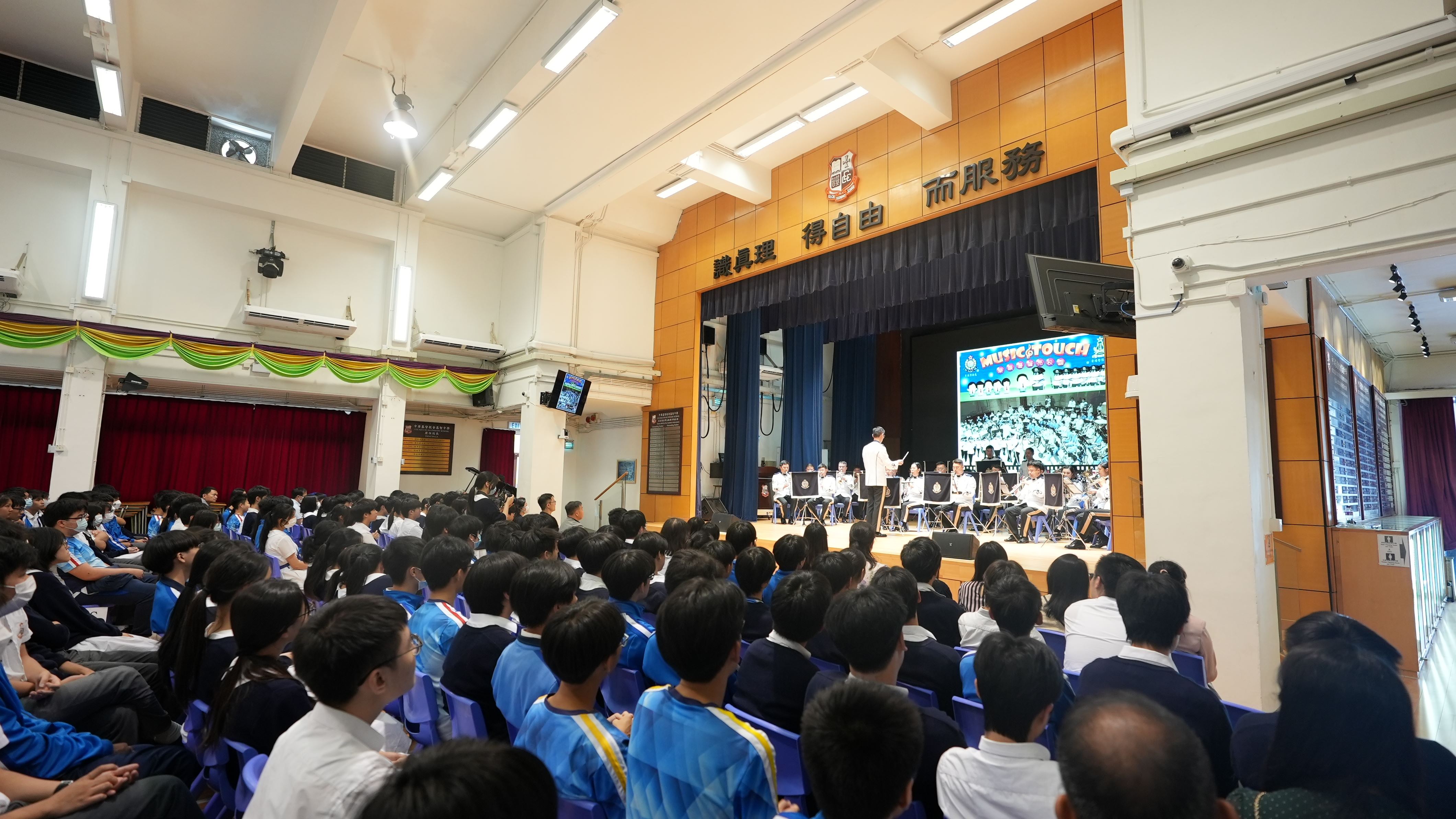 12/05/25 邀請警察樂隊到校進行表演,主題為「樂韻警聲亮校園」,透過音樂交流提高學生對警隊工作及價值觀的了解。警察樂隊演奏一系列經典歌曲,並簡介樂隊歷史,亦提供機會讓學生即場參與演奏指揮,並進行問答環節,學生積極參與,反應熱烈。