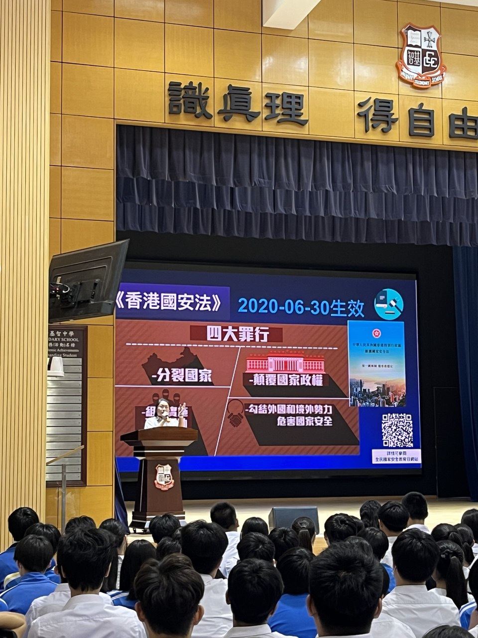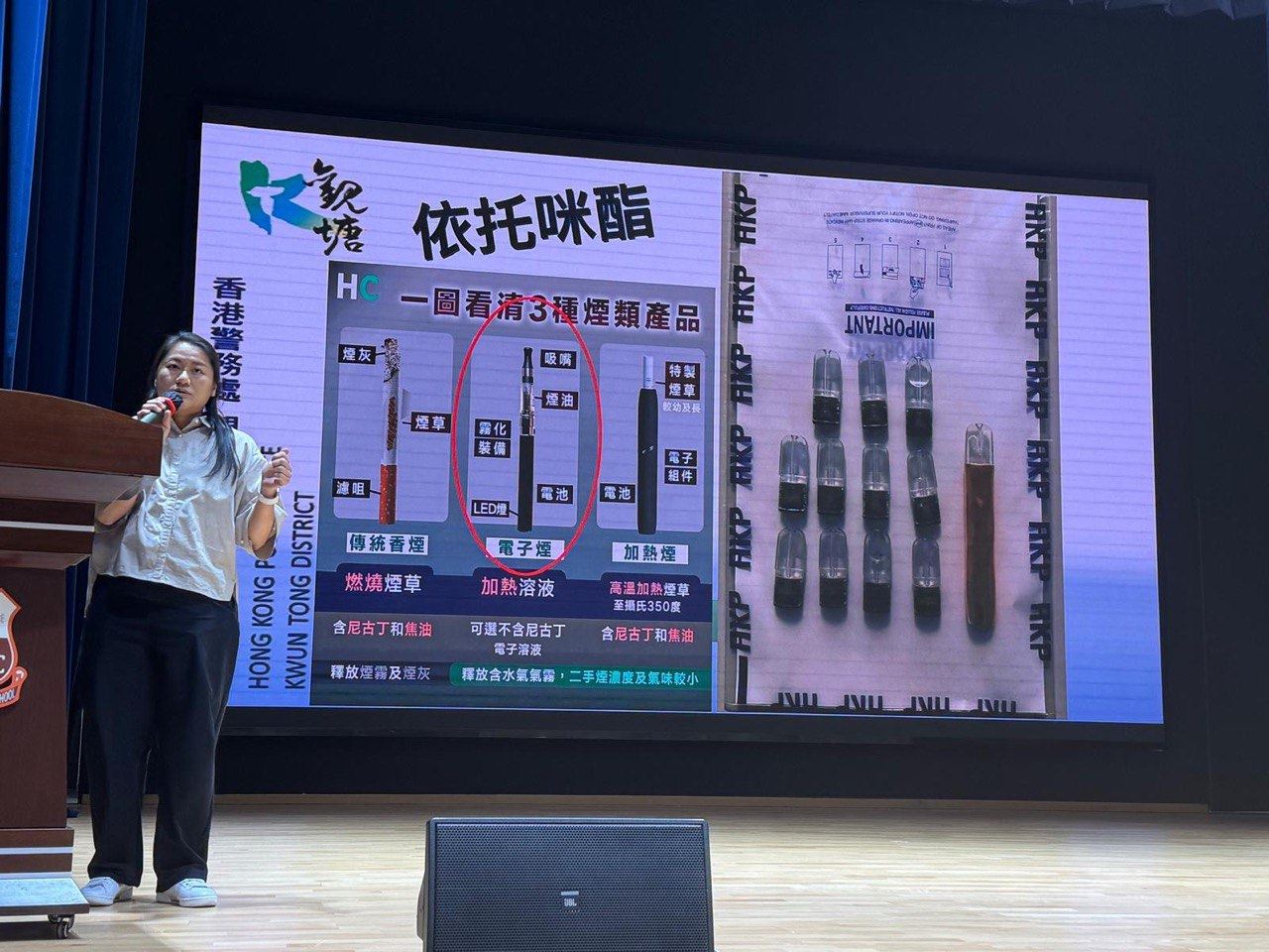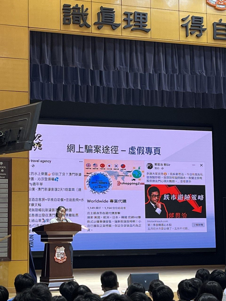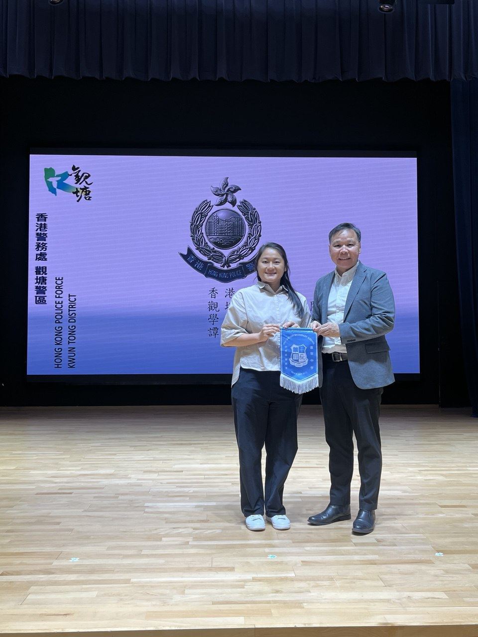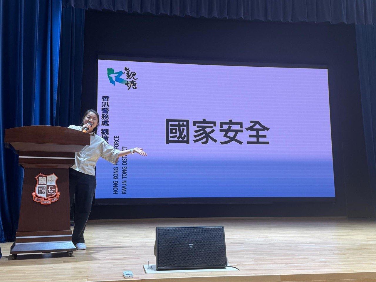 15/09/25 知情守法周會,訓育委員會邀請觀塘警區警民關係主任譚亦珊警長到校進行教育講座,分享有關依托咪酯、網絡騙案及國家安全的相關法例及刑罰,提高學生的守法意識。