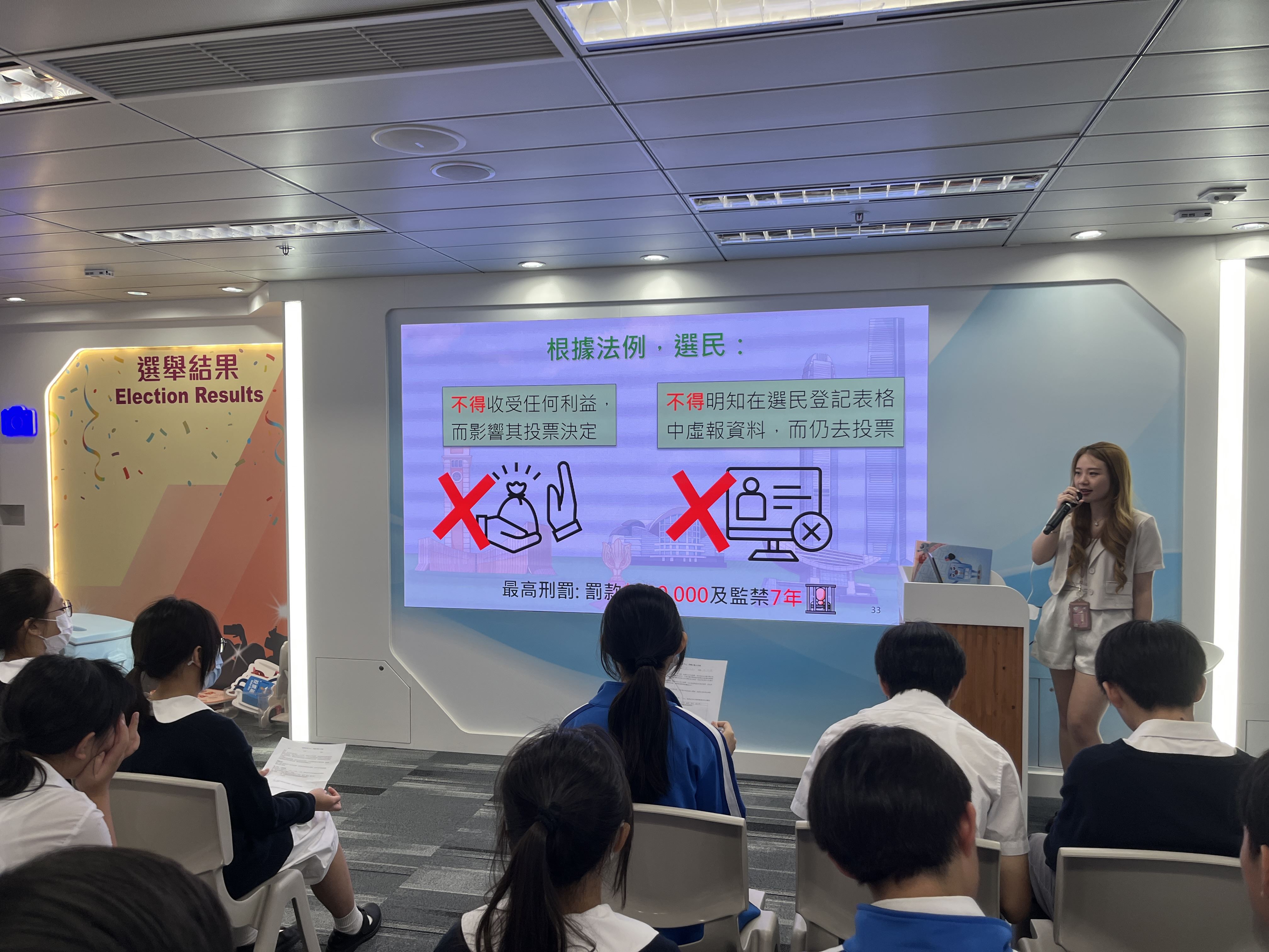 「選舉資訊中心」參觀活動 為加深同學對香港選舉制度的認識,本校公民、經濟與社會科與視覺藝術科合作,帶領中二學生前往參觀位於長沙灣的「選舉資訊中心」。活動內容豐富,同學首先參與了由選舉資訊中心職員主持的專題講座,深入淺出地認識香港的選舉制度及相關安排。講座過程中,設有互動環節及小組遊戲,激發同學思考,並鞏固所學知識。為讓同學親身體驗選舉流程,活動特設模擬投票環節。同學們在模擬發票櫃台使用電子選民登記冊領取選票,並於「模擬投票間」內進行投票。其後,同學們更參與了點票過程,全面了解投票與點票的具體操作,進一步體會公民參與的意義。 今年12月即將迎來立法會換屆選舉,期望是次活動讓同學深刻體會到,投票是公民社會的基石。一次公開、誠實和公平的選舉,對香港的政治穩定與社會發展至為重要。