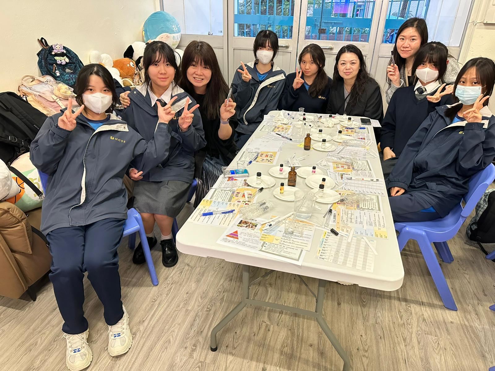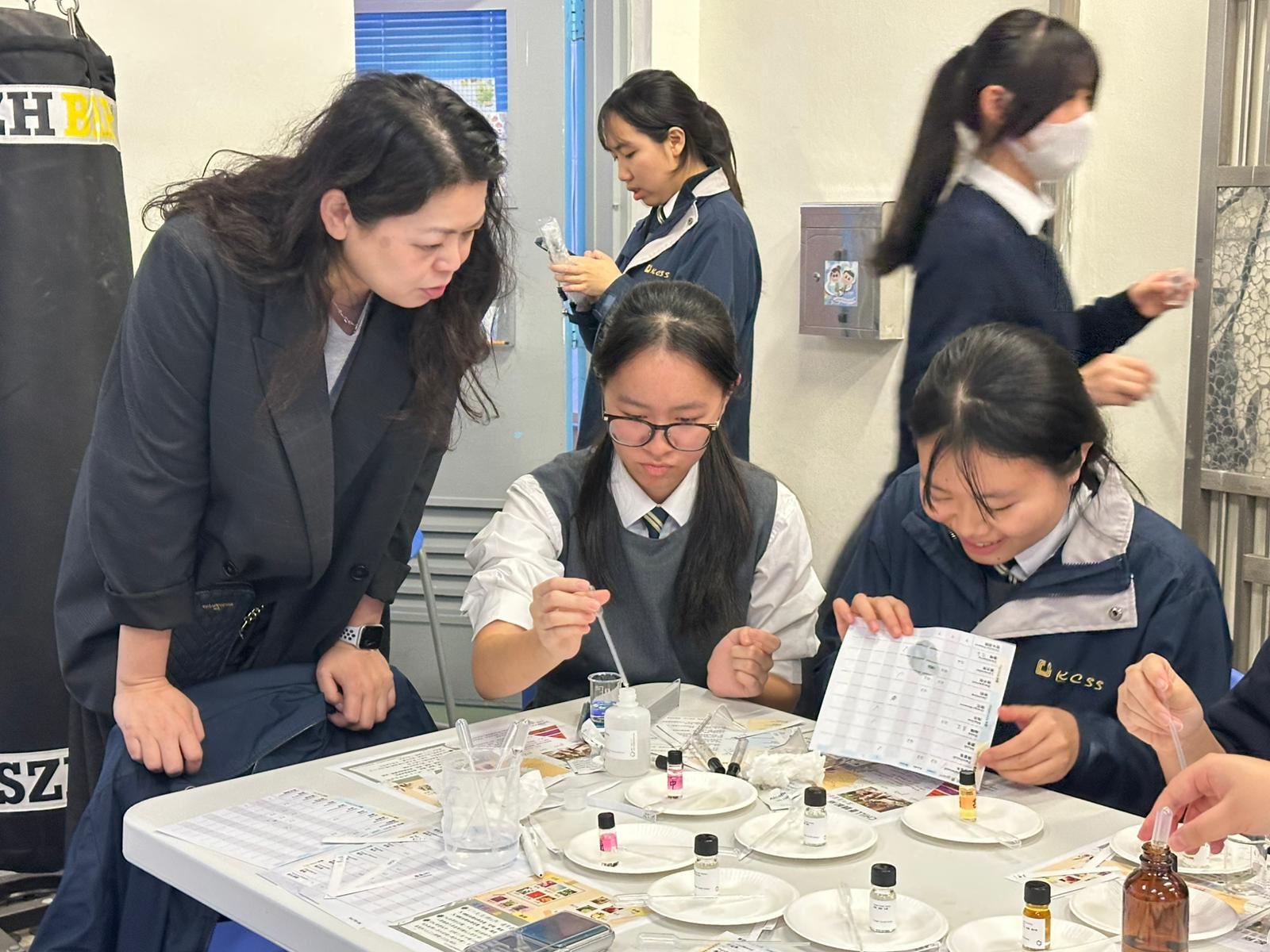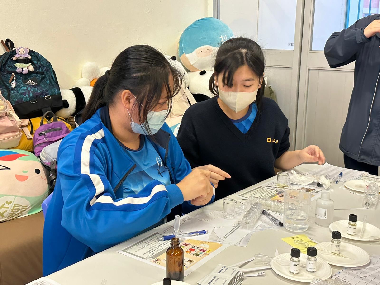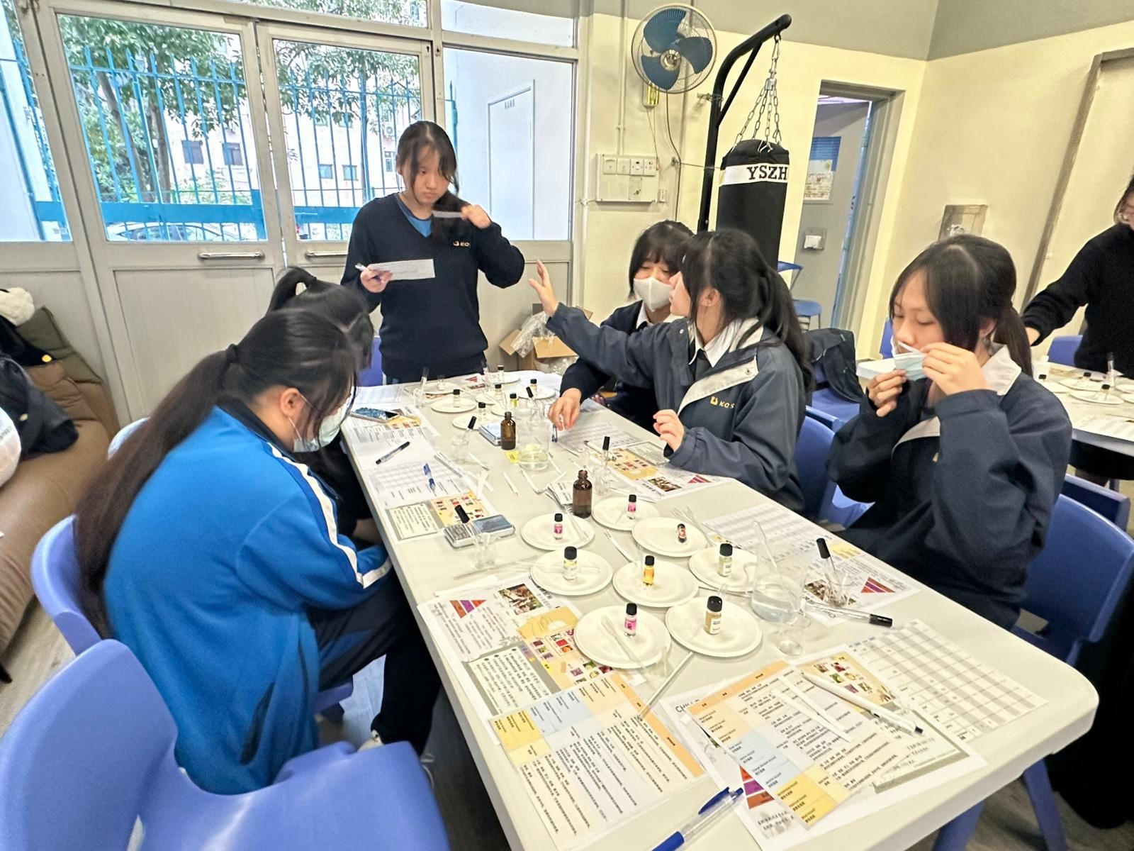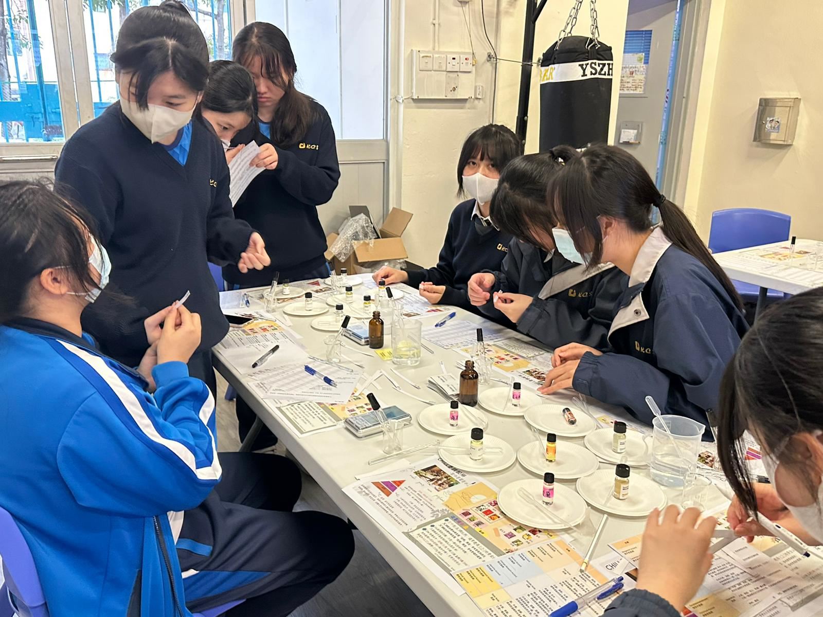 學校社工為學生舉辦「Chill 香調配所」活動,讓學生調香舒壓,認識自己。學生在活動中非常投入參與,過程中能讓大家感受到安靜片刻,尋找自己喜好及舒適的味道。