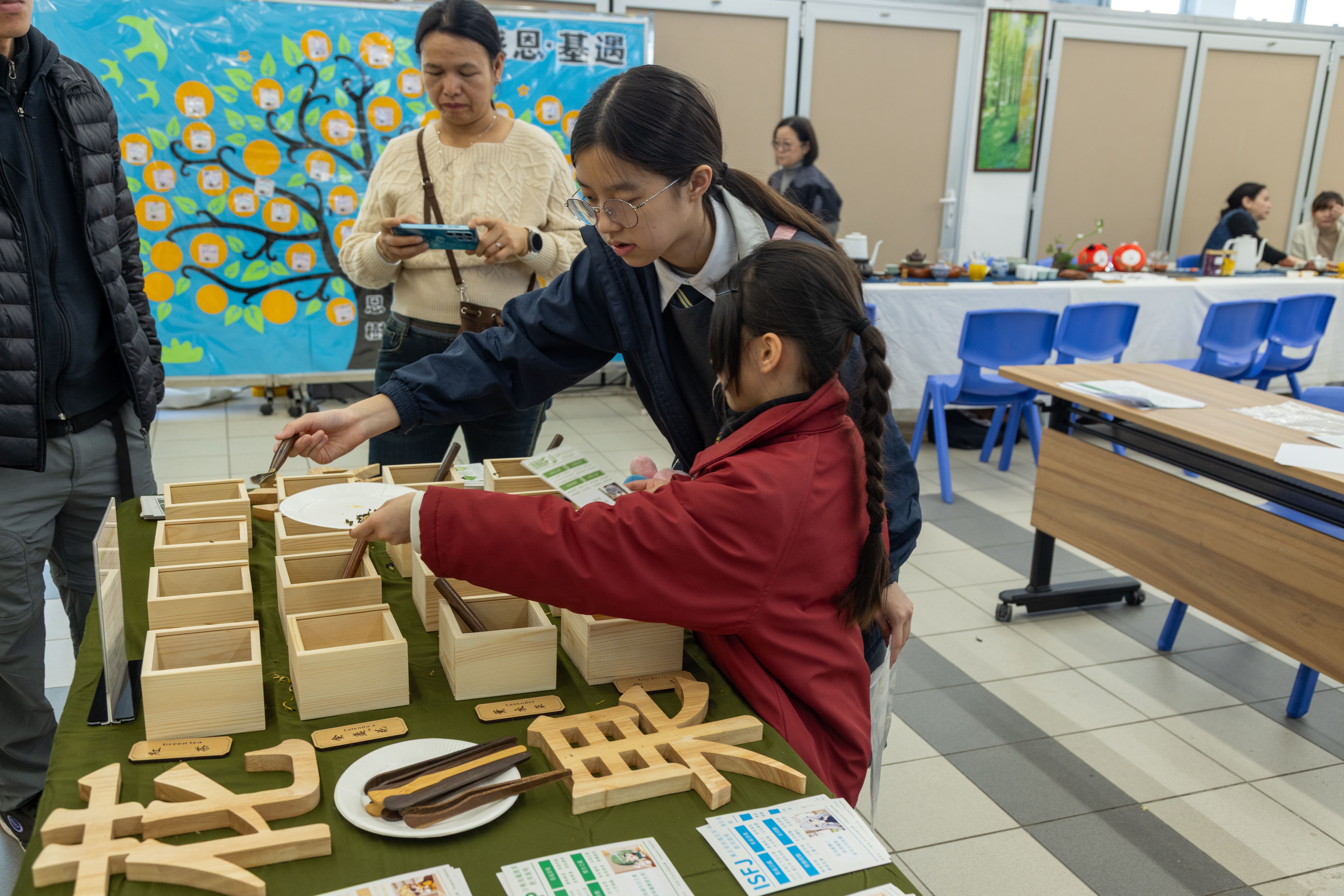 家長教師會於1月9日的家長日,特別舉辦「茶藝工作坊」,設有兩大特色體驗,吸引不少家長及師生參與。其中「MBTI茶包製作」別出心裁,引導參加者按性格特質調配專屬花茶;「茶道及靜觀體驗」則由茶藝師帶領,透過專注品茗結合靜觀練習,讓大家在動靜之間放鬆心靈。活動現場茶香裊裊,參加者藉此舒緩壓力,享受了一段難得的寧靜時光。