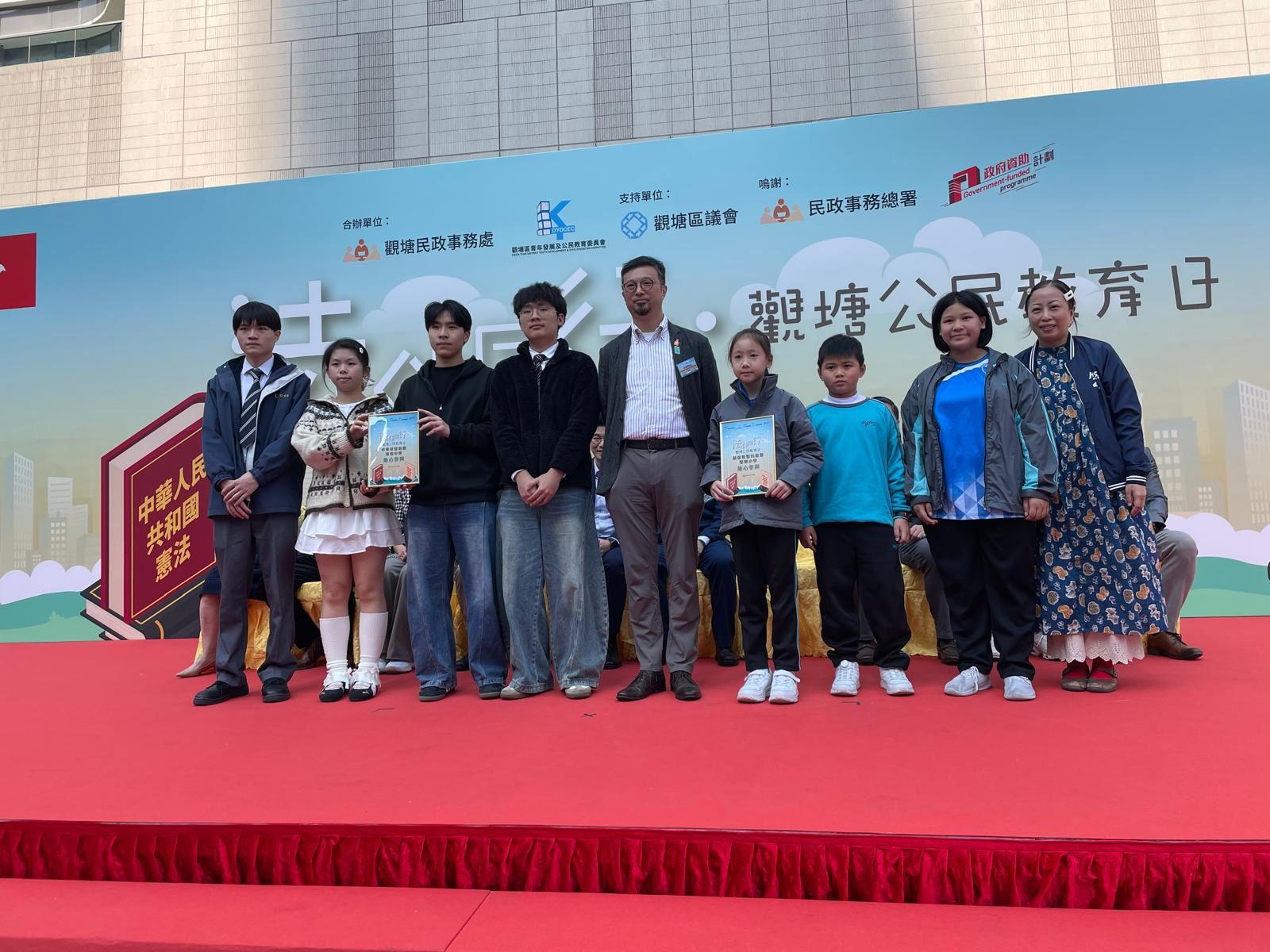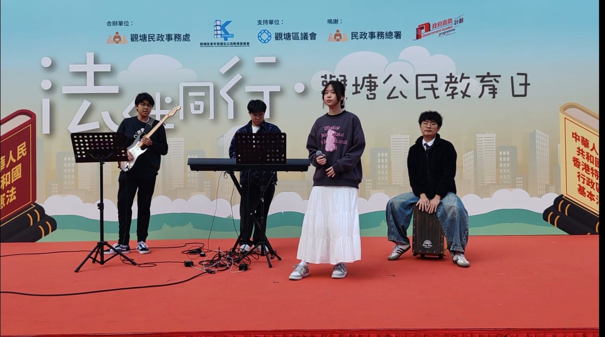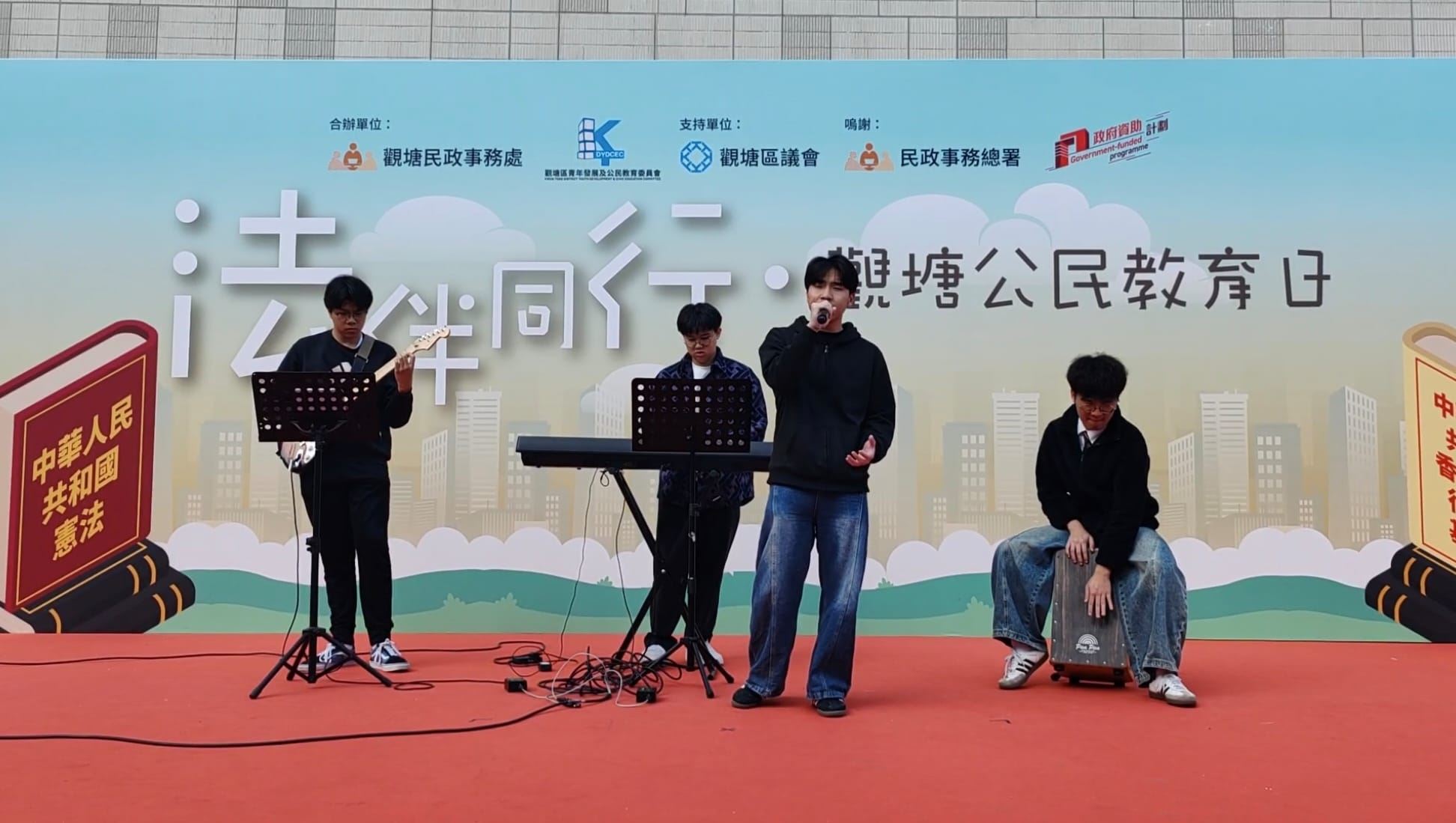本校參與由「觀塘區青年發展及公民教育委員會」主辦的<法伴同行-樂在觀塘>公民教育嘉年華攤位遊戲營運及舞台表演,八位學生透過營運攤位遊戲,向公眾推廣<憲法>及<基本法>,活動提升學生的國民身份認同,及獲取參與社會服務的經驗。另九位出演的學生除了以音樂及舞蹈將歡樂帶給社區人士,亦能發揮及展示自己的才能,獲益良多。