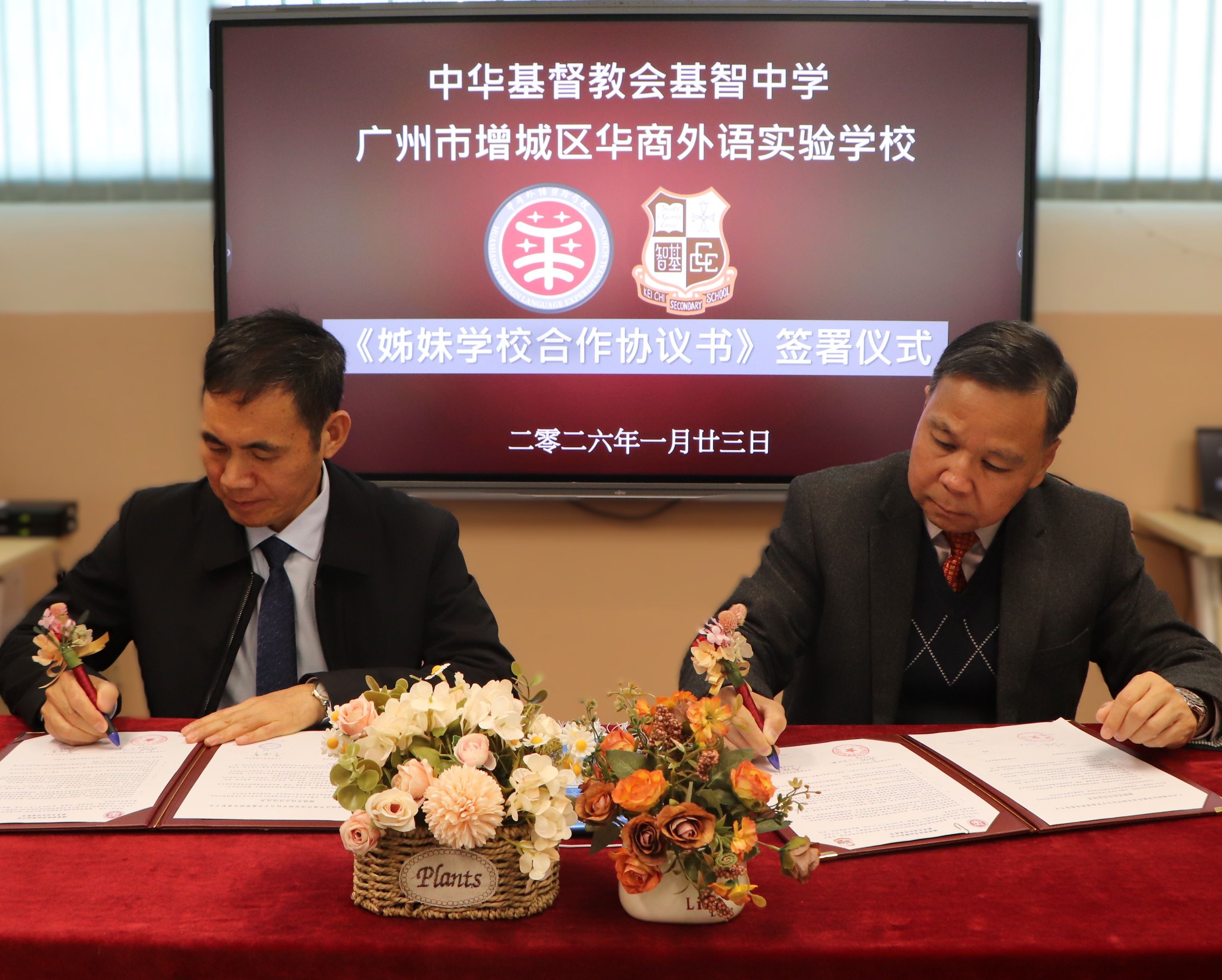 二零二六年一月二十三日,我校與廣州市增城區華商外語實驗學校簽署《姊妹學校合作協議書》,在雙方代表的共同見證下,兩校正式締結為姊妹學校。簽署儀式後,雙方管理團隊隨即召開工作會議,就未來師生互訪、教研協作及文化交流等多項合作進行了探討。此次締約,不僅為兩校師生拓展了寶貴的學習與交流平台,更是粵港教育深度融合的具體實踐。